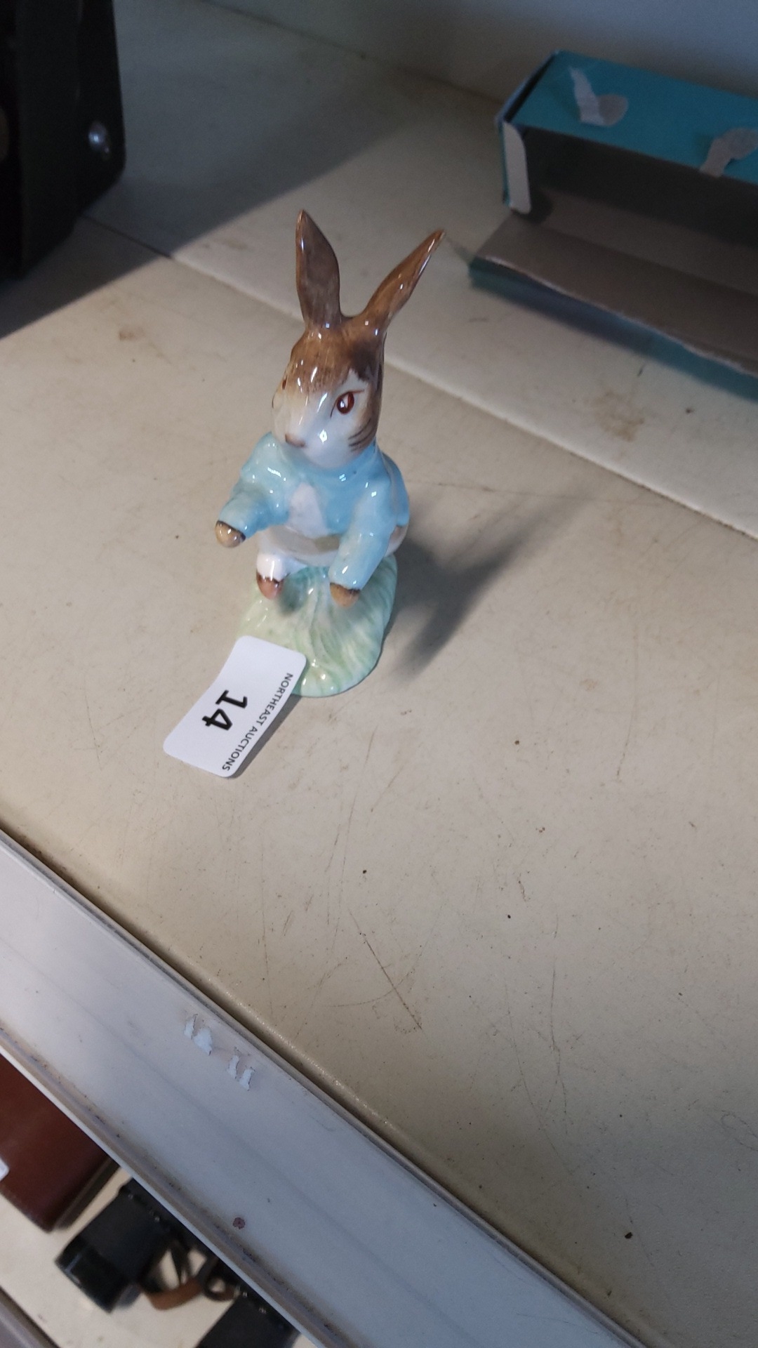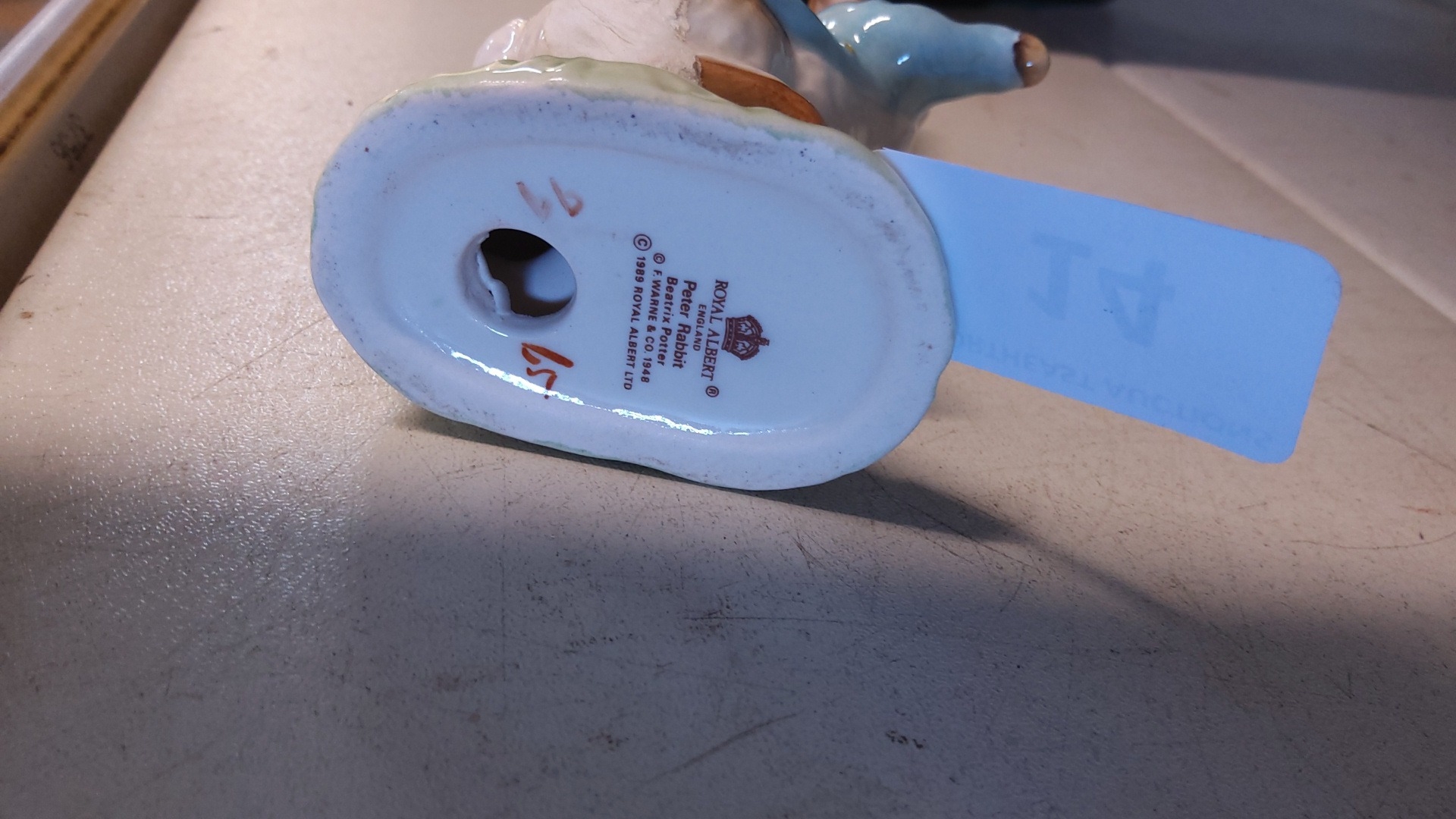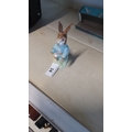 A Royal Albert porcelain figure of Peter Rabbit, modelled standing and dressed in a blue jacket, on an oval grassy base; printed factory marks and copyright date 1989 beneath.