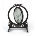 Chinese porcelain rotating table screen, housed in a hardwood frame, on a pierced stand, the porcelain panel hand painted with a cricket on leaves with flowers, script and red seal mark, the panel 18.5cm in diameter overall 35.5cm high
