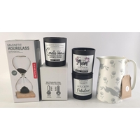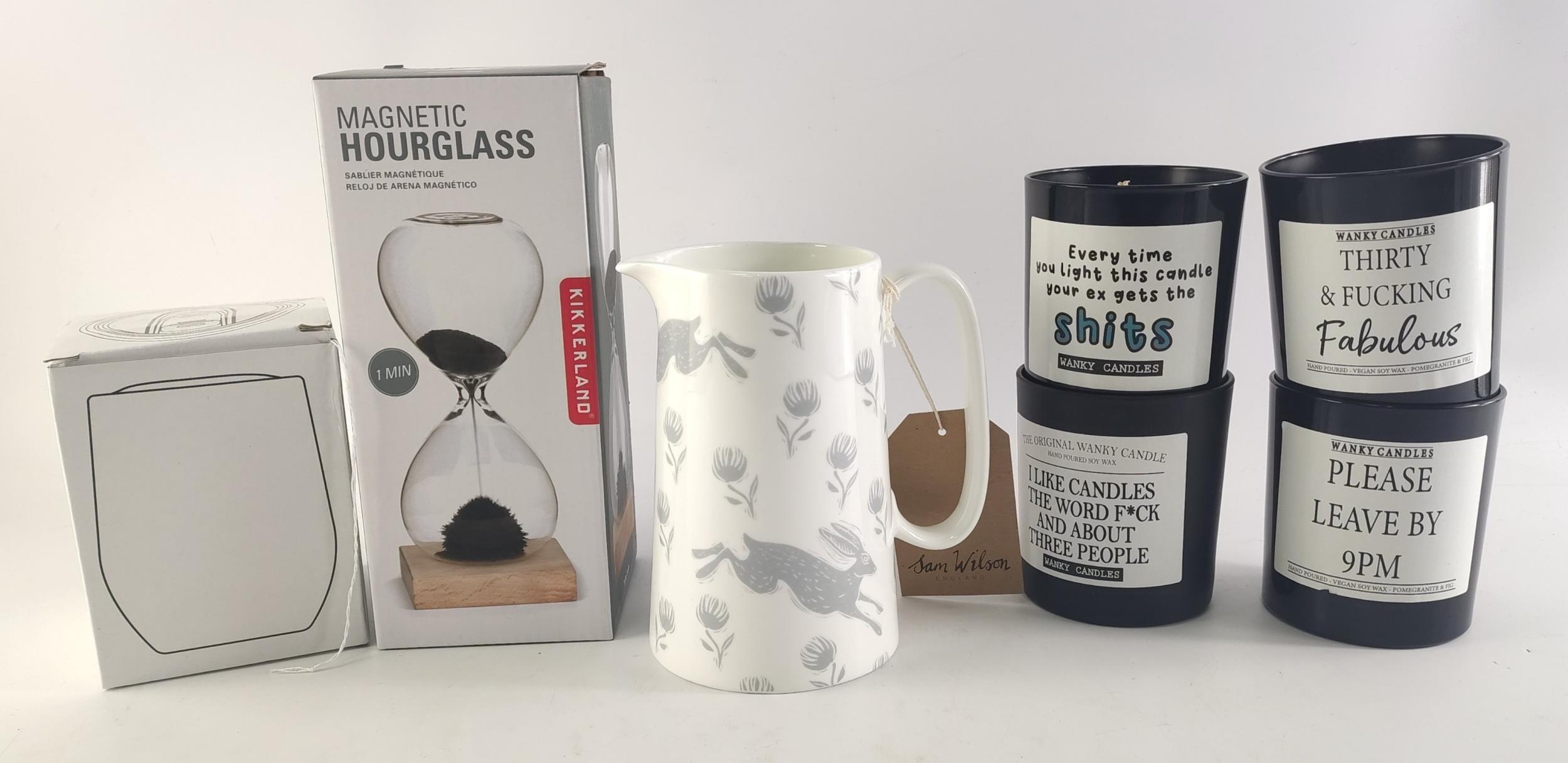 XMAS GIFTING IDEAS! A KIKKERLAND magnetic 1 minute hourglass plus a March hare jug, a thermal tumbler and 4 novelty candles.