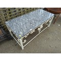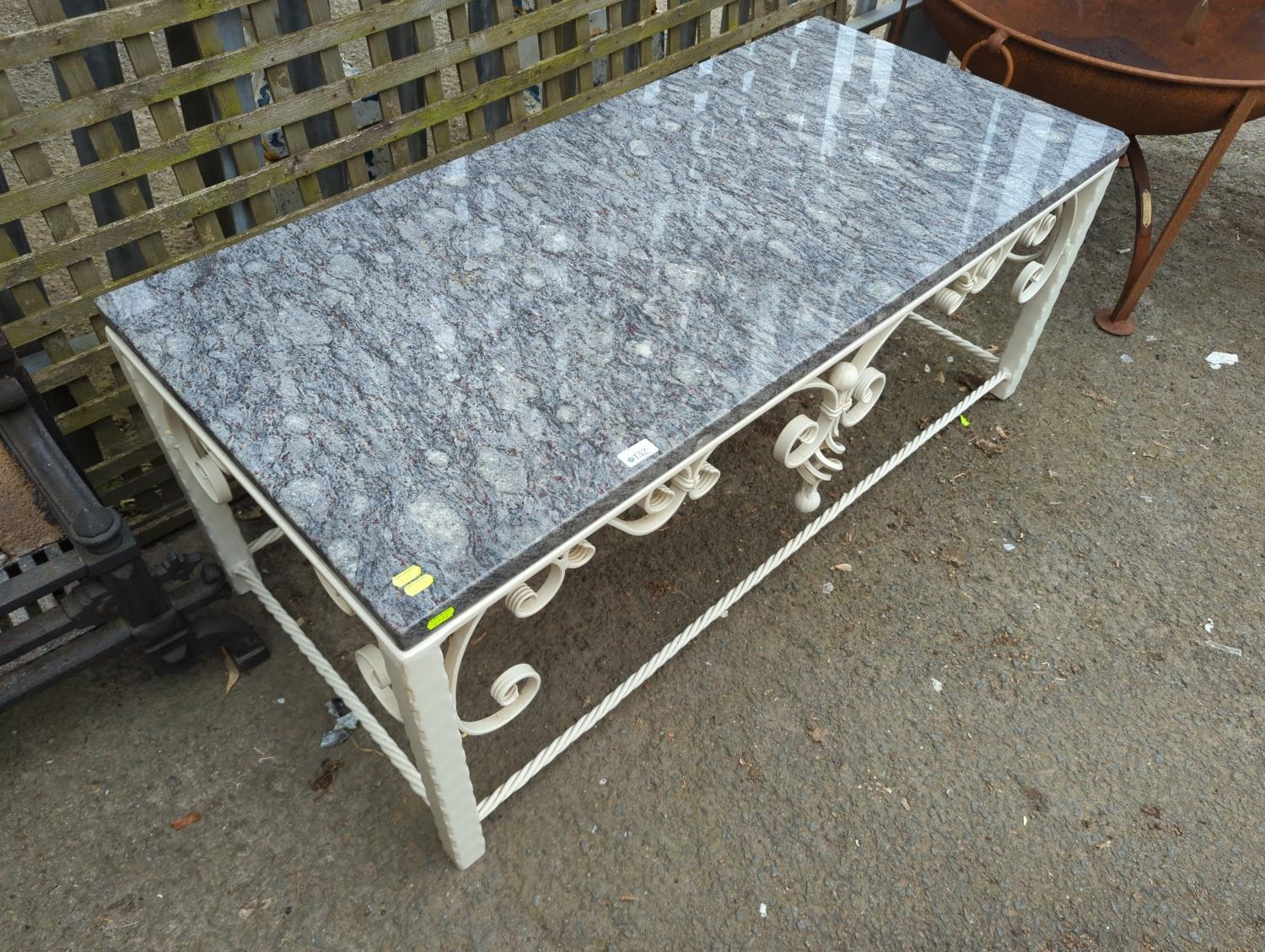 Wrought iron garden table with polished granite top. W128cm D59cm H50cm.