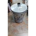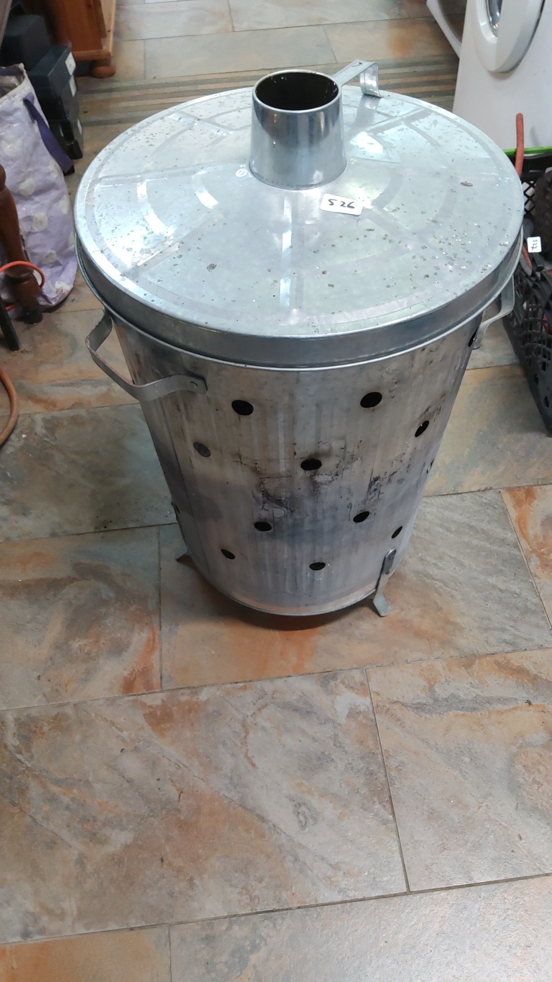 Galvanised metal incinerator bin with domed lid and central flue, the cylindrical body pierced with draft holes; fitted with twin side handles and raised on three strap feet.