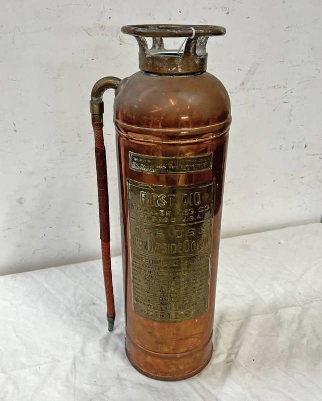 VINTAGE COPPER & BRASS FIRE EXTINGUISHER BY ALLEN MFG CO. CHICAGO USA, 61CM TALL