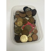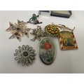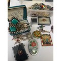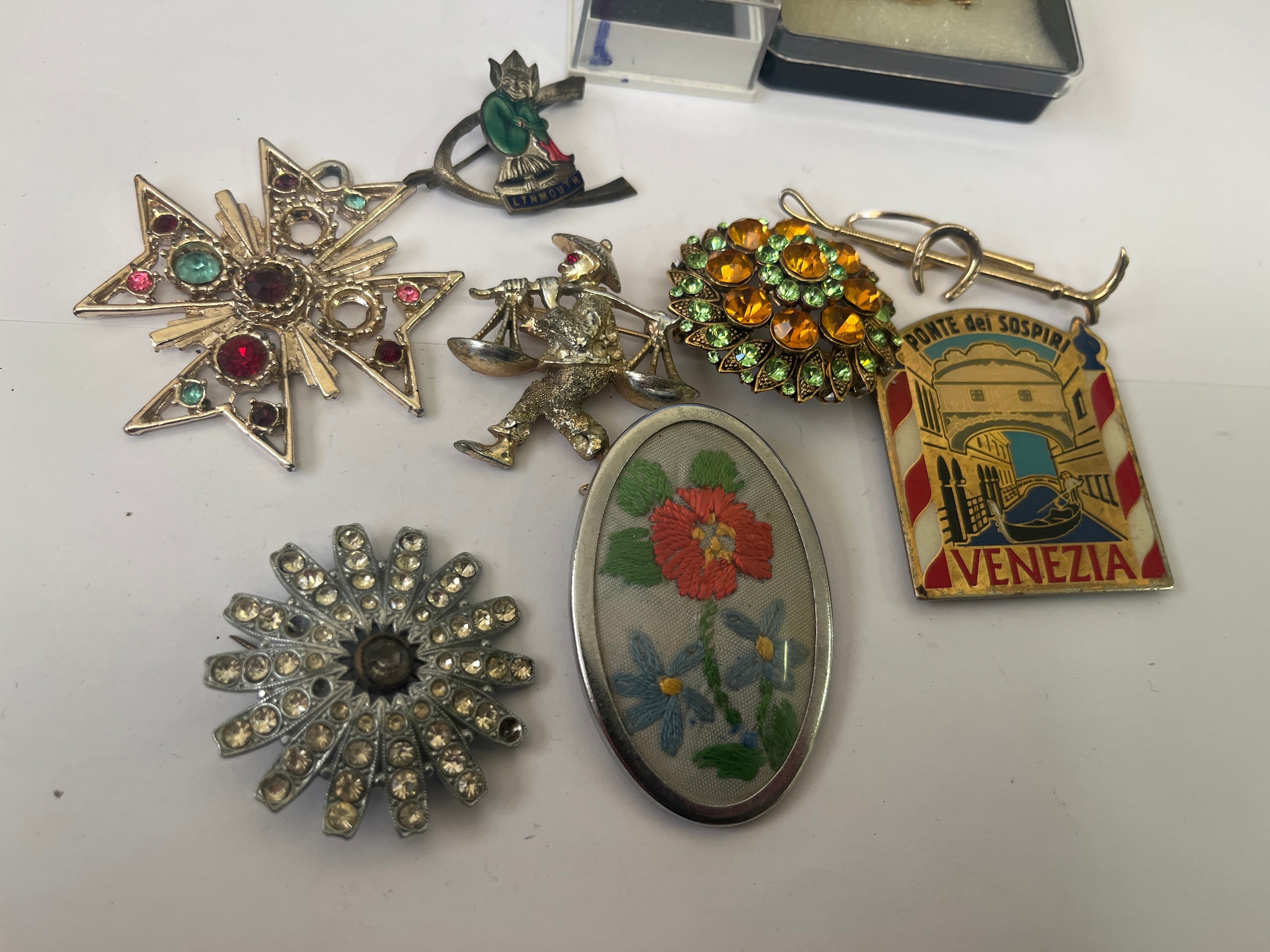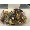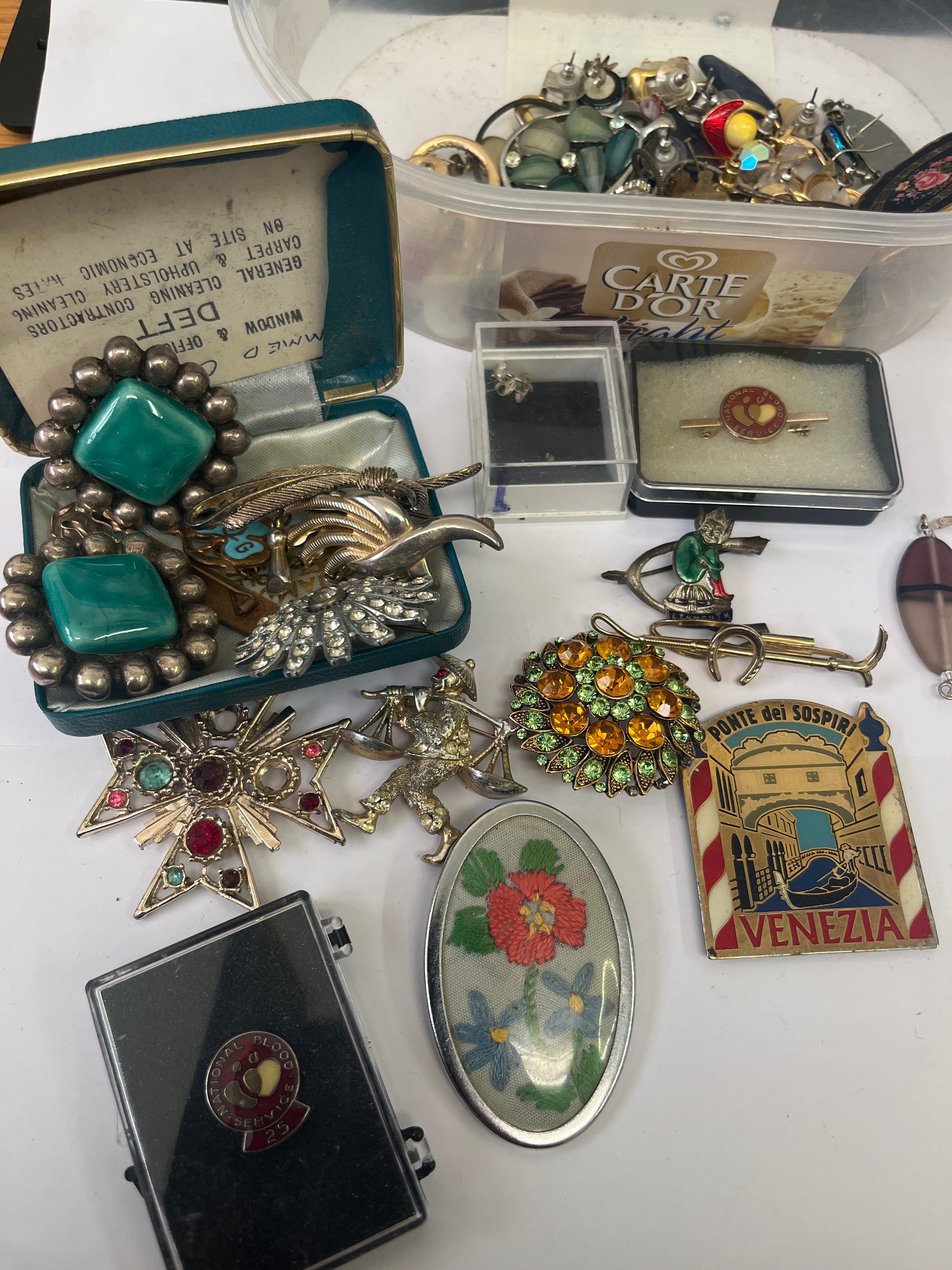 a tub of brooches, badges and earrings