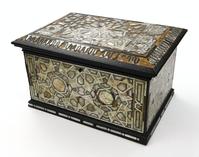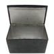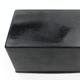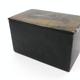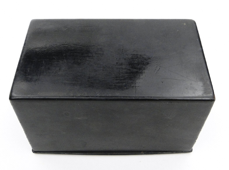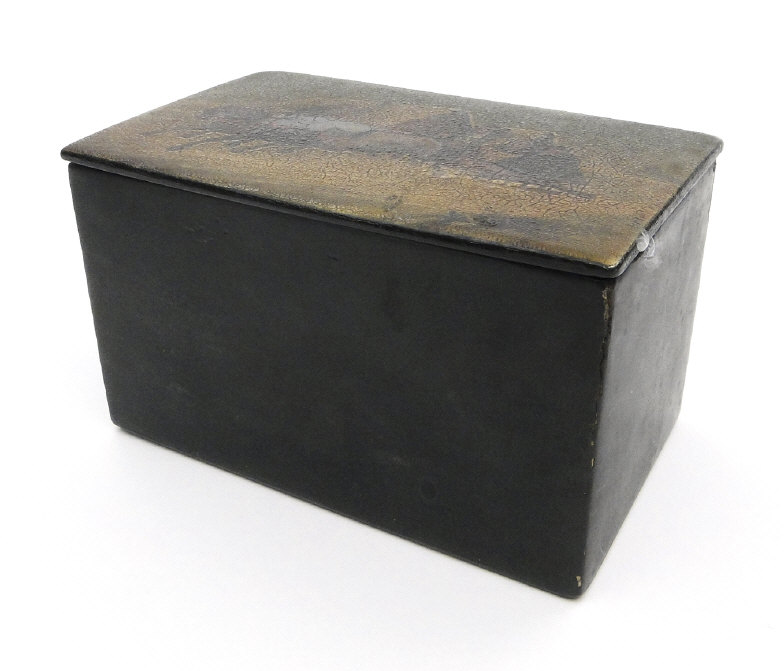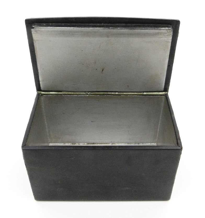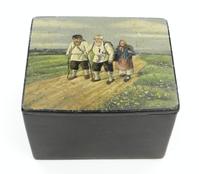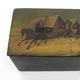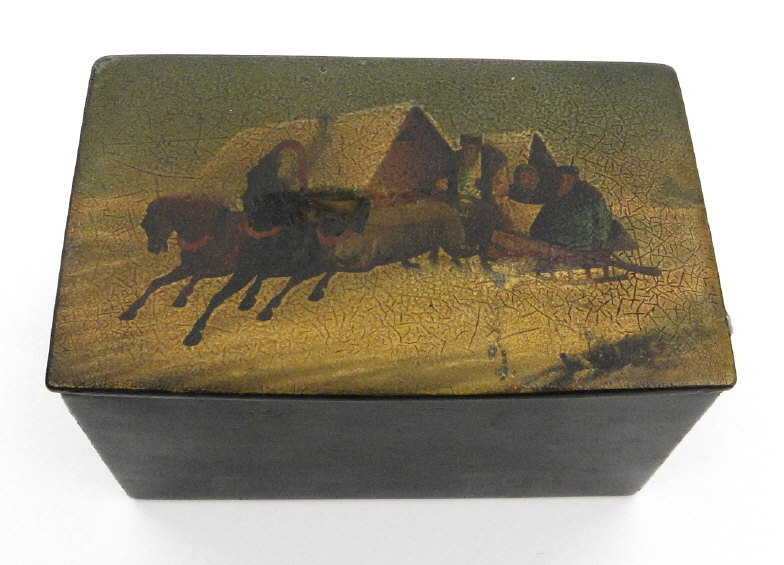 Russian black lacquered papier maché tea caddy, the lid hand painted with a view of a troika, the interior with silver foil lining, 16cm in length