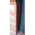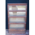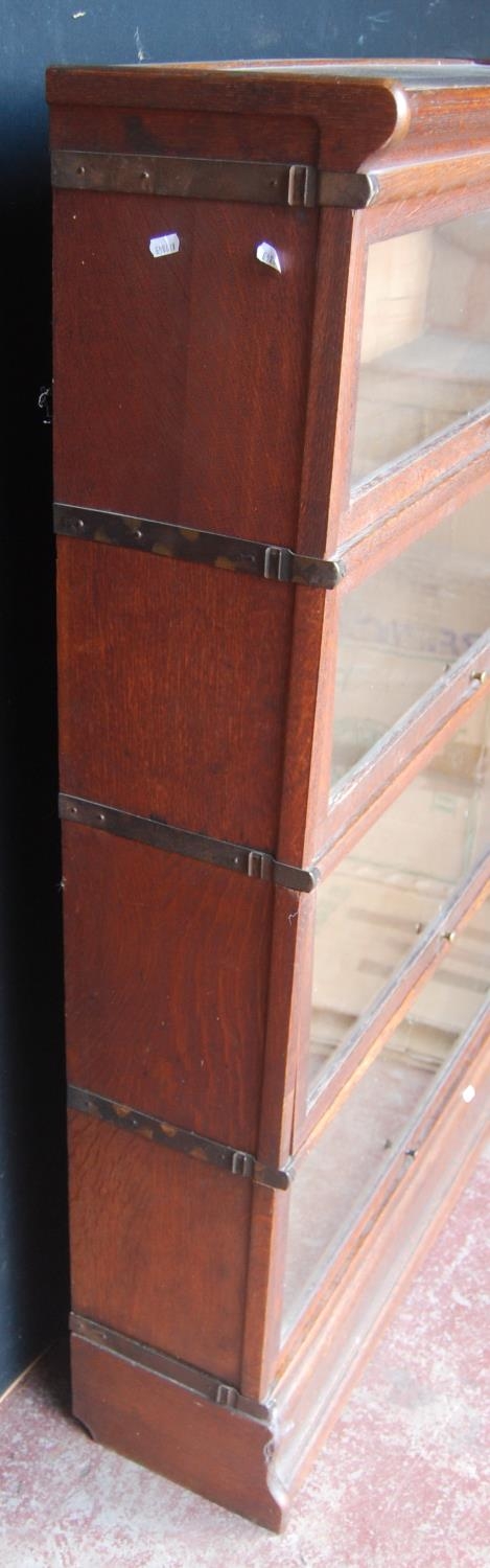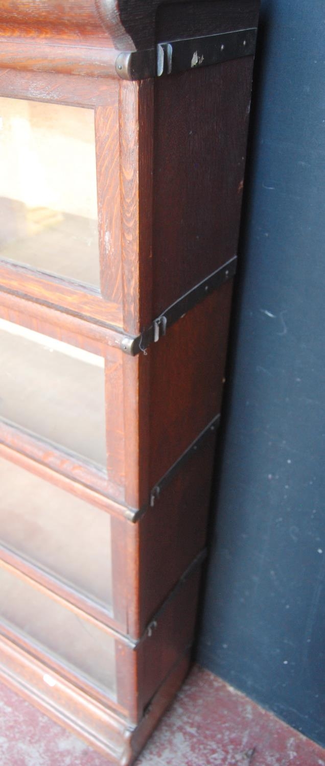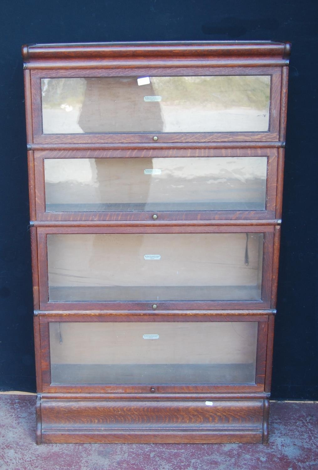 Globe Wernicke oak stacking bookcase, with four glazed sections, on base, with label to each section 'The Globe Wernicke Co Ltd, Office & Library Furnishers, London', 145.5cm high, 87cm wide and 27cm deep.