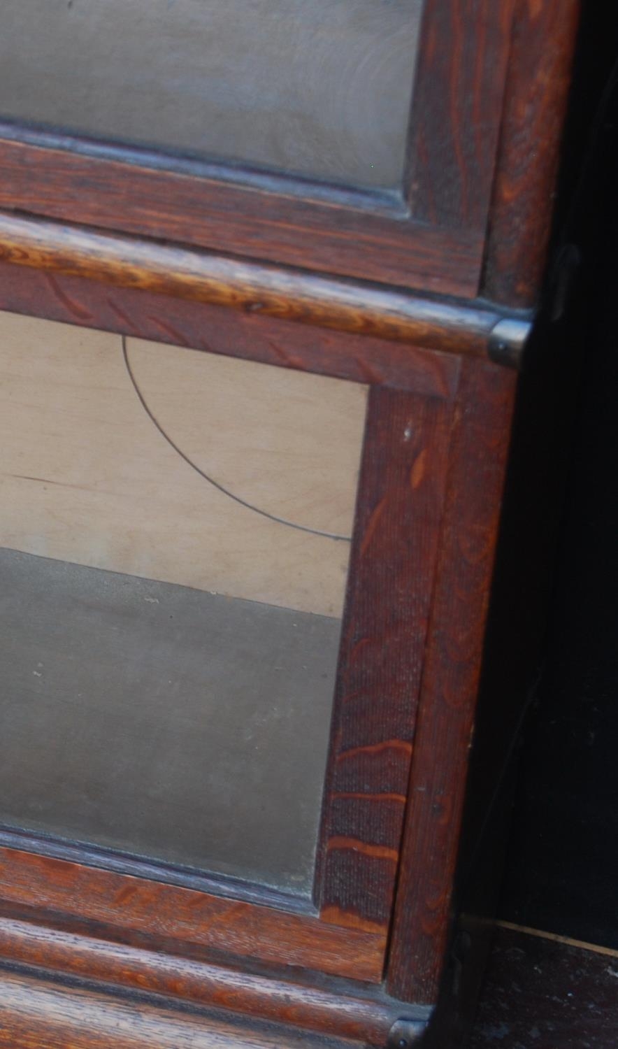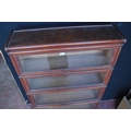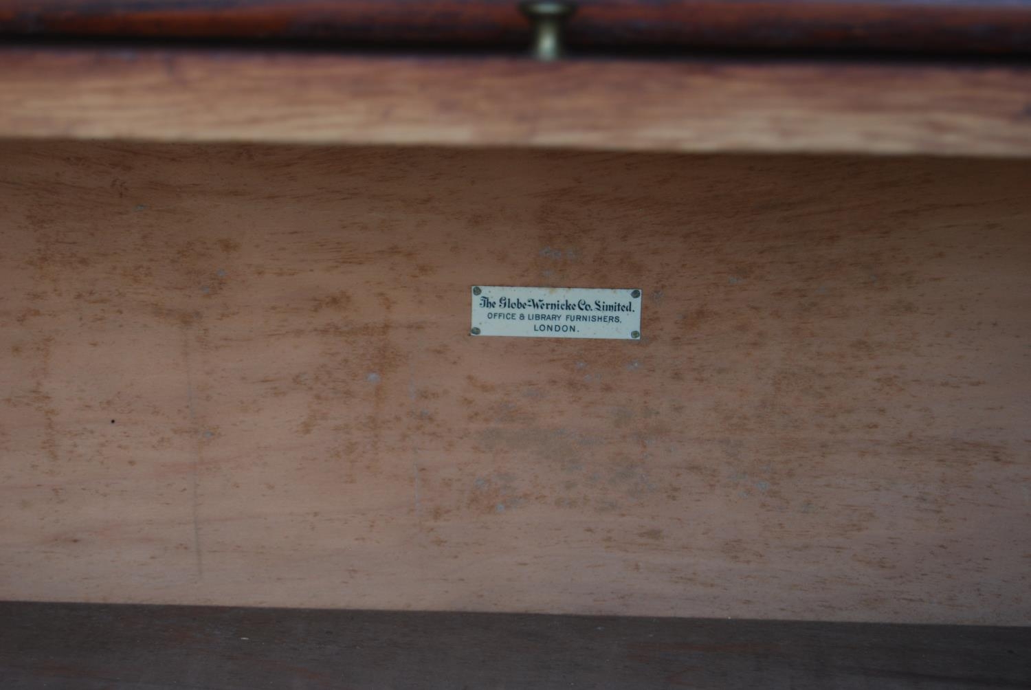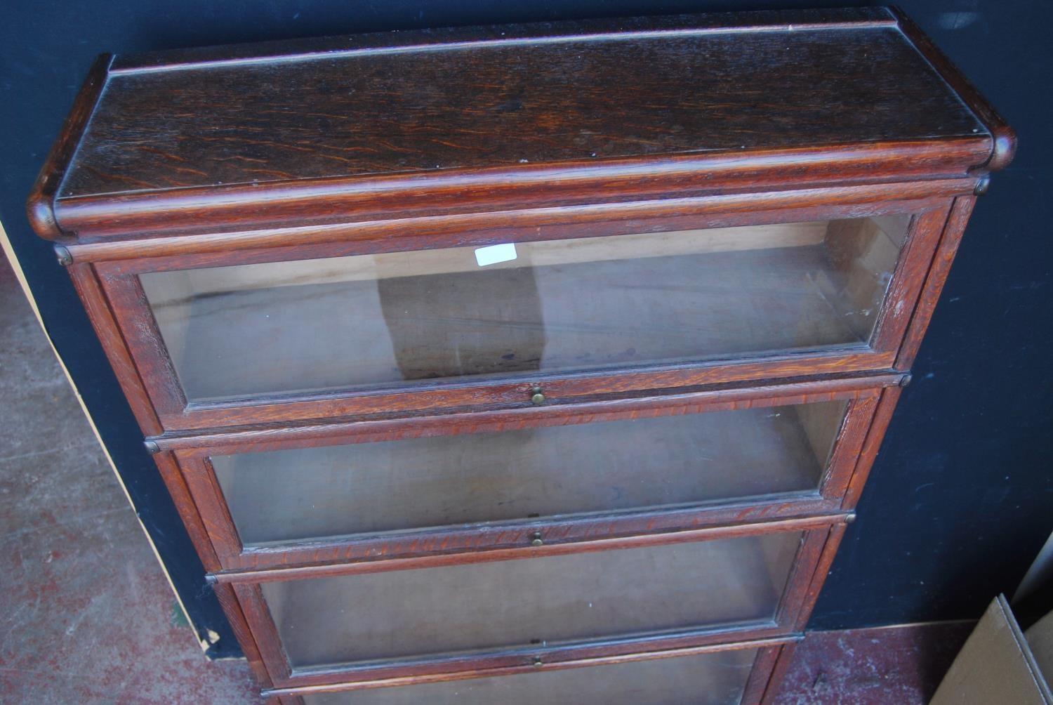 Globe Wernicke oak stacking bookcase, with four glazed sections, on base, with label to each section 'The Globe Wernicke Co Ltd, Office & Library Furnishers, London', 145.5cm high, 87cm wide and 27cm deep.