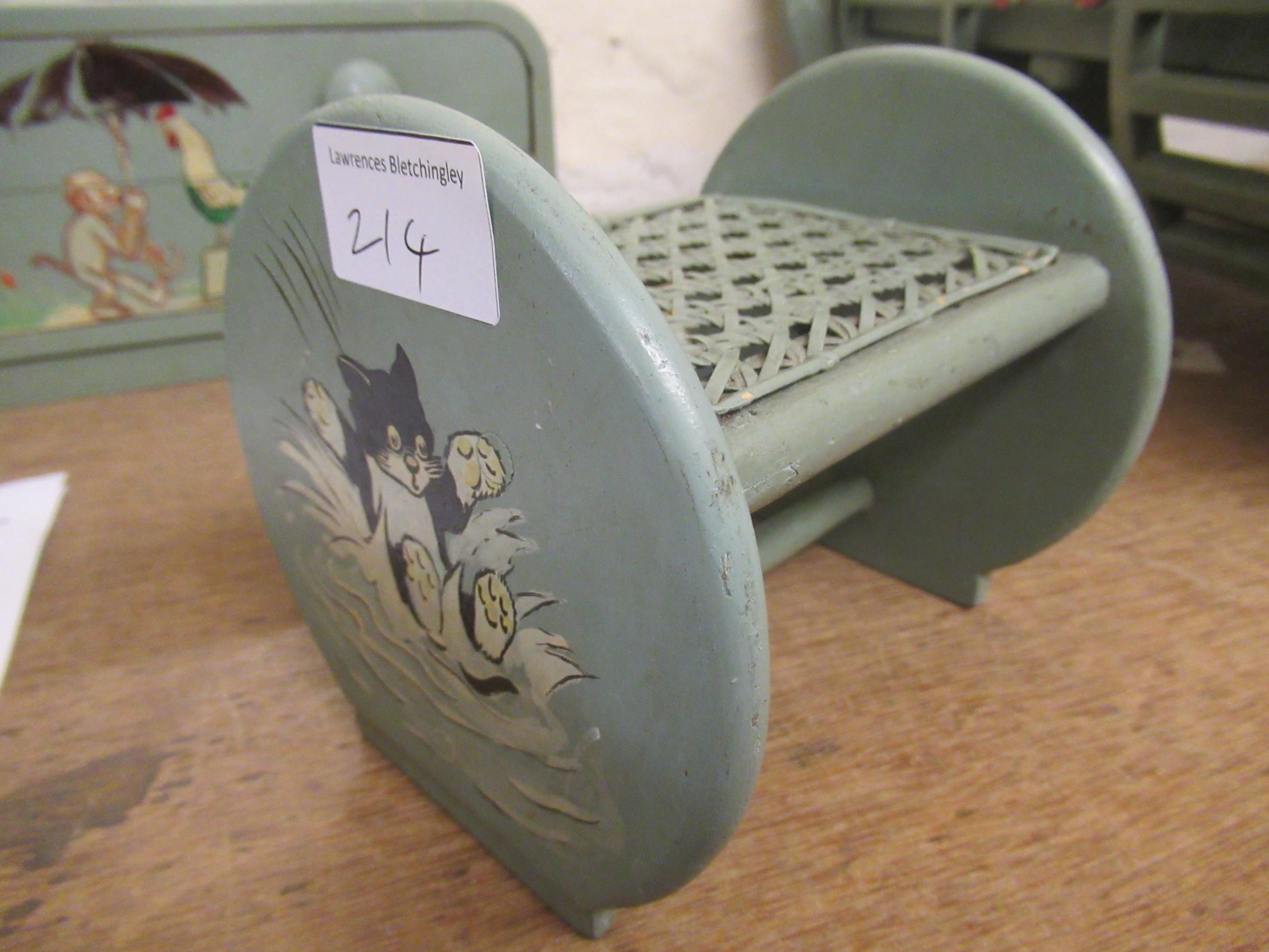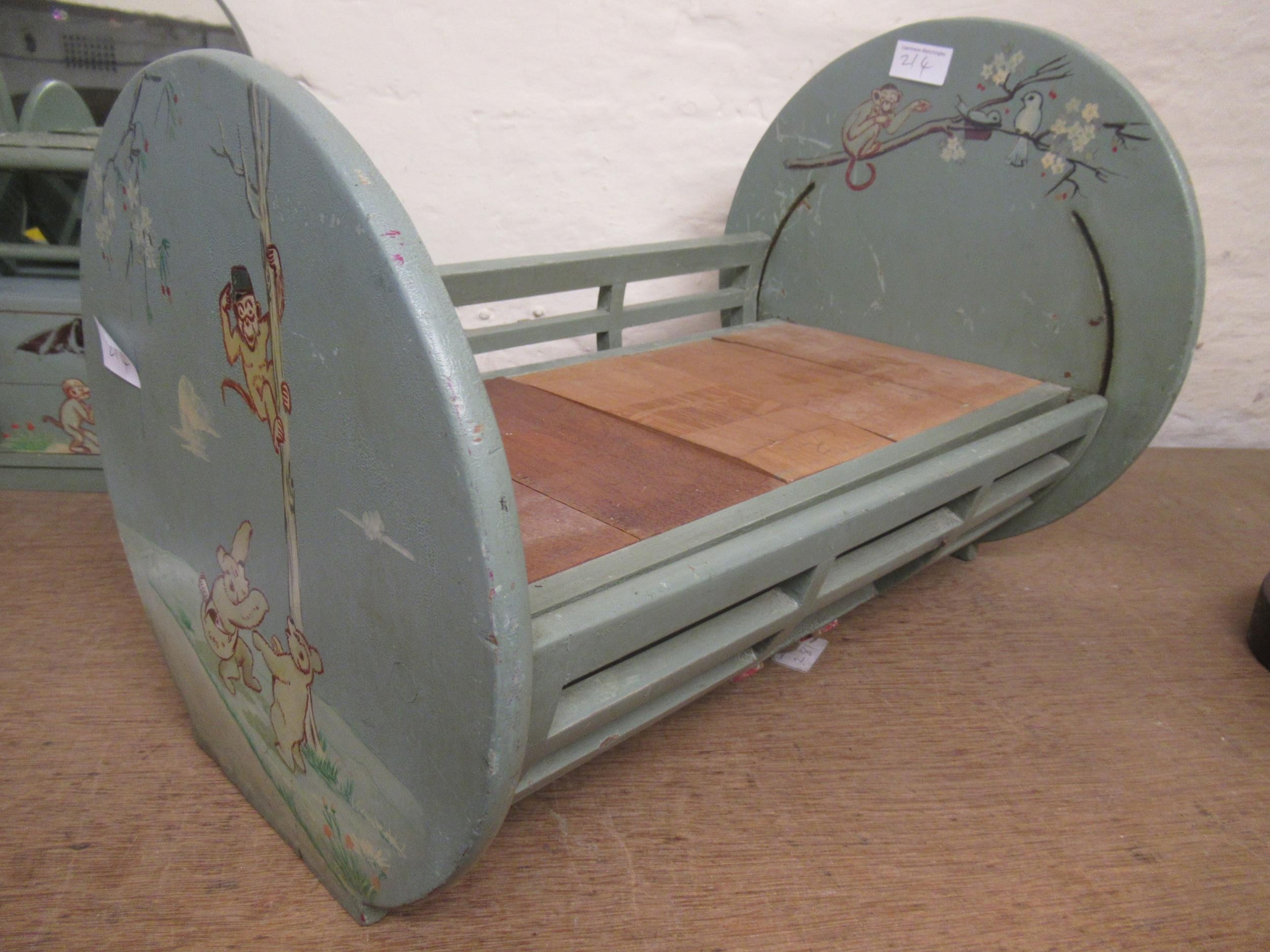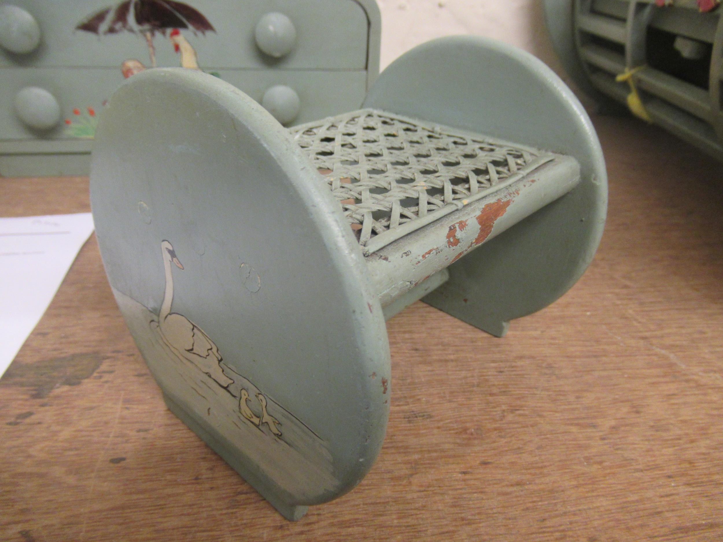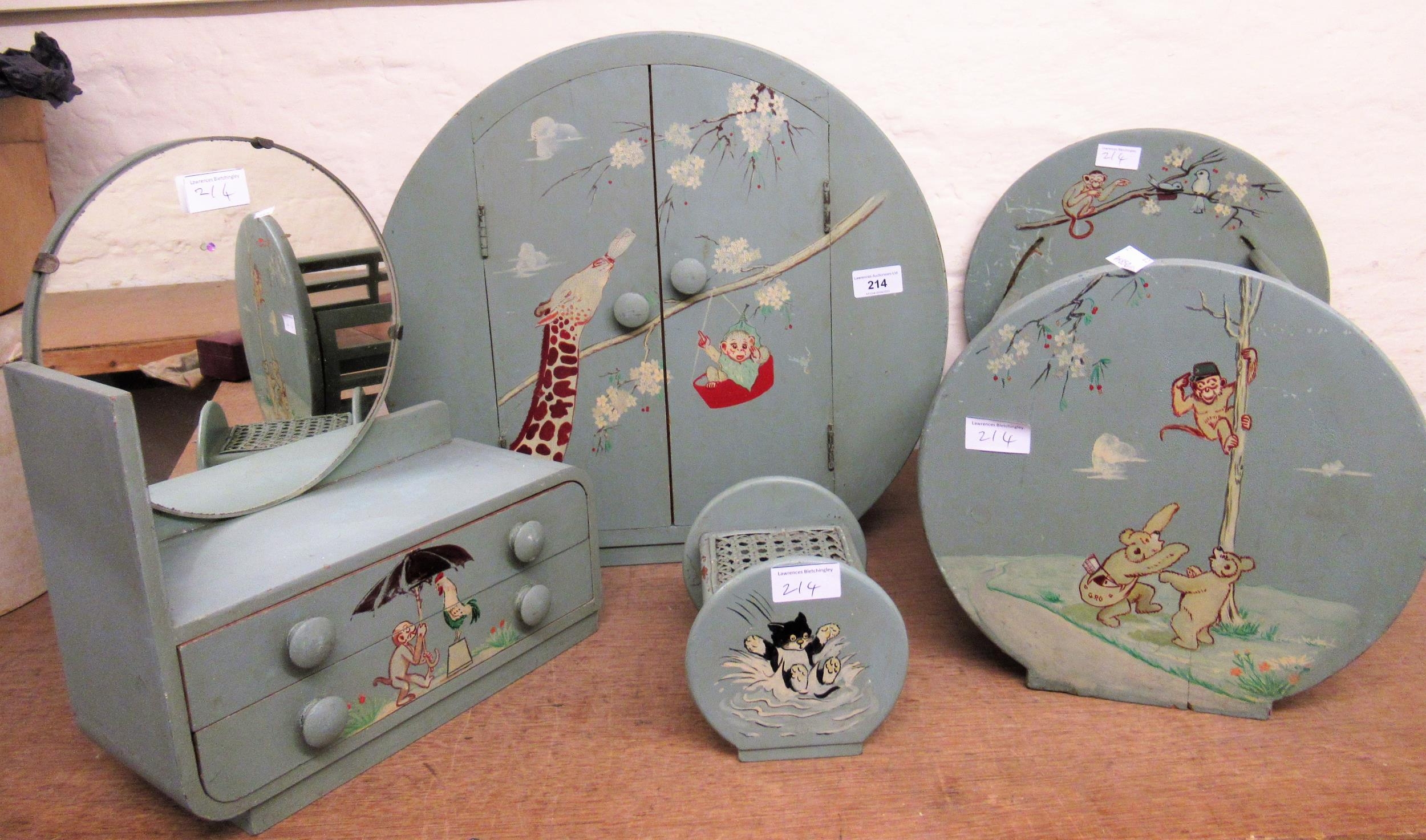 1930's Blue painted wooden dolls house bedroom suite comprising : wardrobe, dressing table with stool and bed, each with animal decoration