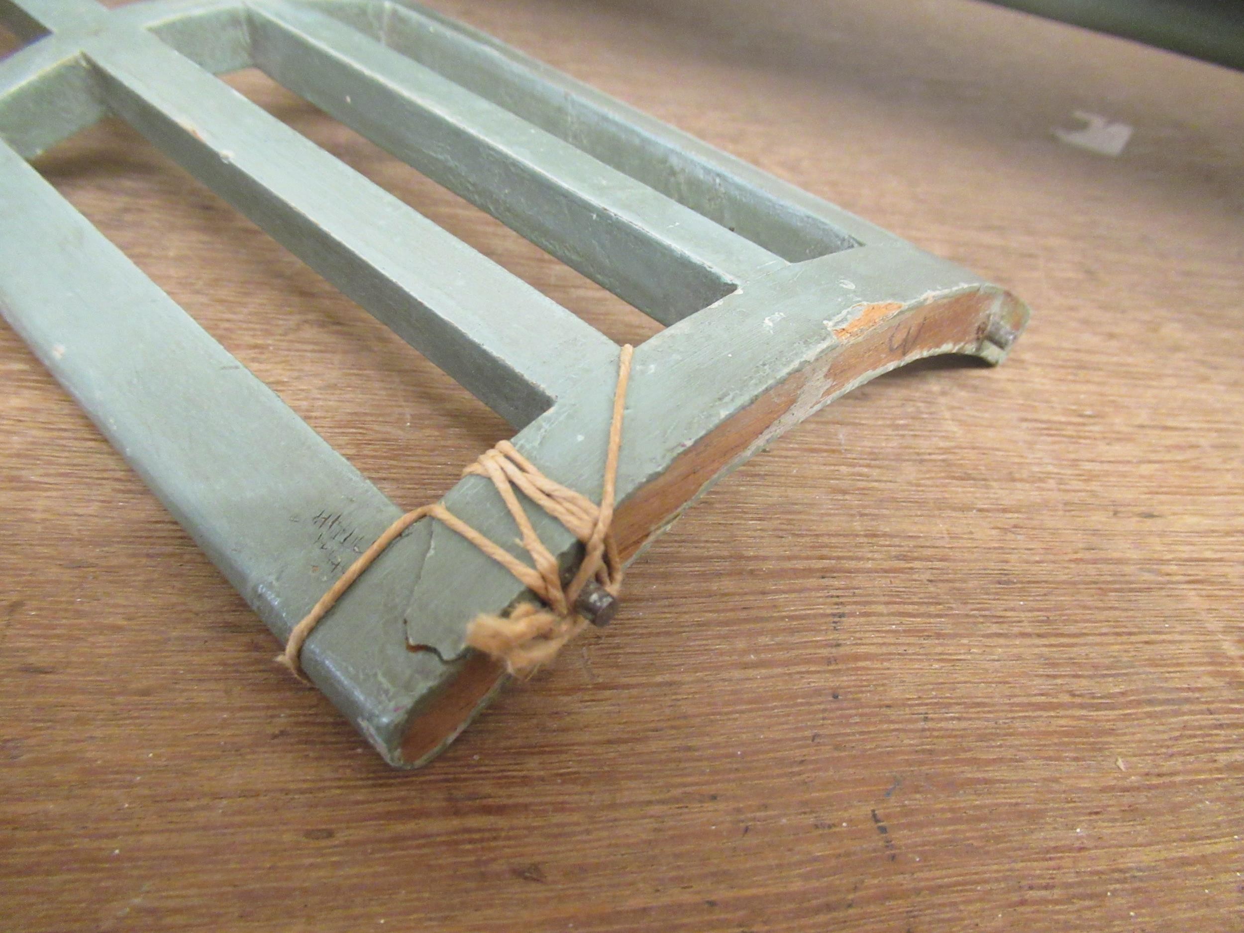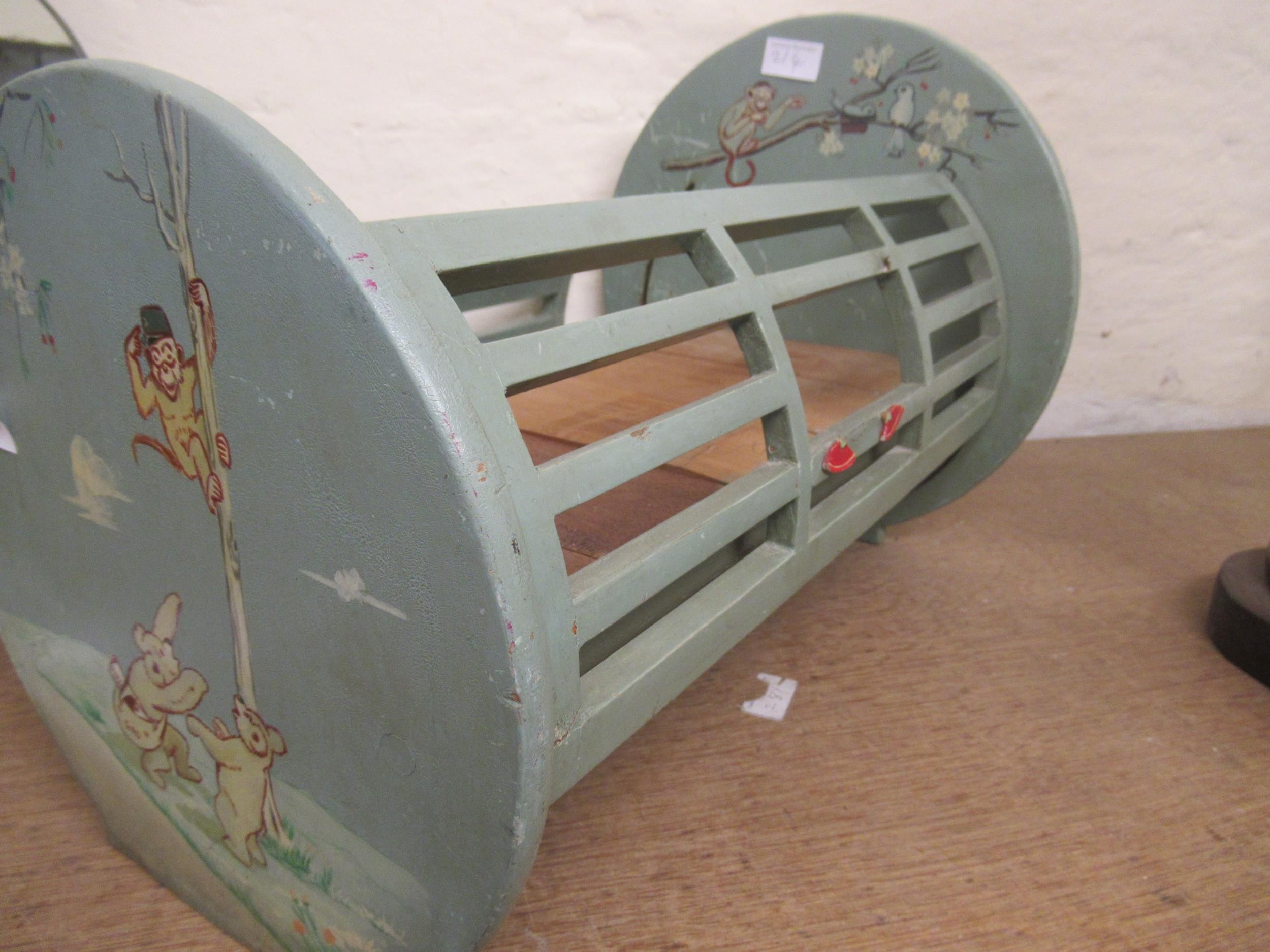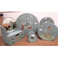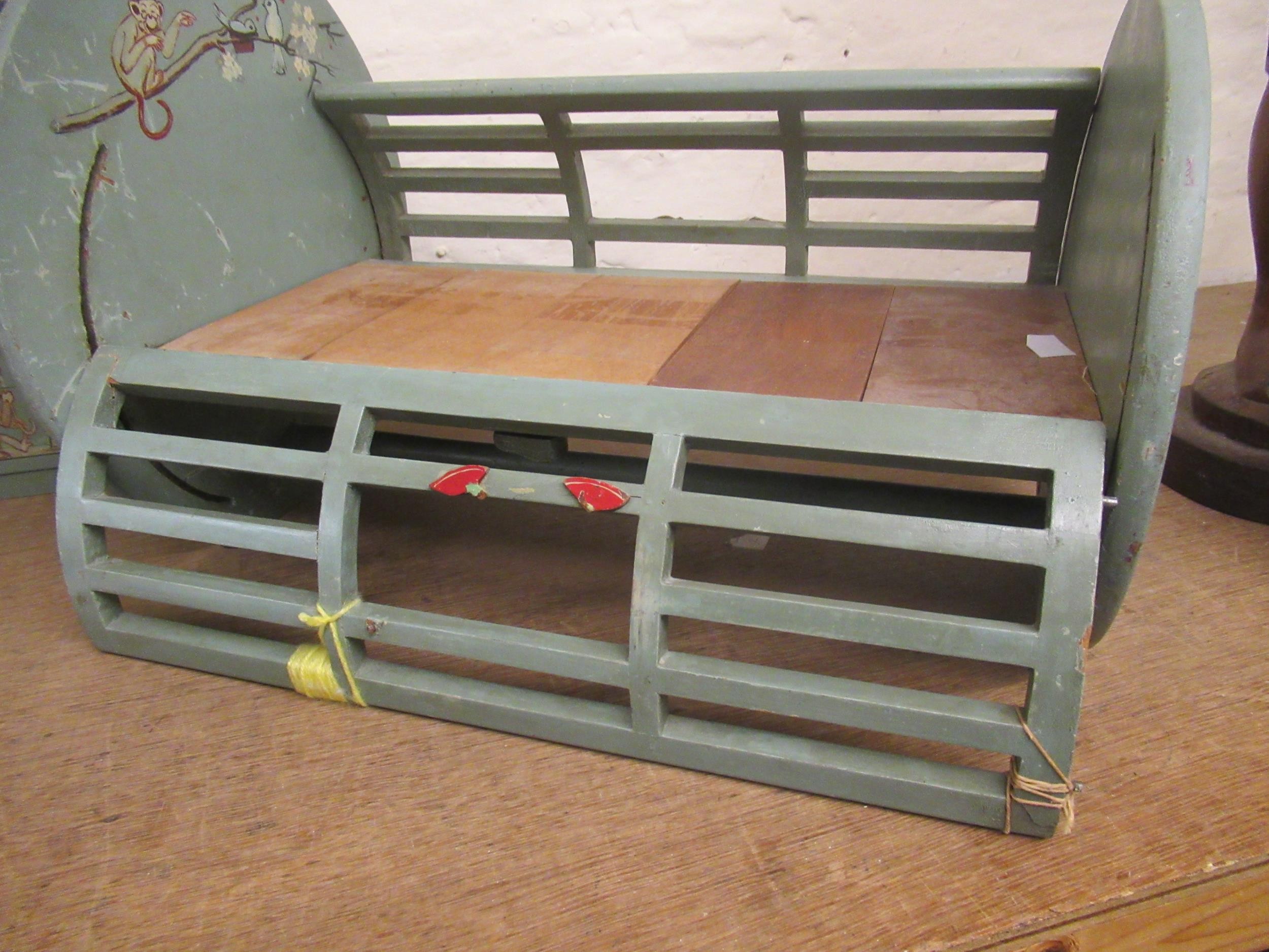1930's Blue painted wooden dolls house bedroom suite comprising : wardrobe, dressing table with stool and bed, each with animal decoration