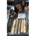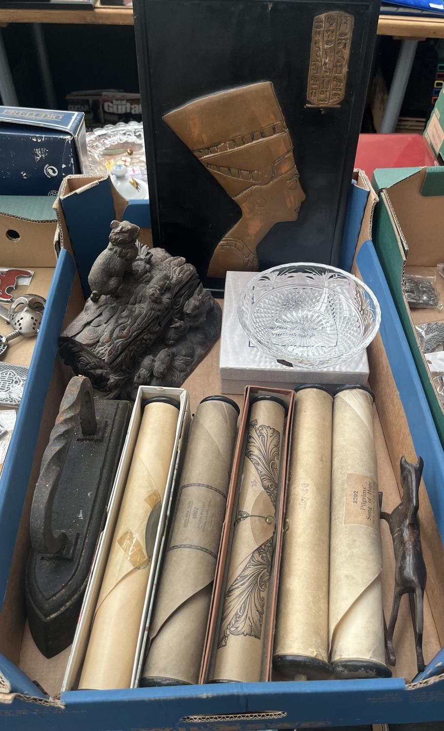 Box containing piano scrolls, Stuart crystal bowl, and an antique cast iron by J&J Siddon