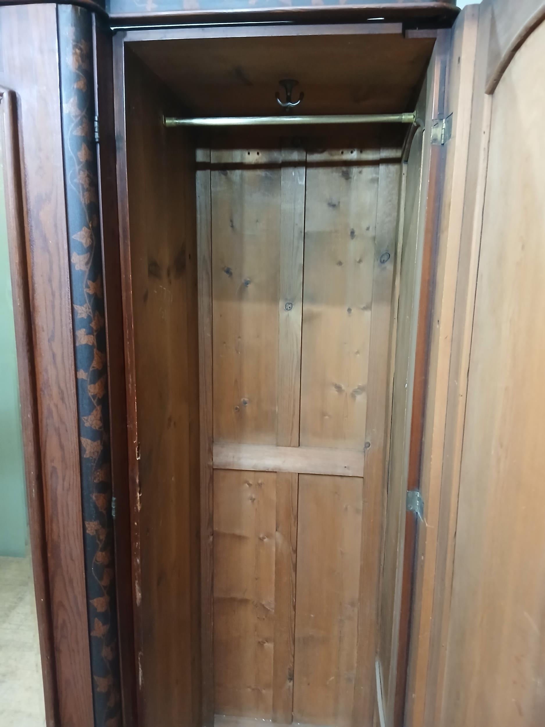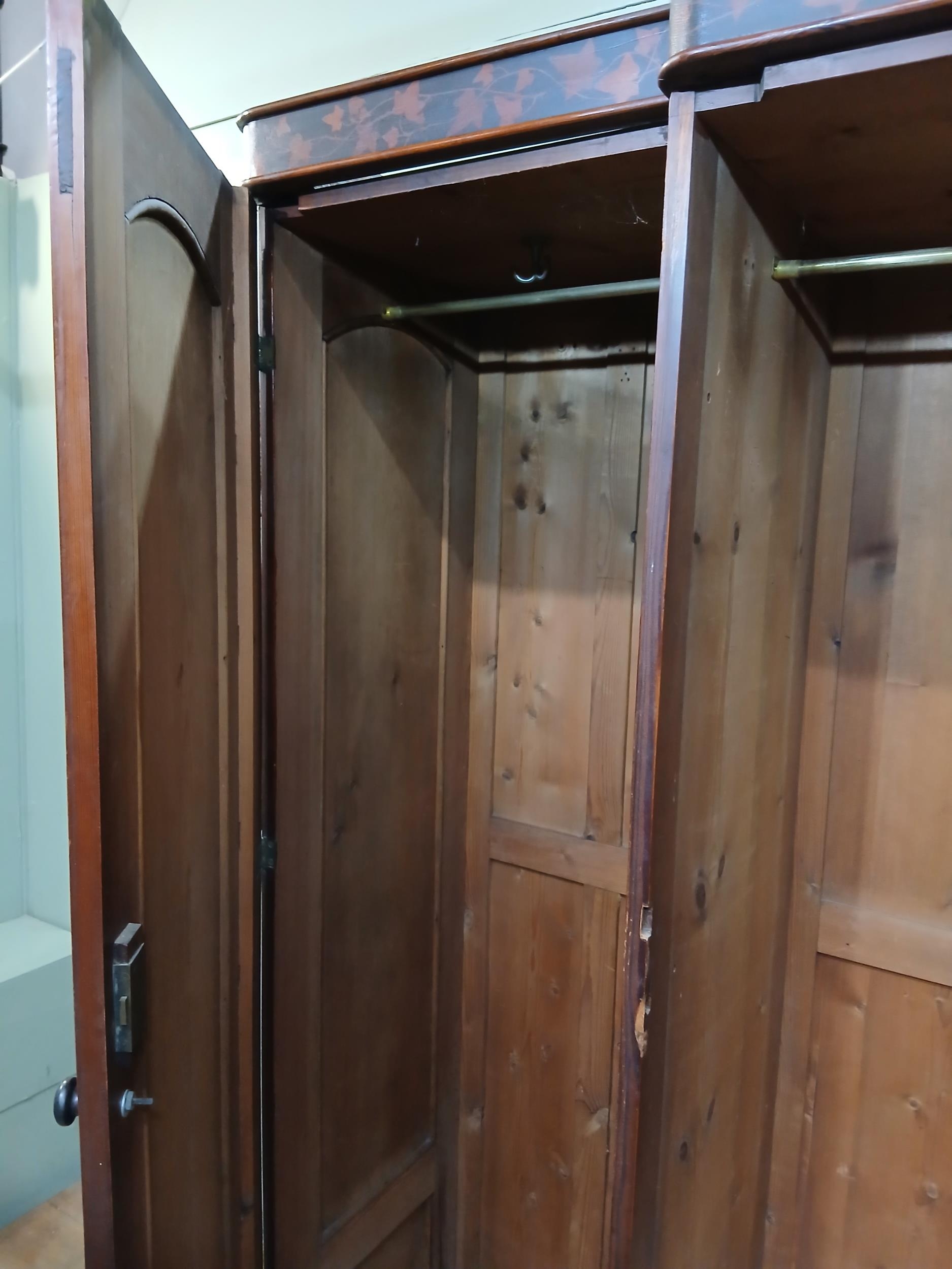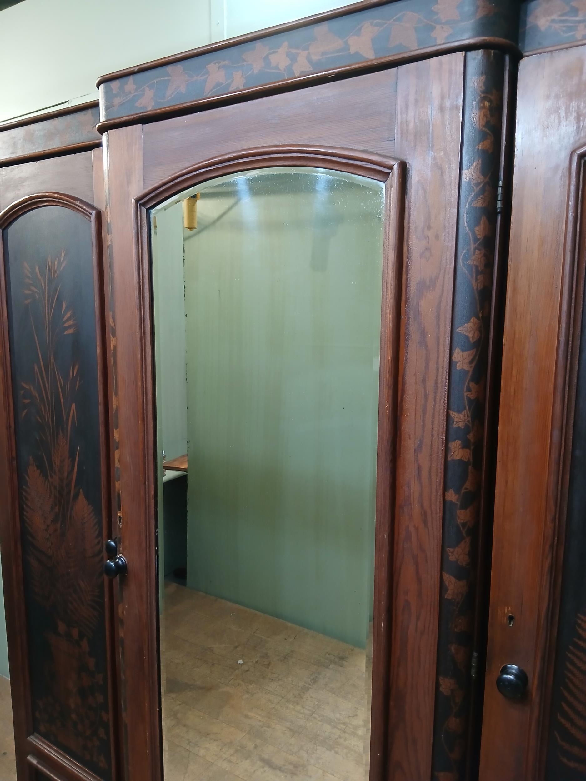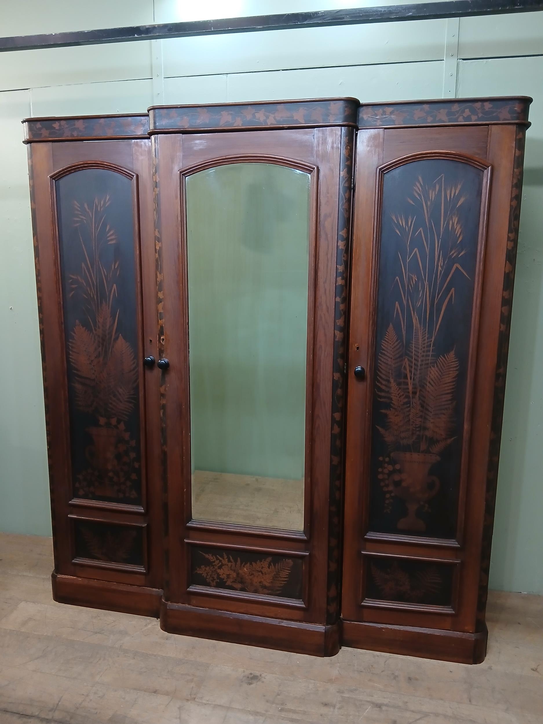 Irish George III style triple fern ware wardrobe flanked by two doors with internal brass clothes rail central panel with dome toppped mirror and drawer to base. {H 205cm x W 187cm x D 61cm }. NOT AVAILABLE TO VIEW IN PERSON.