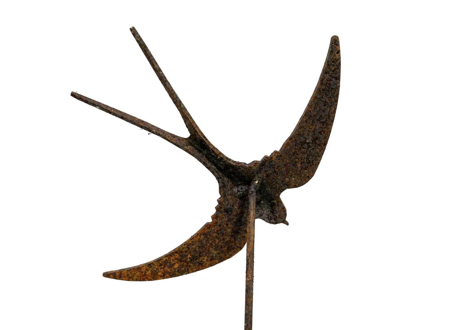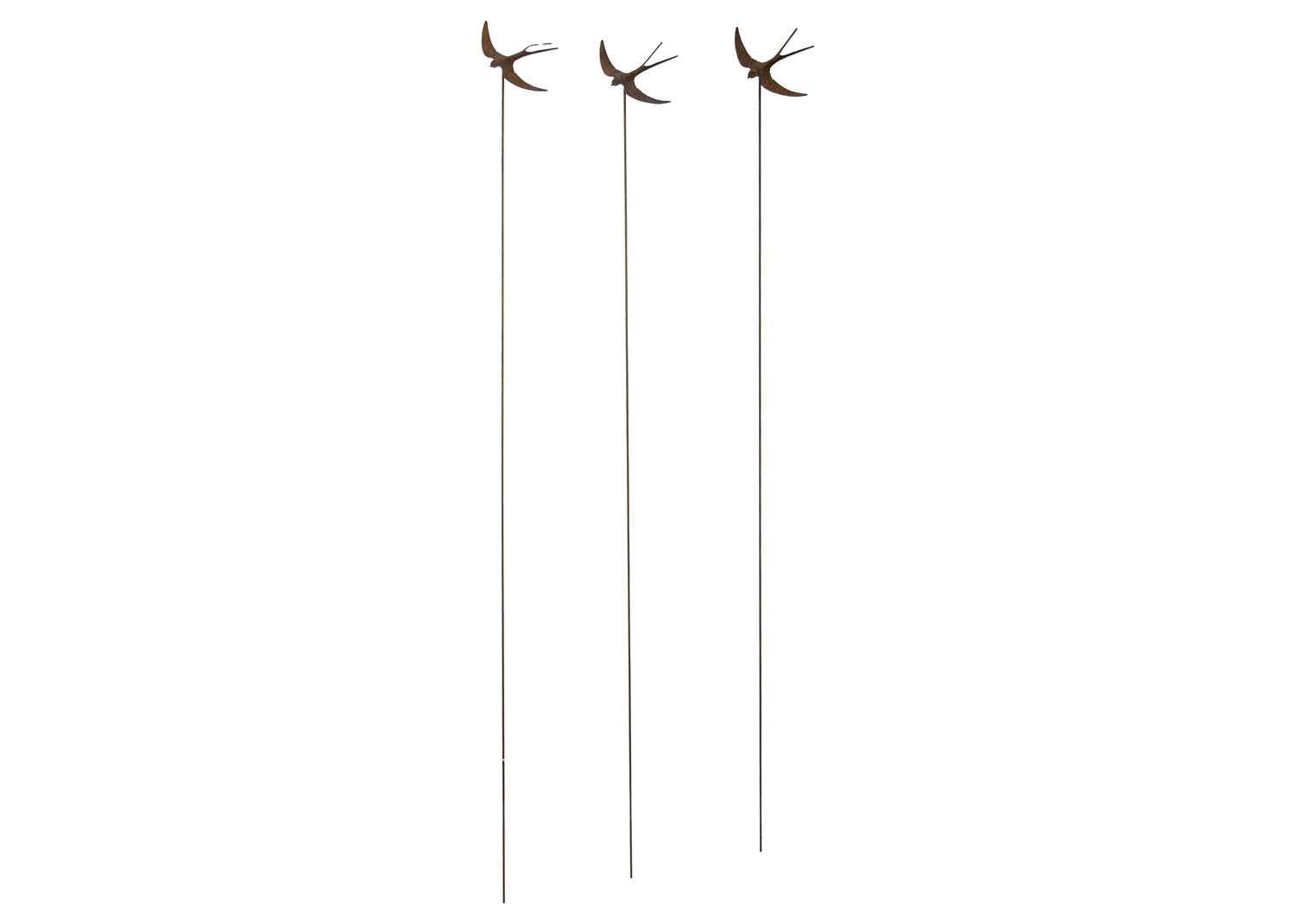 Three wrought iron swallow garden ornaments. Height 155cm. Rusted, Otherwise no condition issues to report.