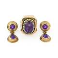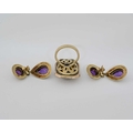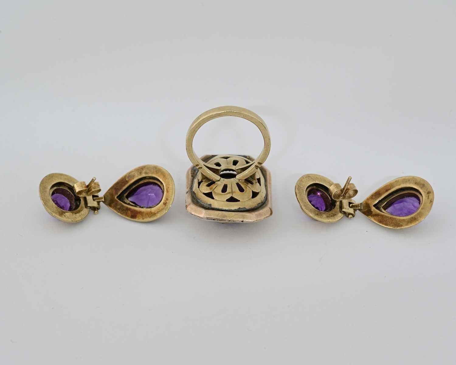 A pair of 9ct gold amethyst drop earrings and an amethyst and split pearl cluster ring, earrings with hallmarks for Birmingham, 1992, length of earrings 3.5cm, ring size L1/2, 20.3g.