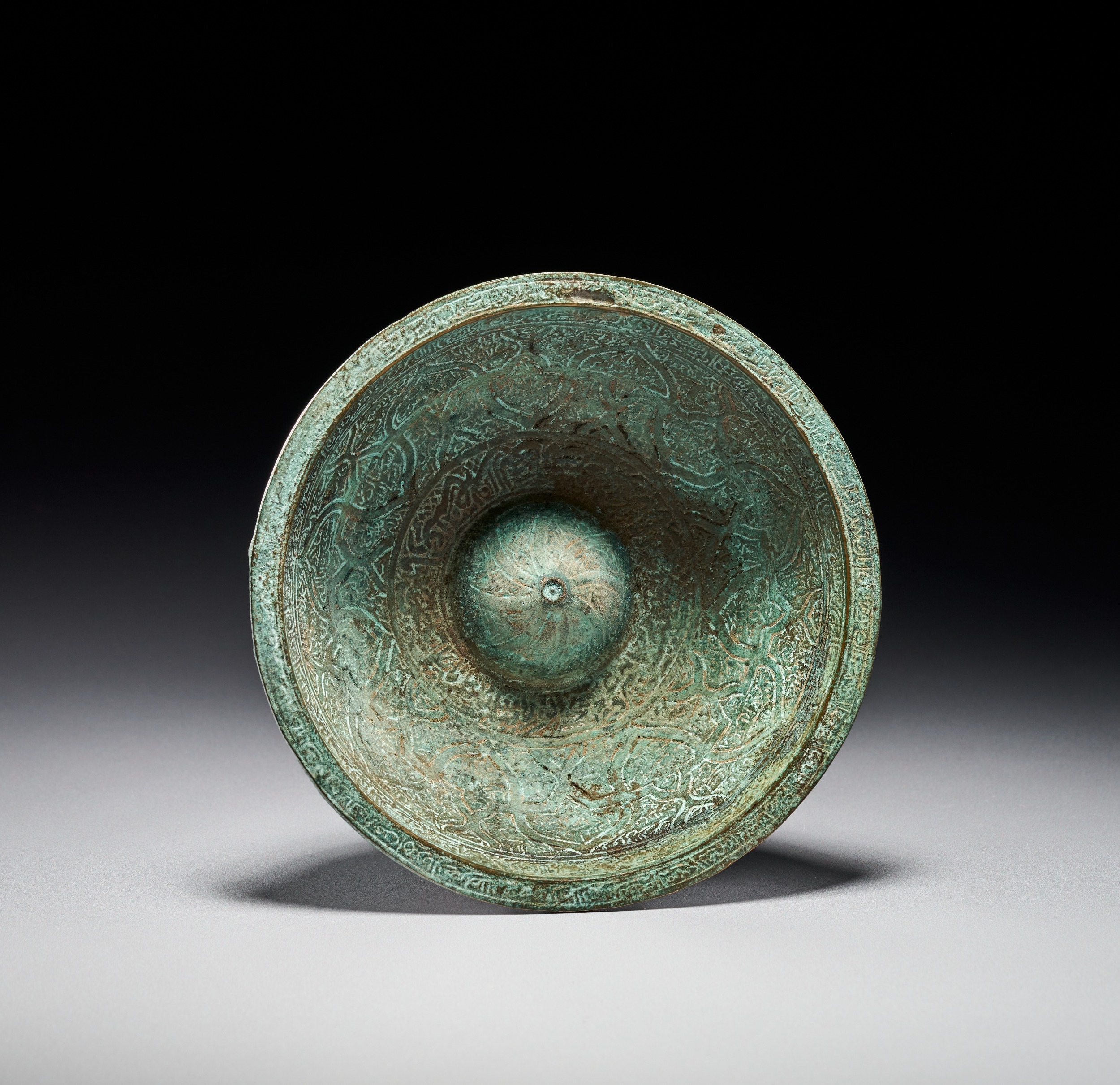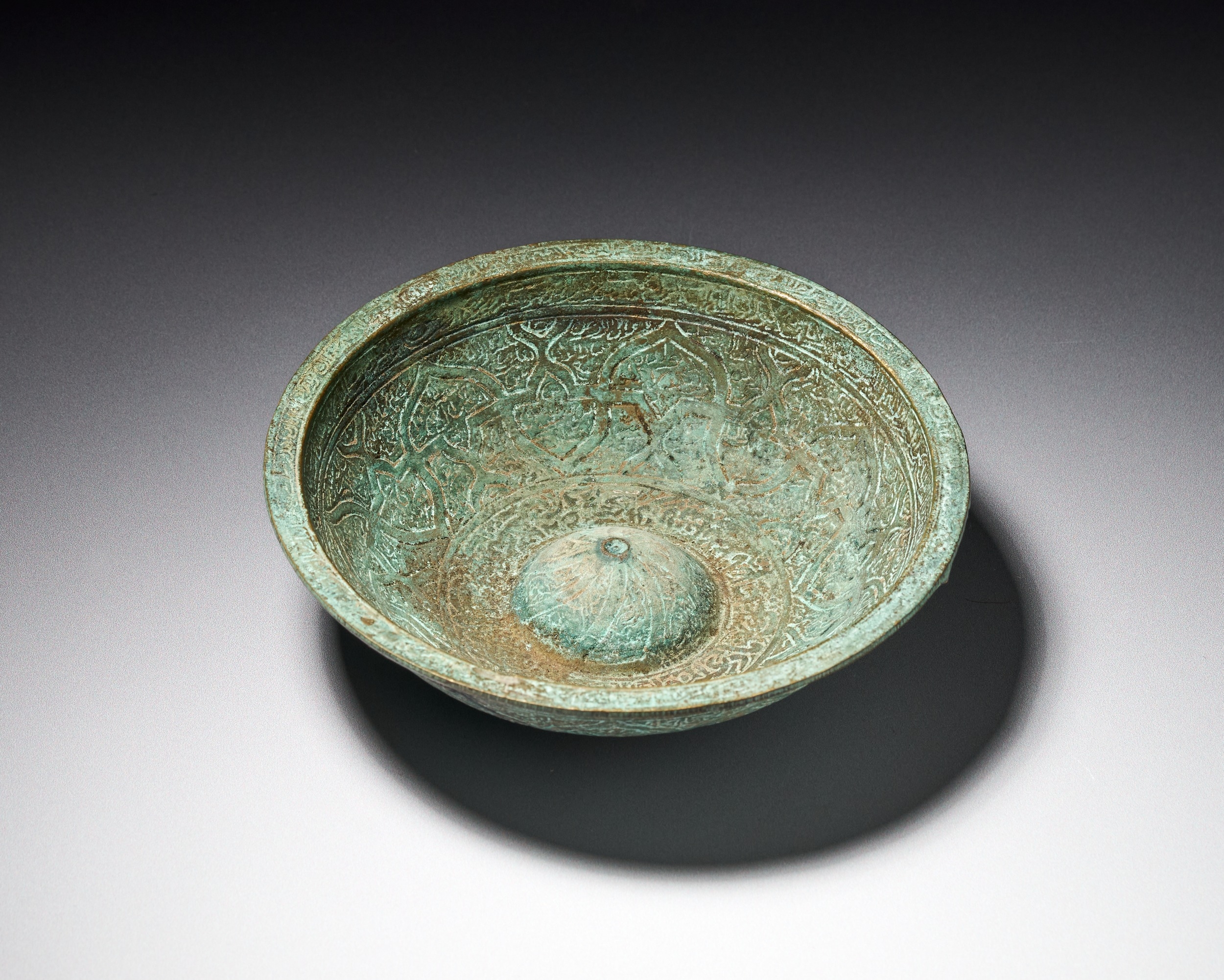 The piece is decorated with extensive chasing and engraving across both the interior and exterior surfaces. The interior design is organised around the central boss, which displays a radiating fluted or petal-like motif. Surrounding the boss are concentric bands and polylobed cartouches containing cursive Arabic calligraphy in the Naskh or Thuluth style, set against a background of fine foliate and interlaced geometric patterns. The exterior mirrors this decorative program with a broad band of calligraphic script around the upper body and further interlaced motifs toward the base. The underside features a recessed central area corresponding to the interior omphalos.