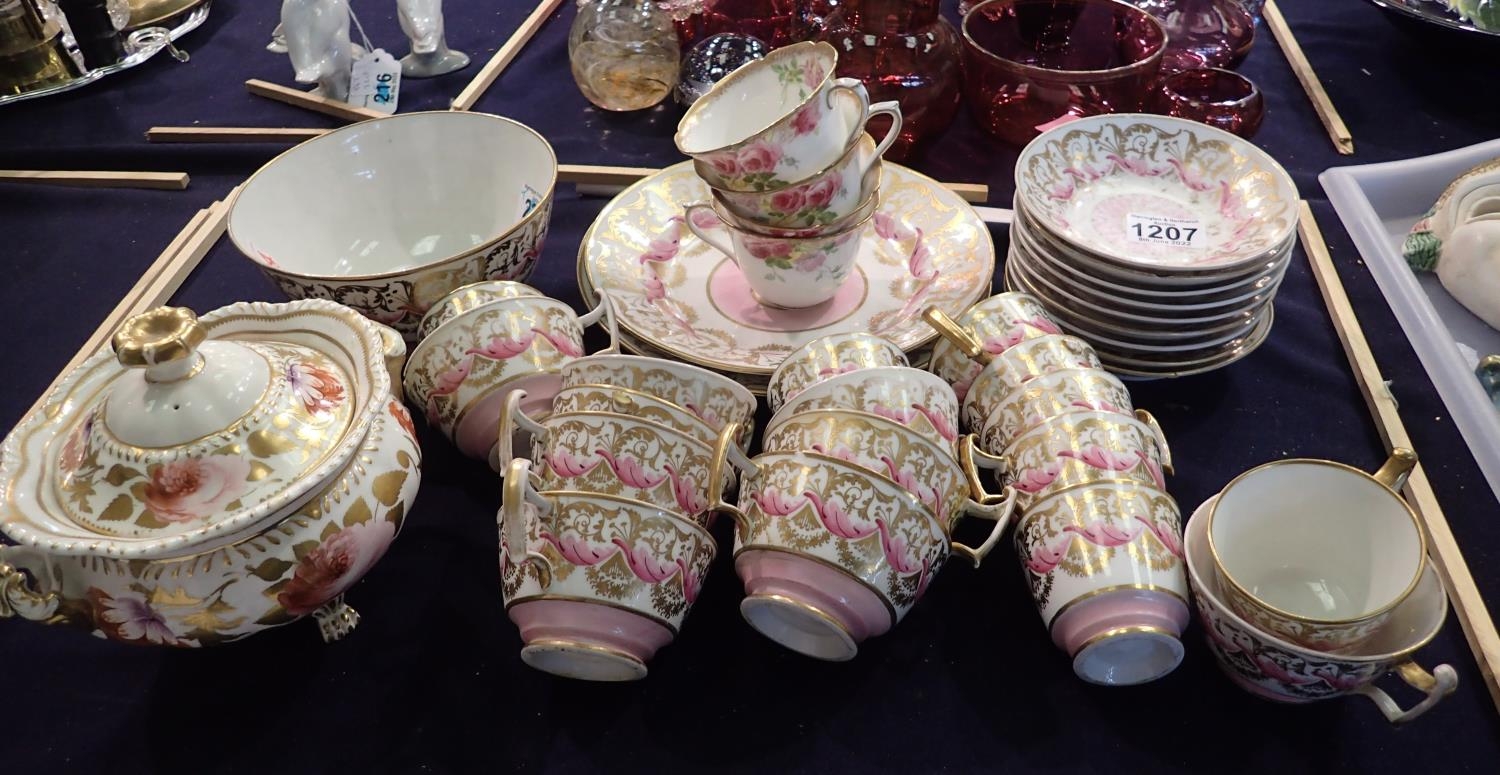 Victorian pink and gilt collection of tea and coffee ware, twenty nine pieces, some for restoration. Not available for in-house P&P, contact Paul O'Hea at Mailboxes on 01925 659133