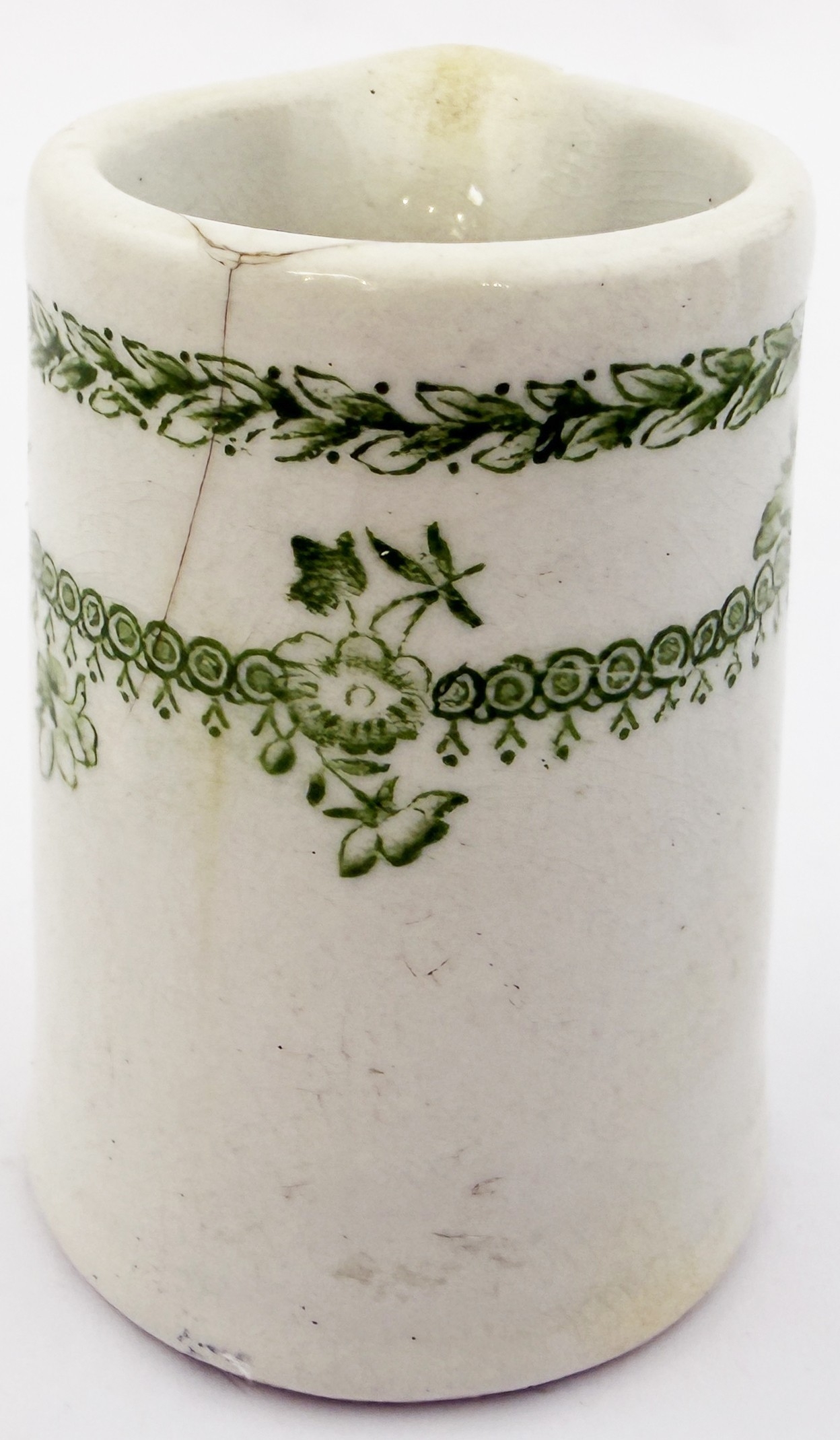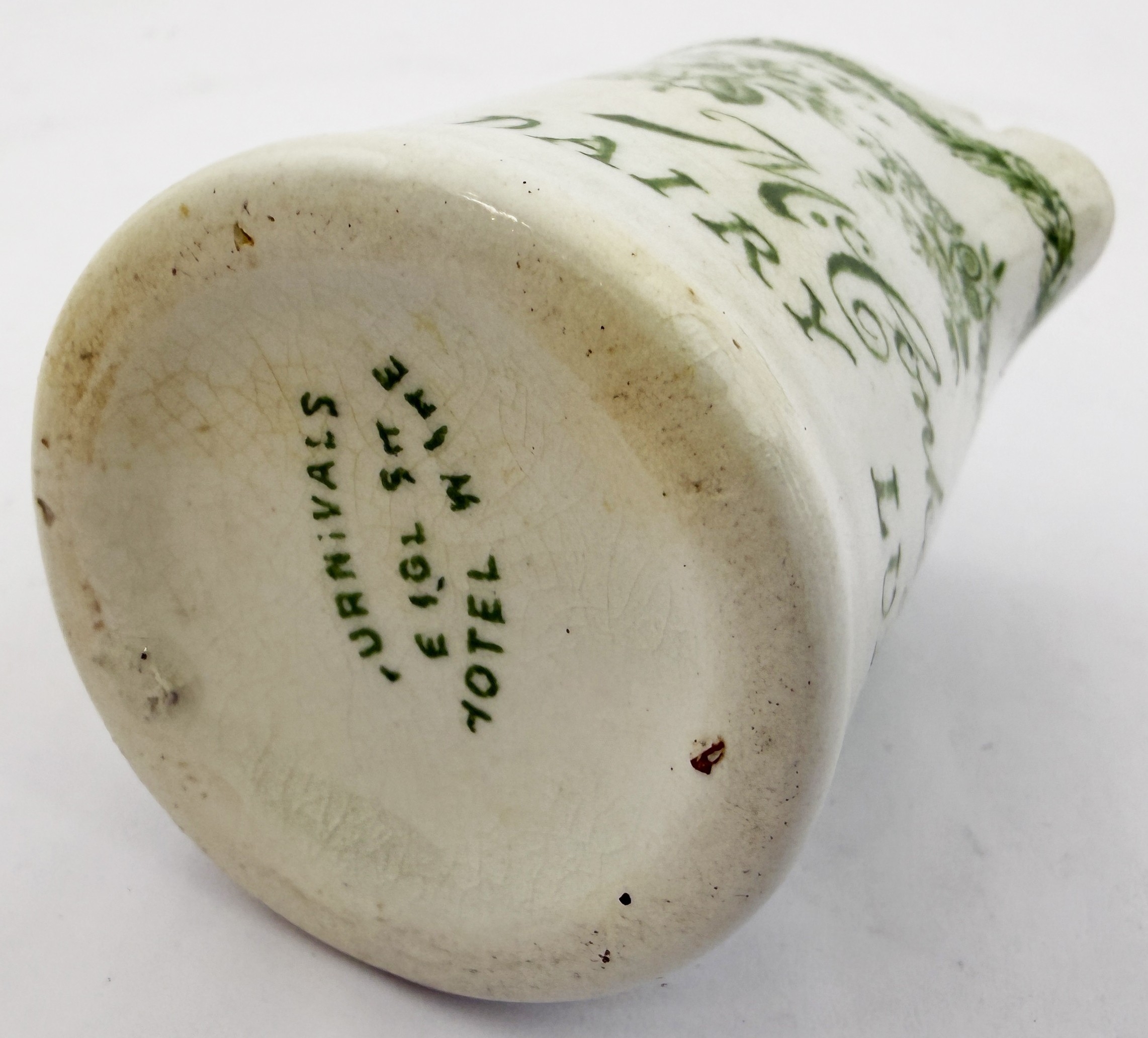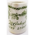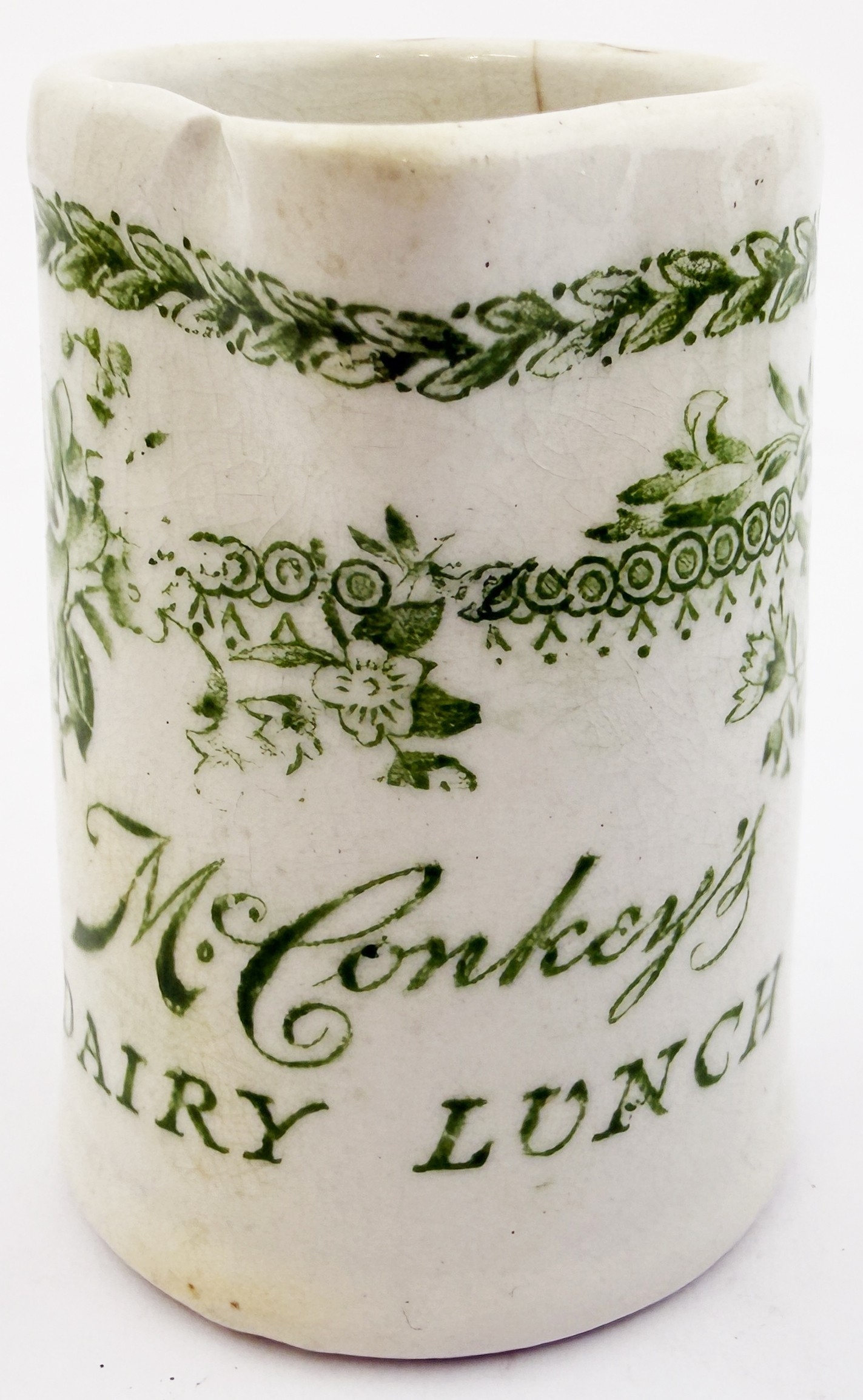 McCONKEYS DAIRY LUNCH CREAM POURER 2.5ins. Unusual green print cream pourer transferred Mc Conkeys/ DAIRY LUNCH below foliate decoration. Not sure where this hails from, answers on a postcard please! Hugh Davidson collection. Rear hairline