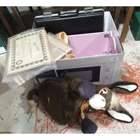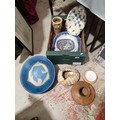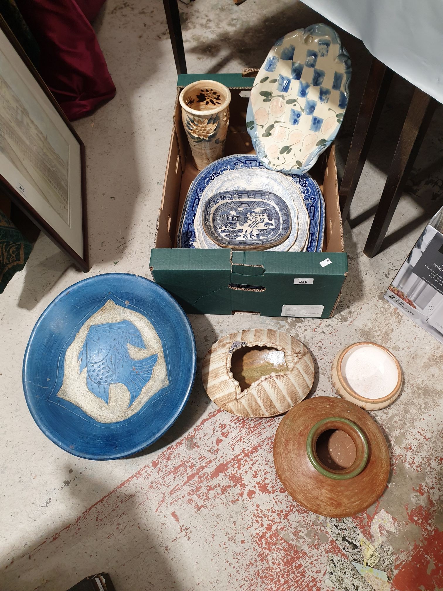A box including blue and white meat plates and Studio Pottery. No shipping. Arrange collection or your own packer and shipper please.
