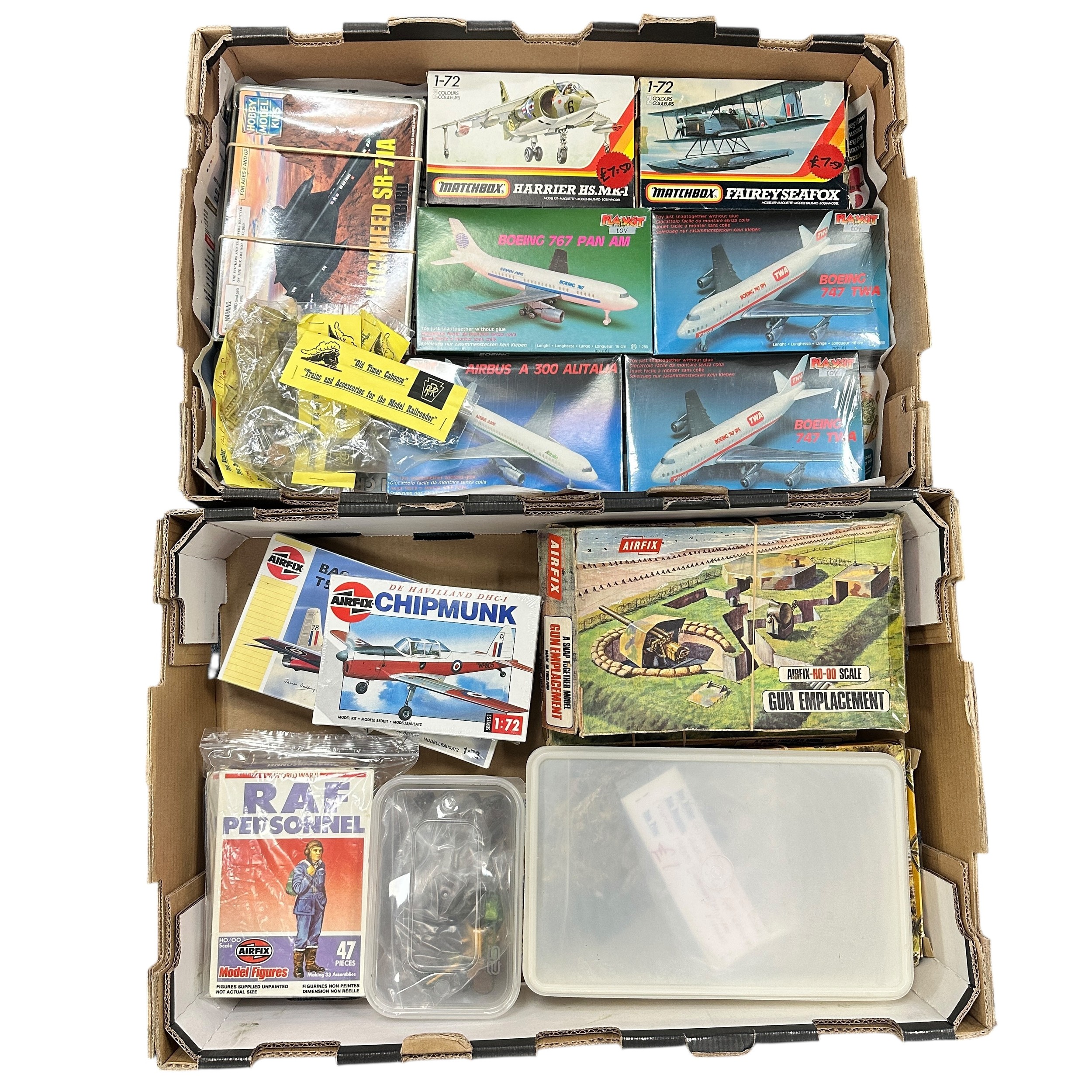 Model kits unmade 1/76th - 1/72nd scale, with Airfix (7) including Gun Emplacement and Pontoon Bridge, Matchbox (3), etc., generally excellent to good in good or better boxes (some shrink-wrapped), plus unboxed figures. Contents unchecked for completeness or correctness and viewing recommended. Qty 15 (2B)