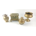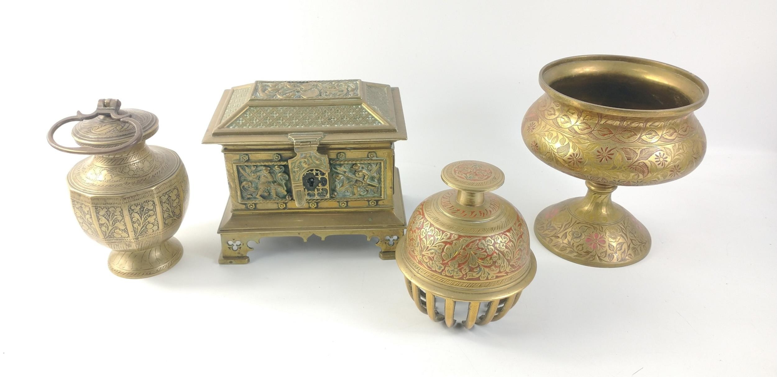 An unusual collection of 4 pieces of interesting brass items to include a cast brass "medieval-style" casket measuring L16cm x W11cm x H15cm (with false non-functional lock); a screw-lidded pot with measuring cup inside measuring 10cm in diameter x H15cm; a red decorative elephant bell measuring 10cm in diameter x H12cm contained in a red decorative brass holder measuring 14cm in diameter x H15cm approx.