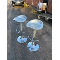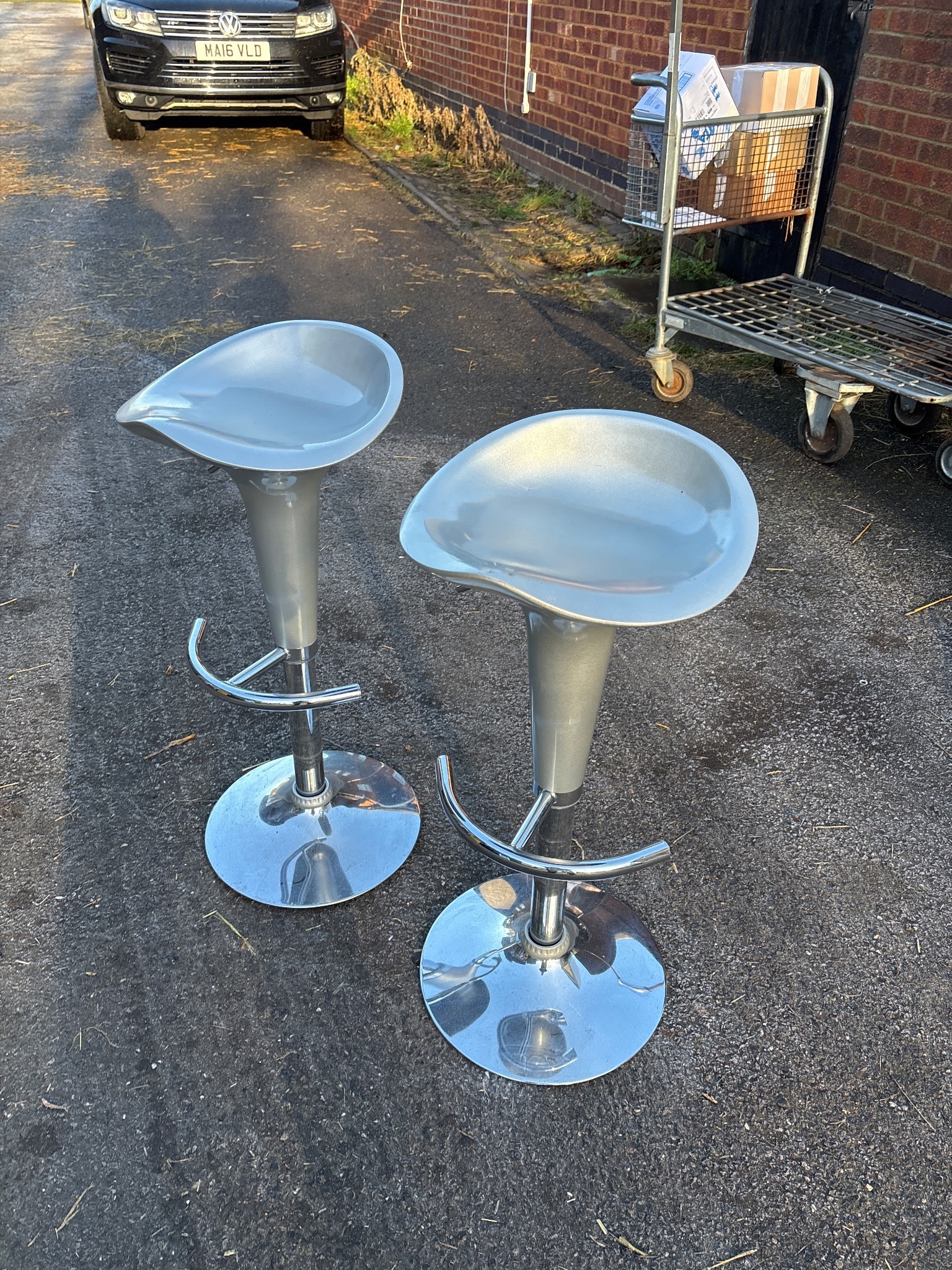 Two silver bar stools with chrome bases, featuring adjustable height and footrests. Good condition not postable.
