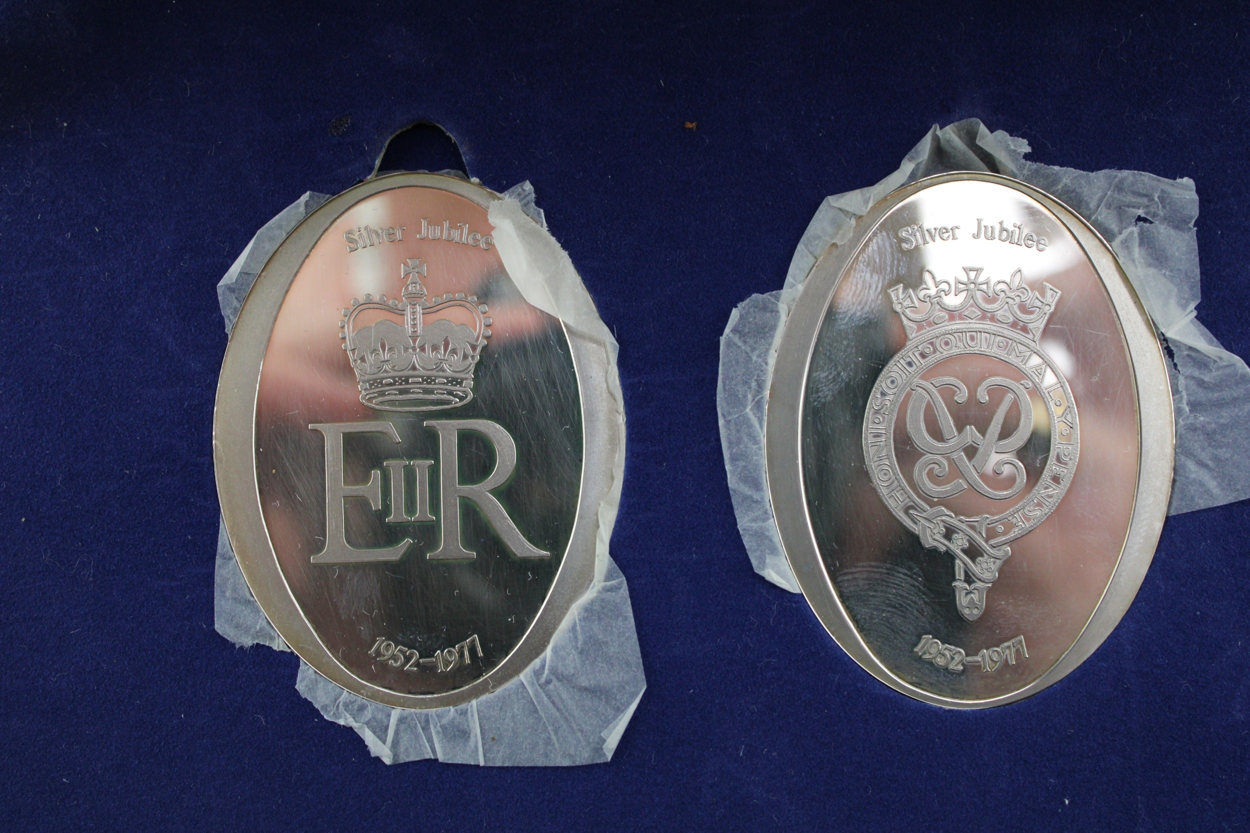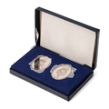 Pair large hallmarked sterling silver Jubilee oval ingots, QEII 86g, cased, 1977.