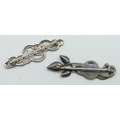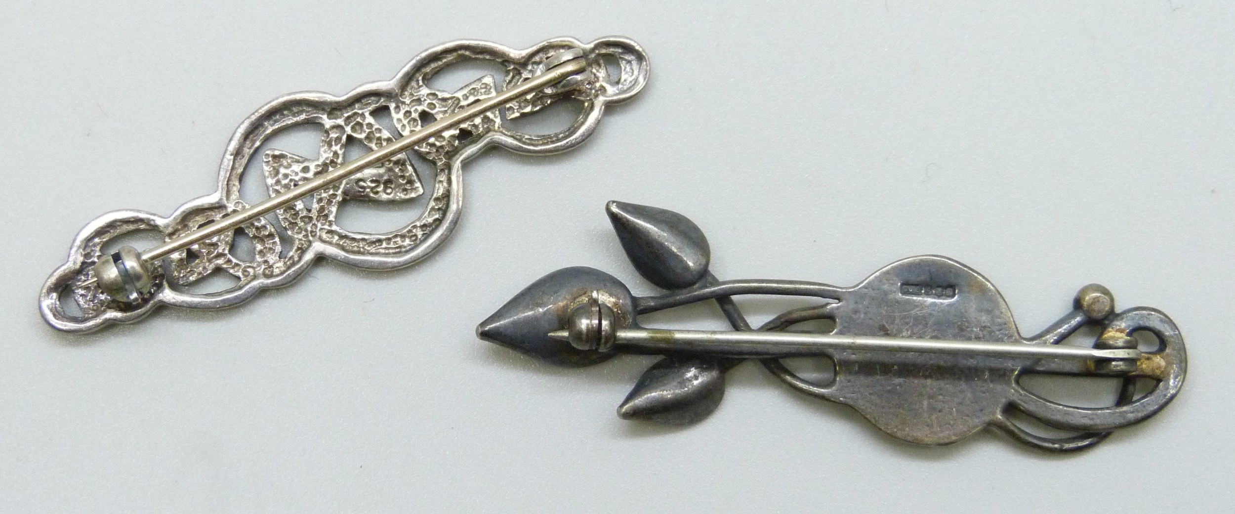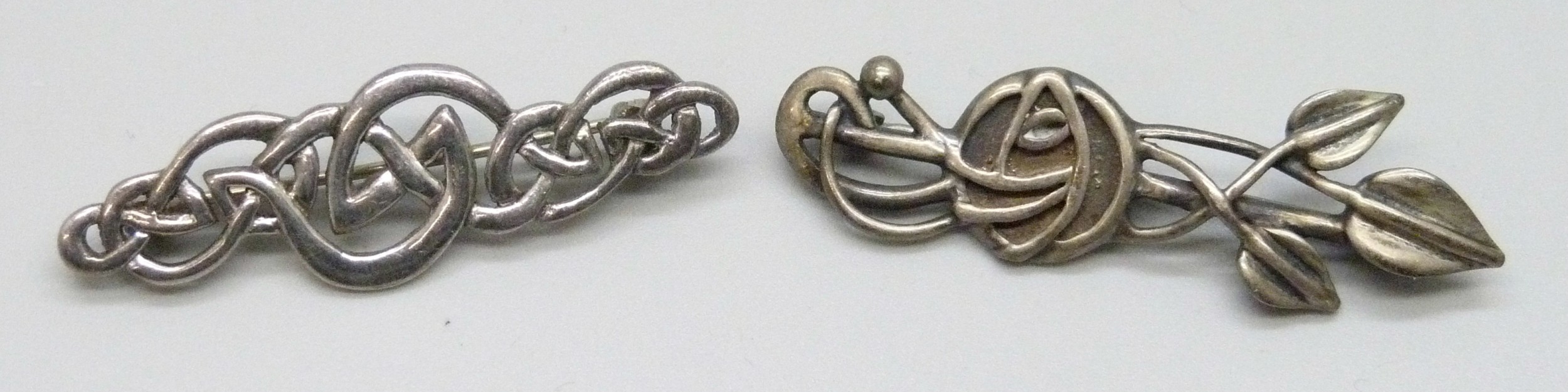A Carrick Jewellers Scottish silver Glasgow rose design bar brooch, hallmarked Edinburgh, 5.2cm, and a silver Celtic knot design bar brooch