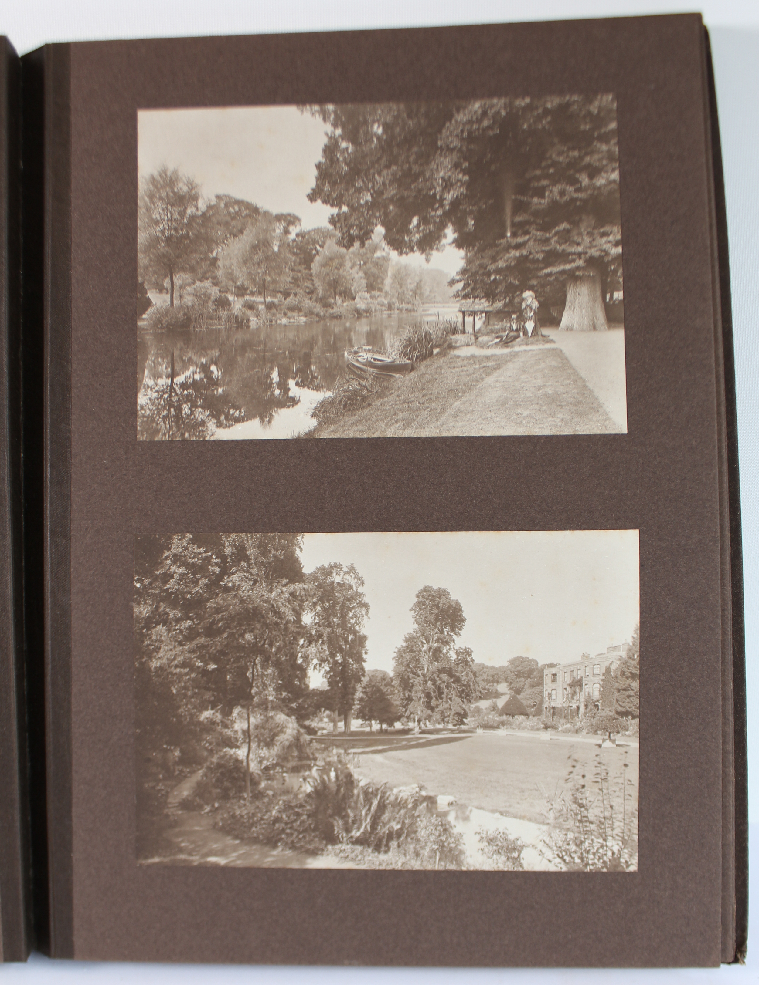 An early 20th century photograph album, the cover titled 'Lockinge' in gilt lettering (39 x 29 cm) and with eighteen pasted down prints: