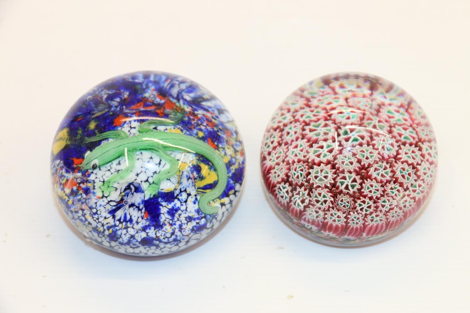 Glass paperweight decorated with a lizard, and another.