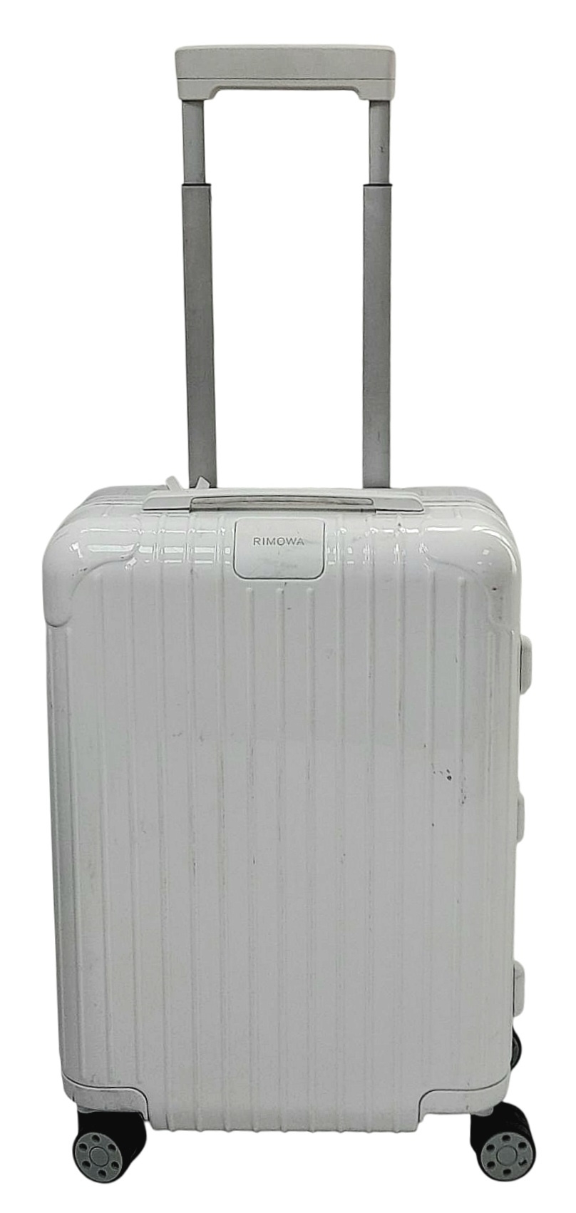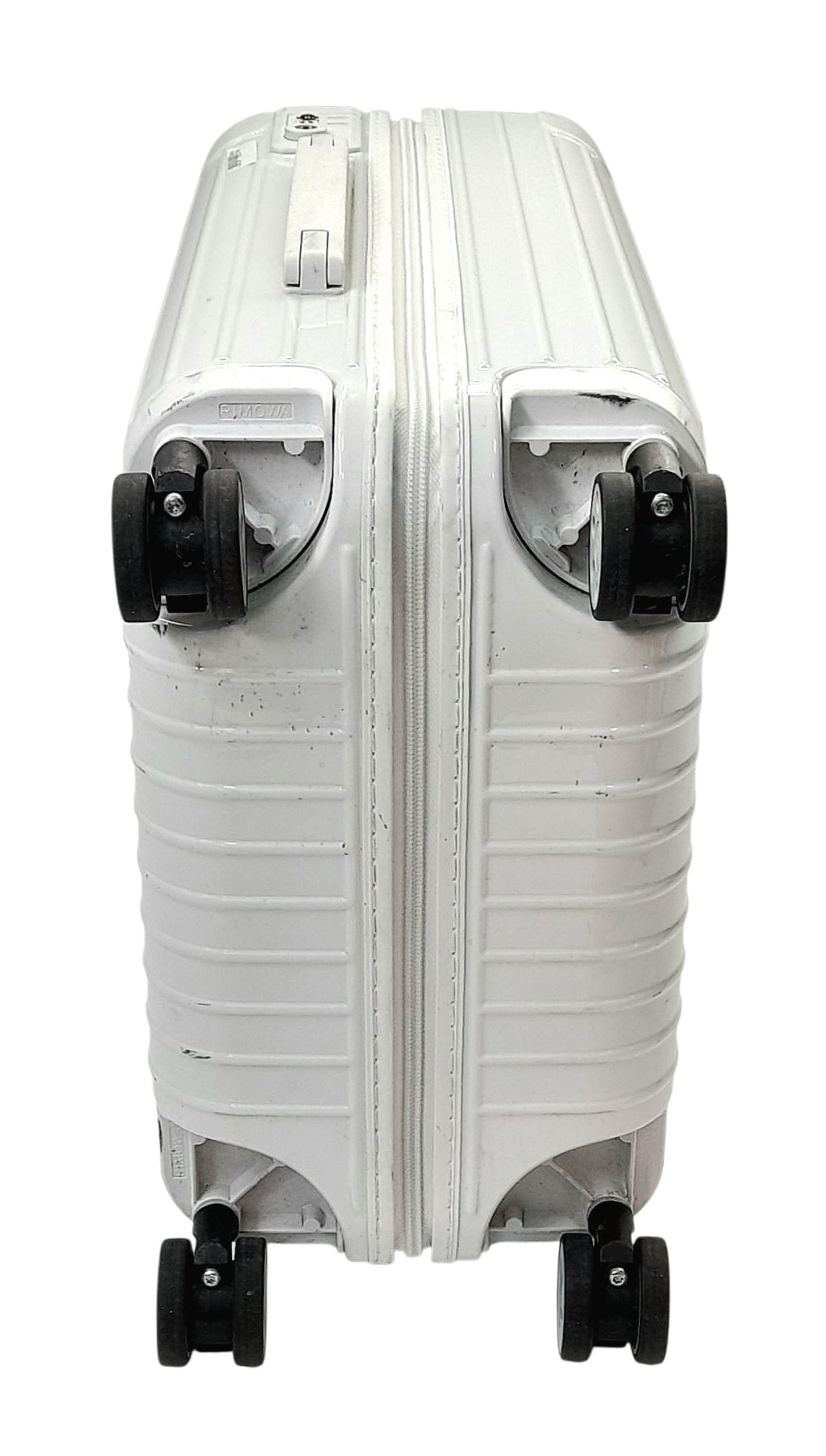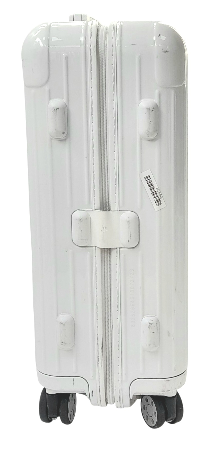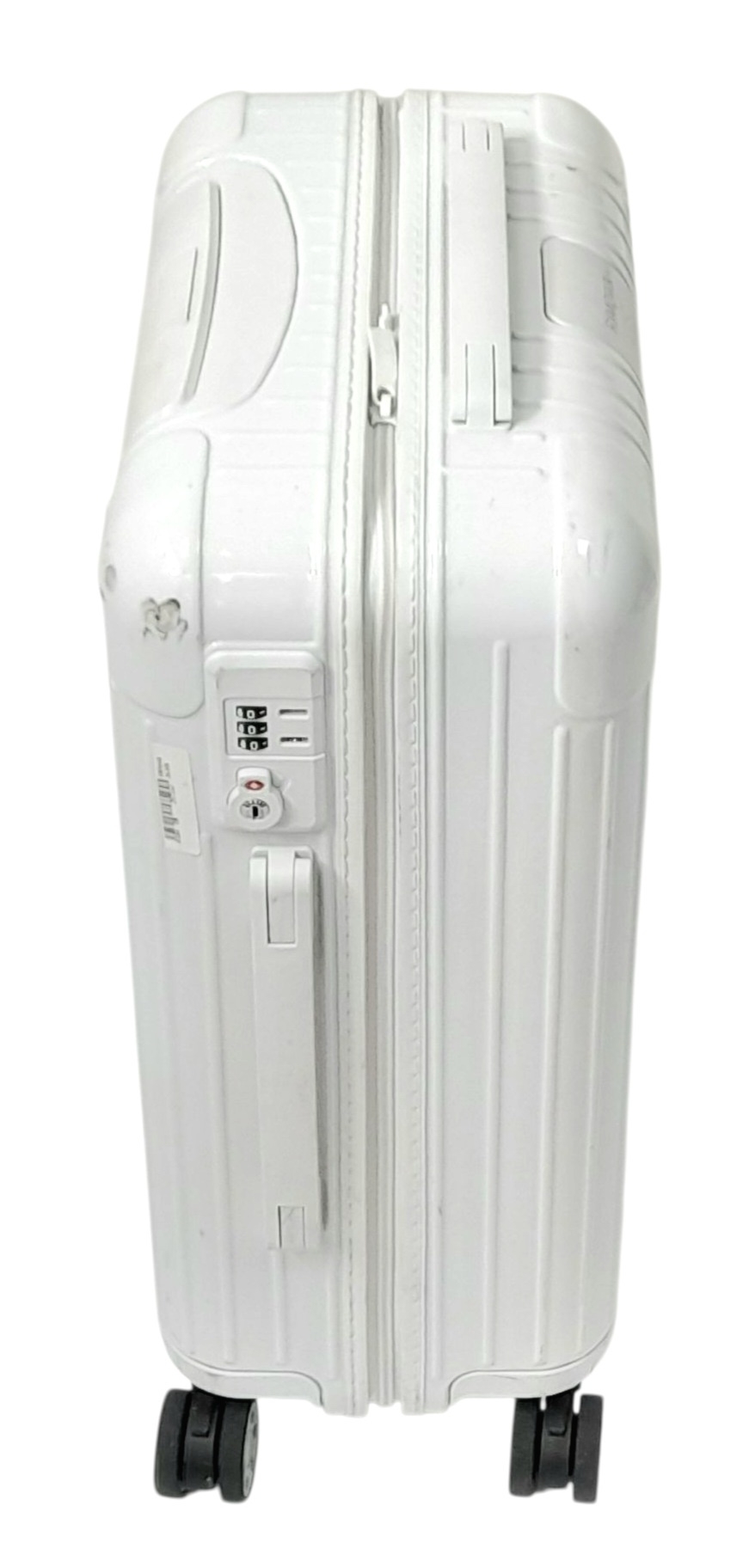 A Rimowa White Essential Cabin Suitcase. High performance polycarbonate exterior with single handle, pull handle, four wheels and double zip closure. Grey textile interior with two adjustable pocketed luggage dividers, luggage straps and zipped inner side pocket. Keys not included. Approximately 36cm length x 53cm height. Signs of wear to exterior - please see photos for conditions or request a condition report. Ref: J240