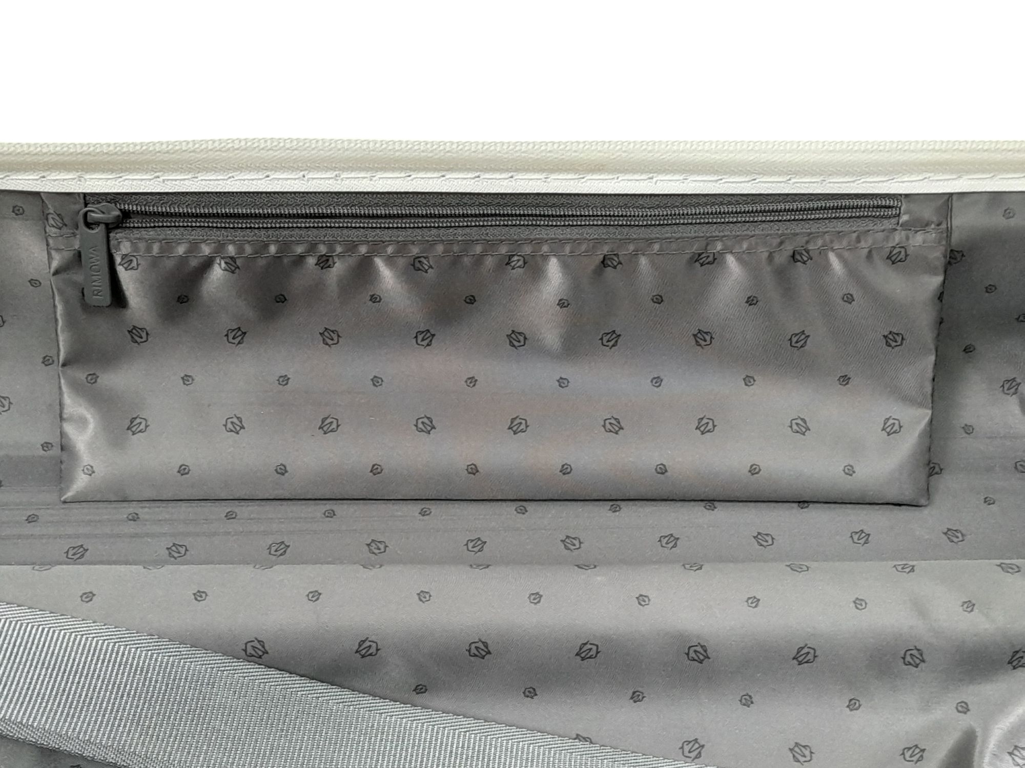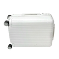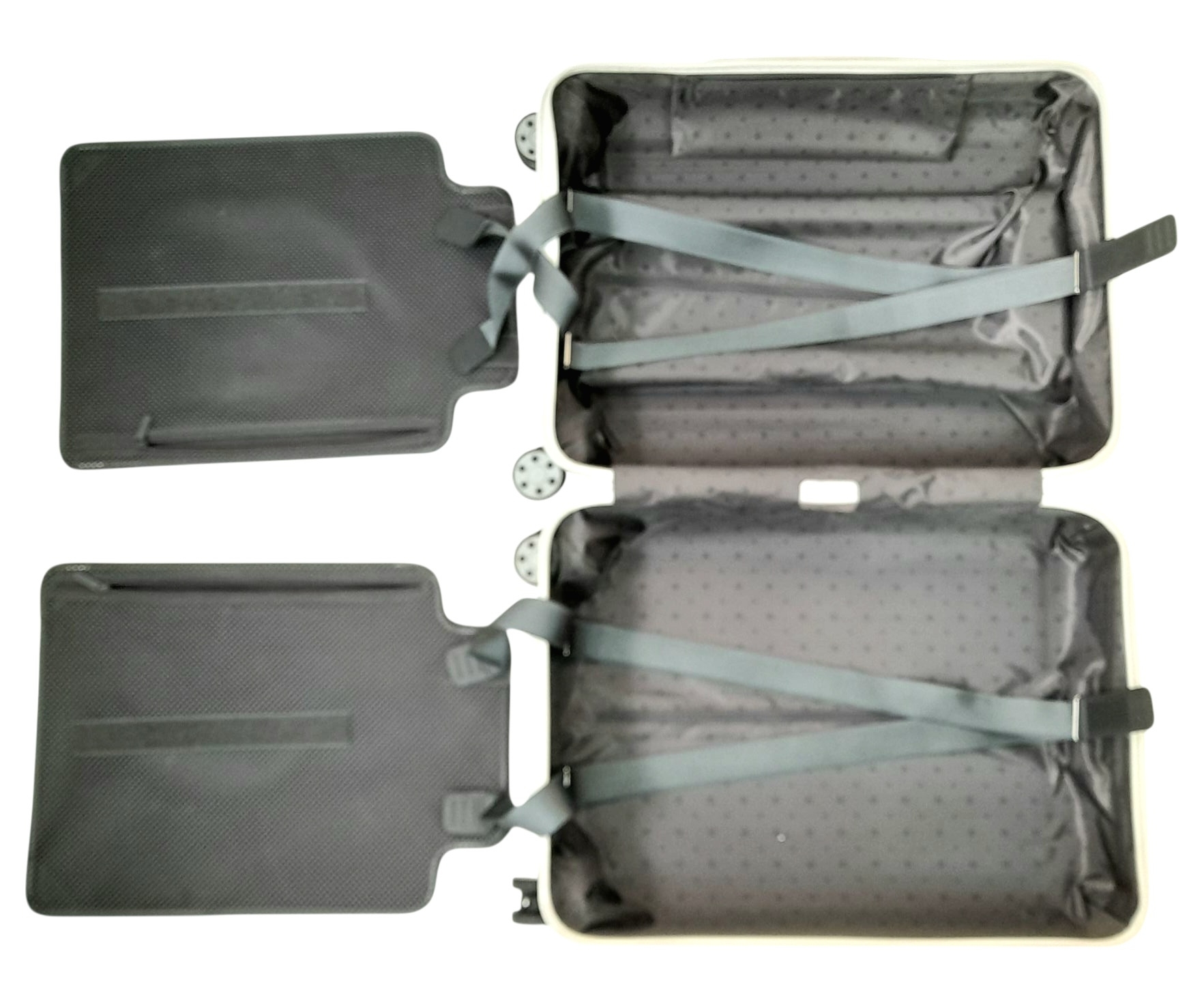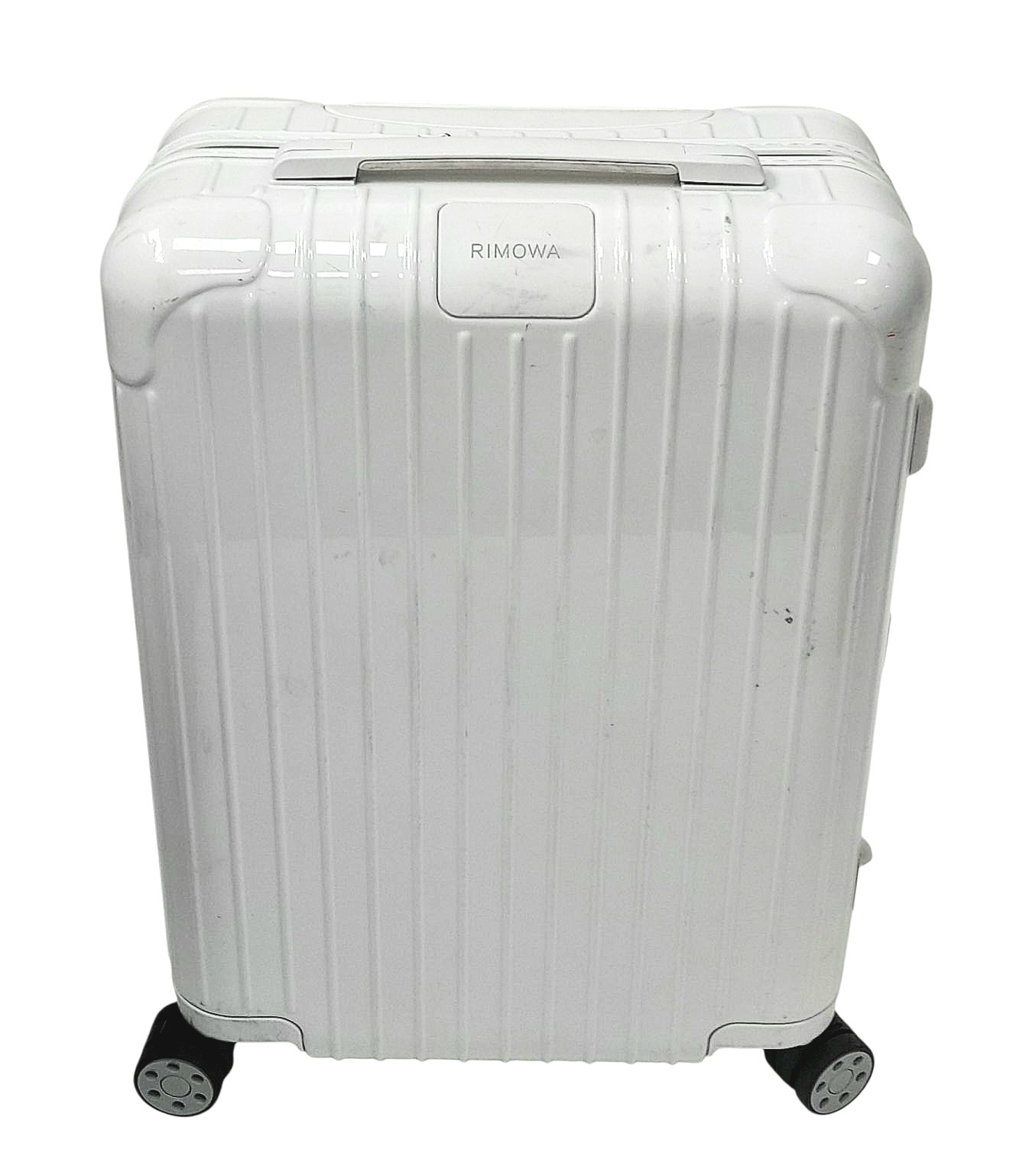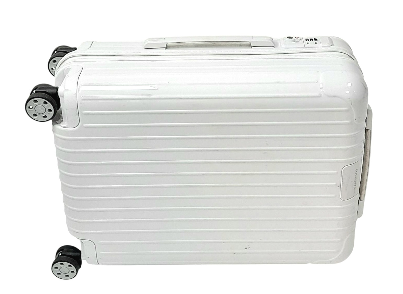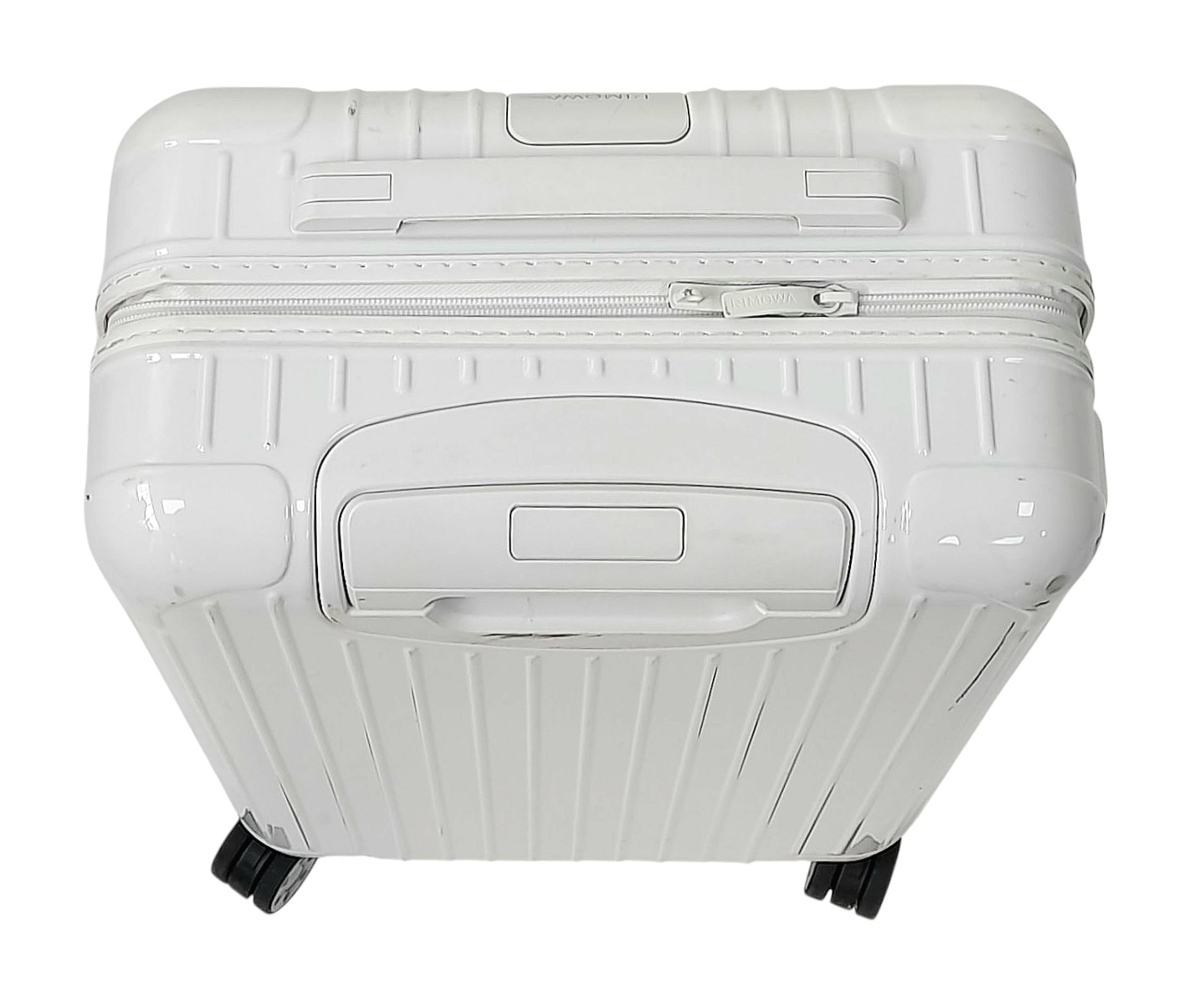 A Rimowa White Essential Cabin Suitcase. High performance polycarbonate exterior with single handle, pull handle, four wheels and double zip closure. Grey textile interior with two adjustable pocketed luggage dividers, luggage straps and zipped inner side pocket. Keys not included. Approximately 36cm length x 53cm height. Signs of wear to exterior - please see photos for conditions or request a condition report. Ref: J240