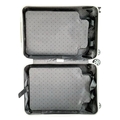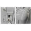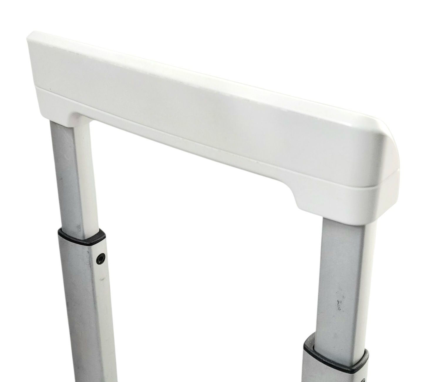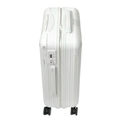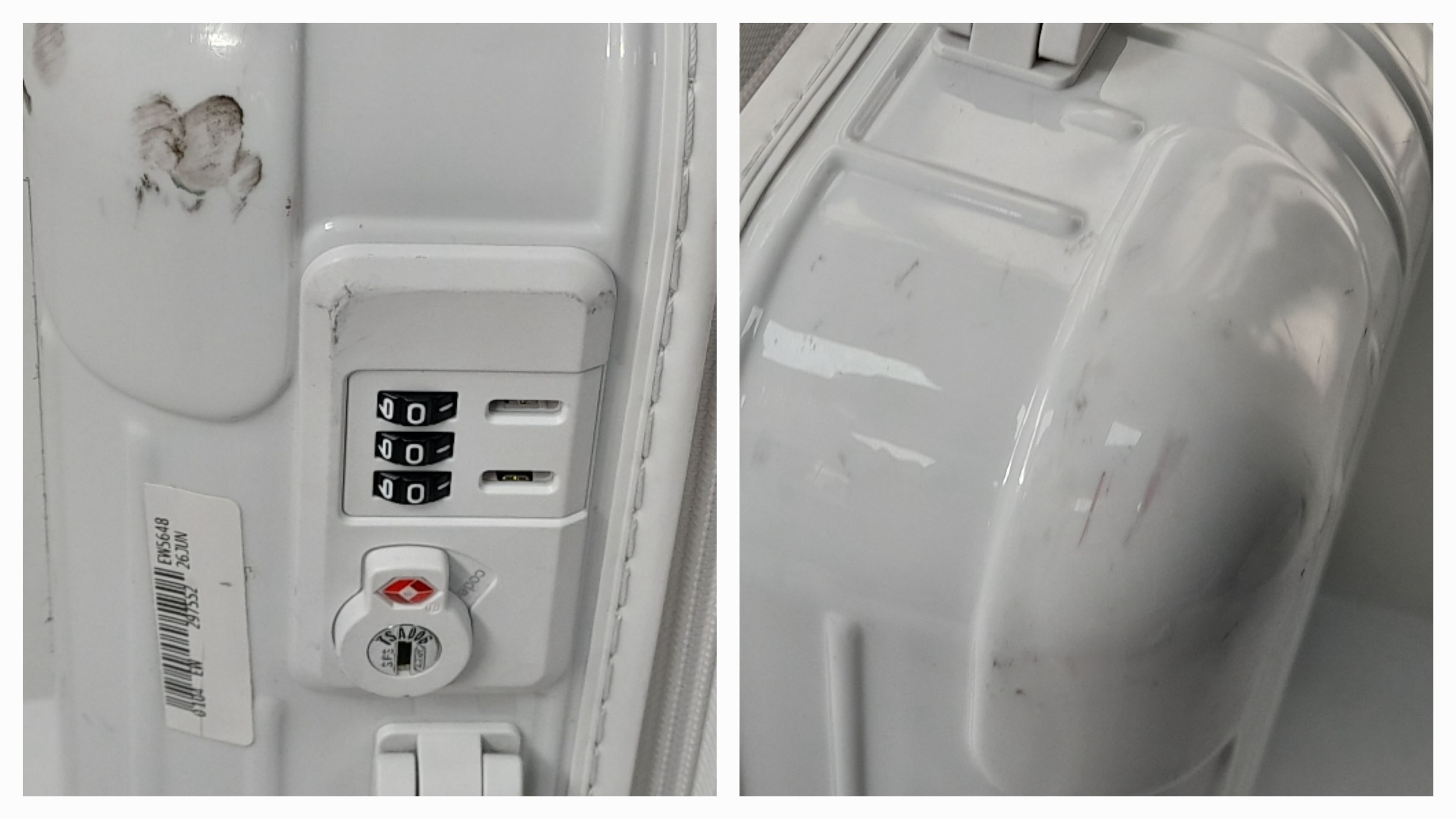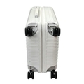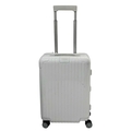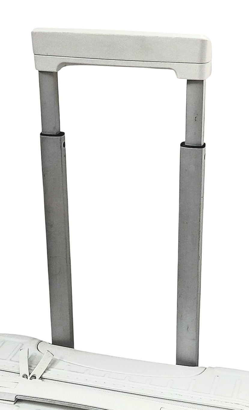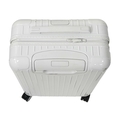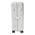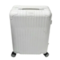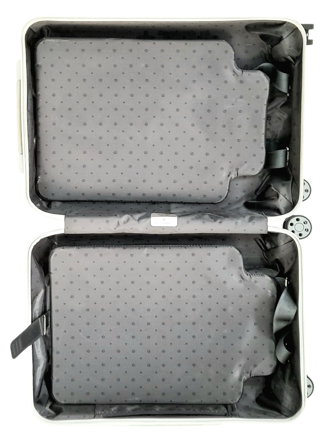 A Rimowa White Essential Cabin Suitcase. High performance polycarbonate exterior with single handle, pull handle, four wheels and double zip closure. Grey textile interior with two adjustable pocketed luggage dividers, luggage straps and zipped inner side pocket. Keys not included. Approximately 36cm length x 53cm height. Signs of wear to exterior - please see photos for conditions or request a condition report. Ref: J240
