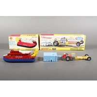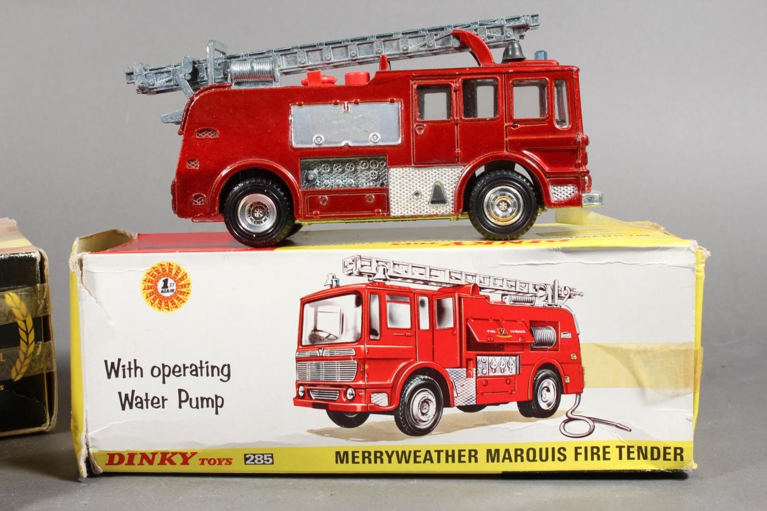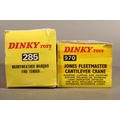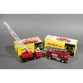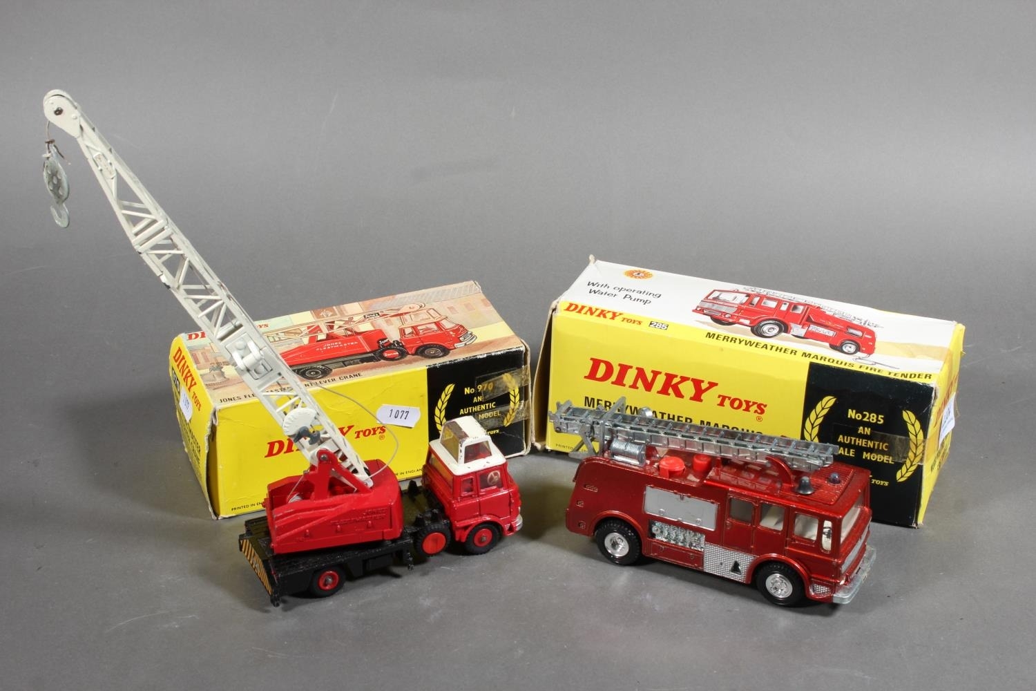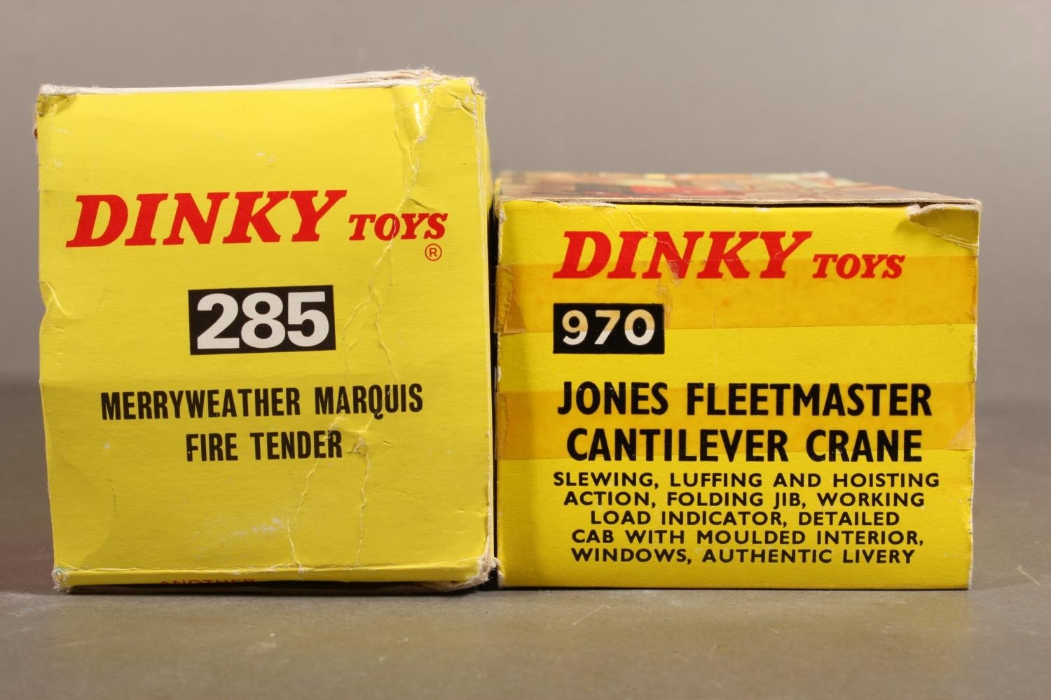 Dinky Toys diecast model vehicle 285 Merryweather Marquis Fire Tender and 970 Jones Fleetmaster Cantilever Crane, both boxed. (2)