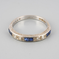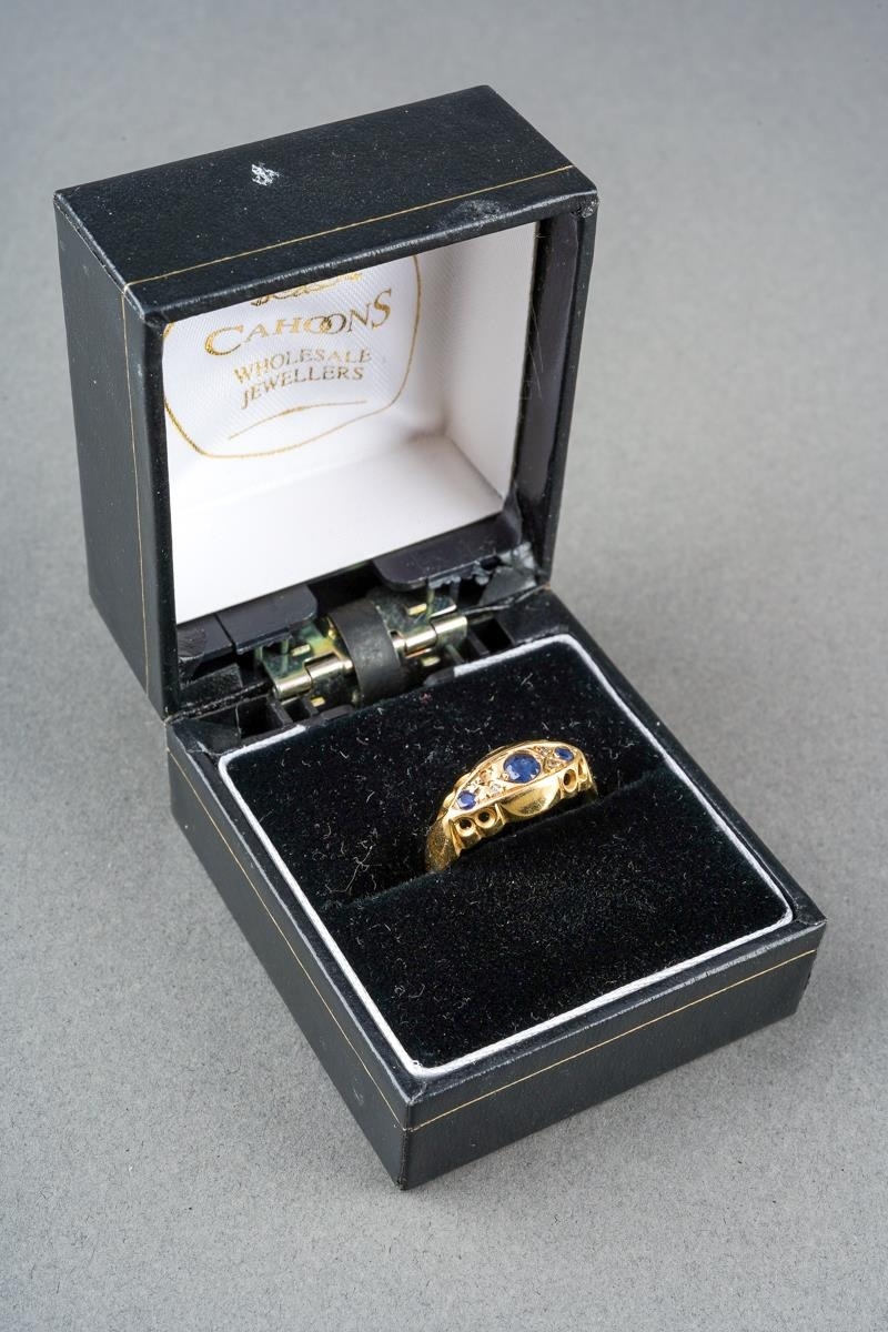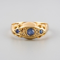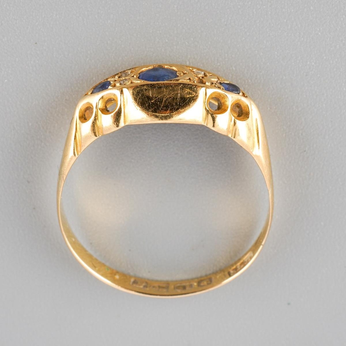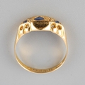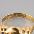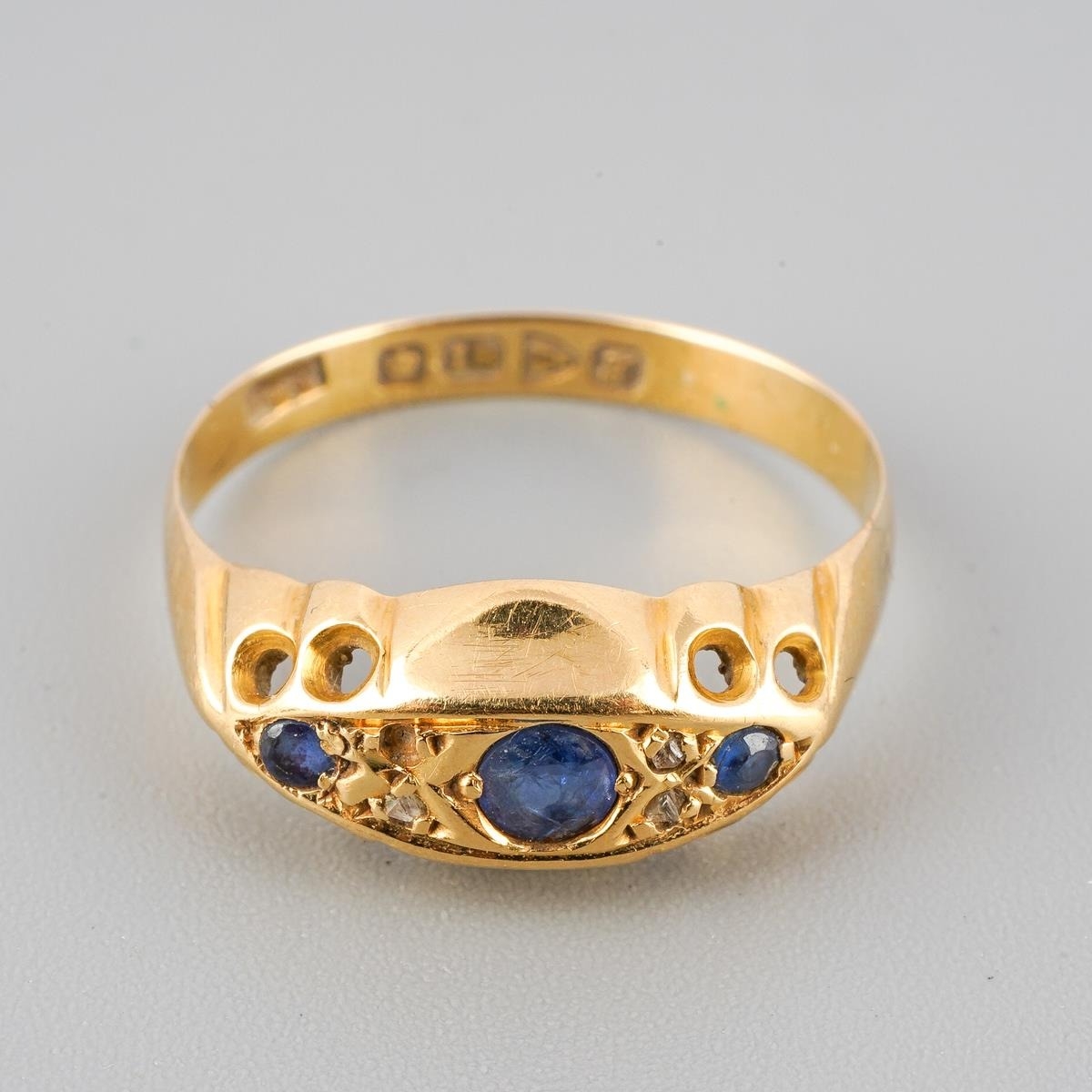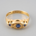 An Edwardian sapphire and diamond ring. Set with a principal circular shape sapphire, flanked to each side by one sapphire ans one garnet topped doublet, interspaced by rose cut diamonds (one diamond missing), approx ring size O, hallmarked 18ct gold Chester 1906, approx gross weight 2.0 grams.