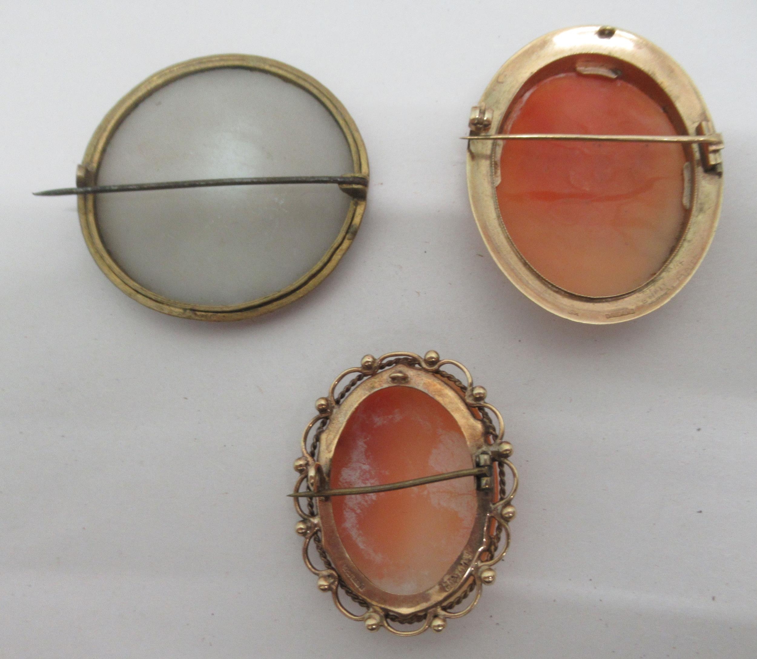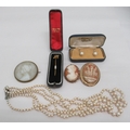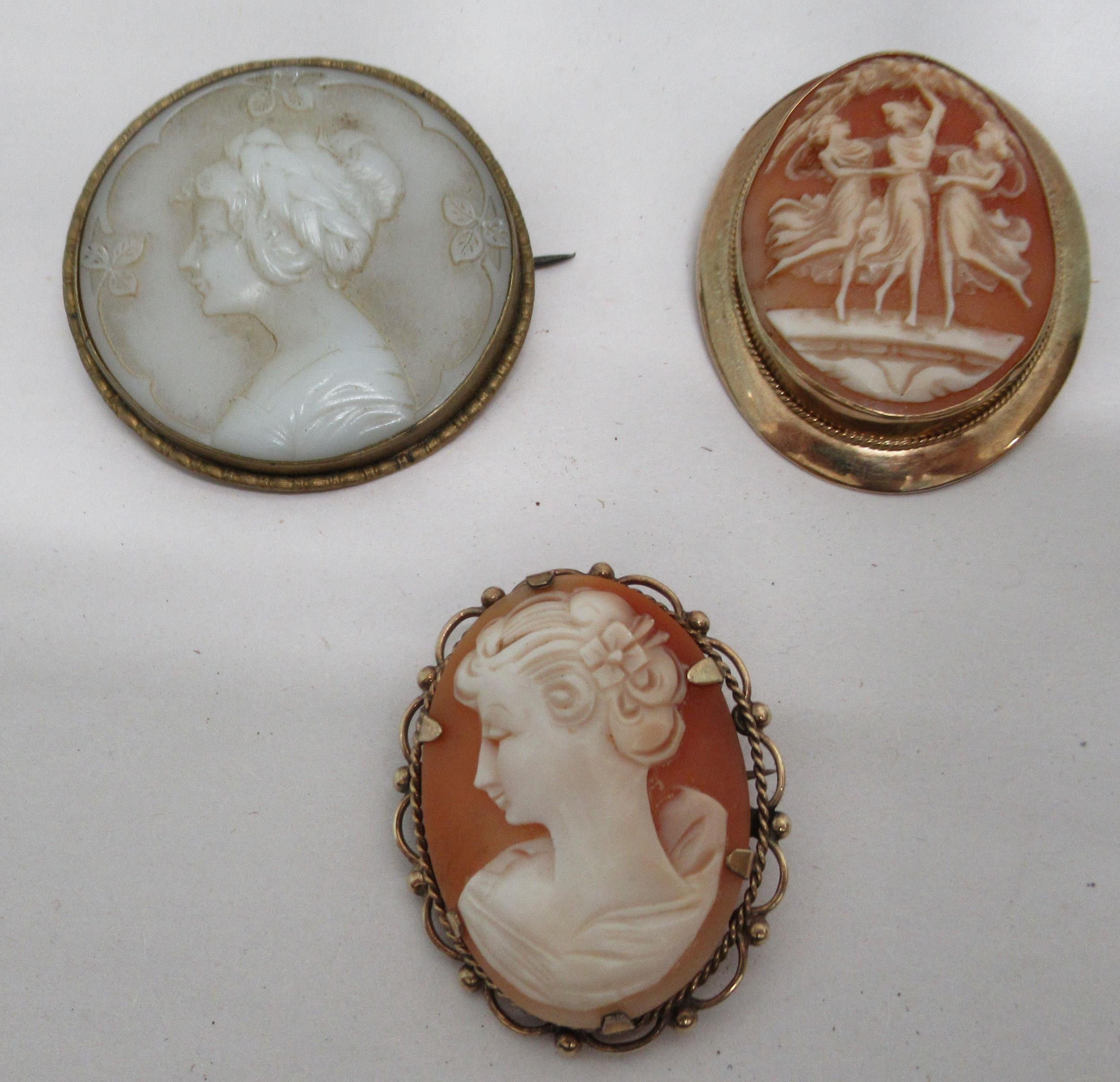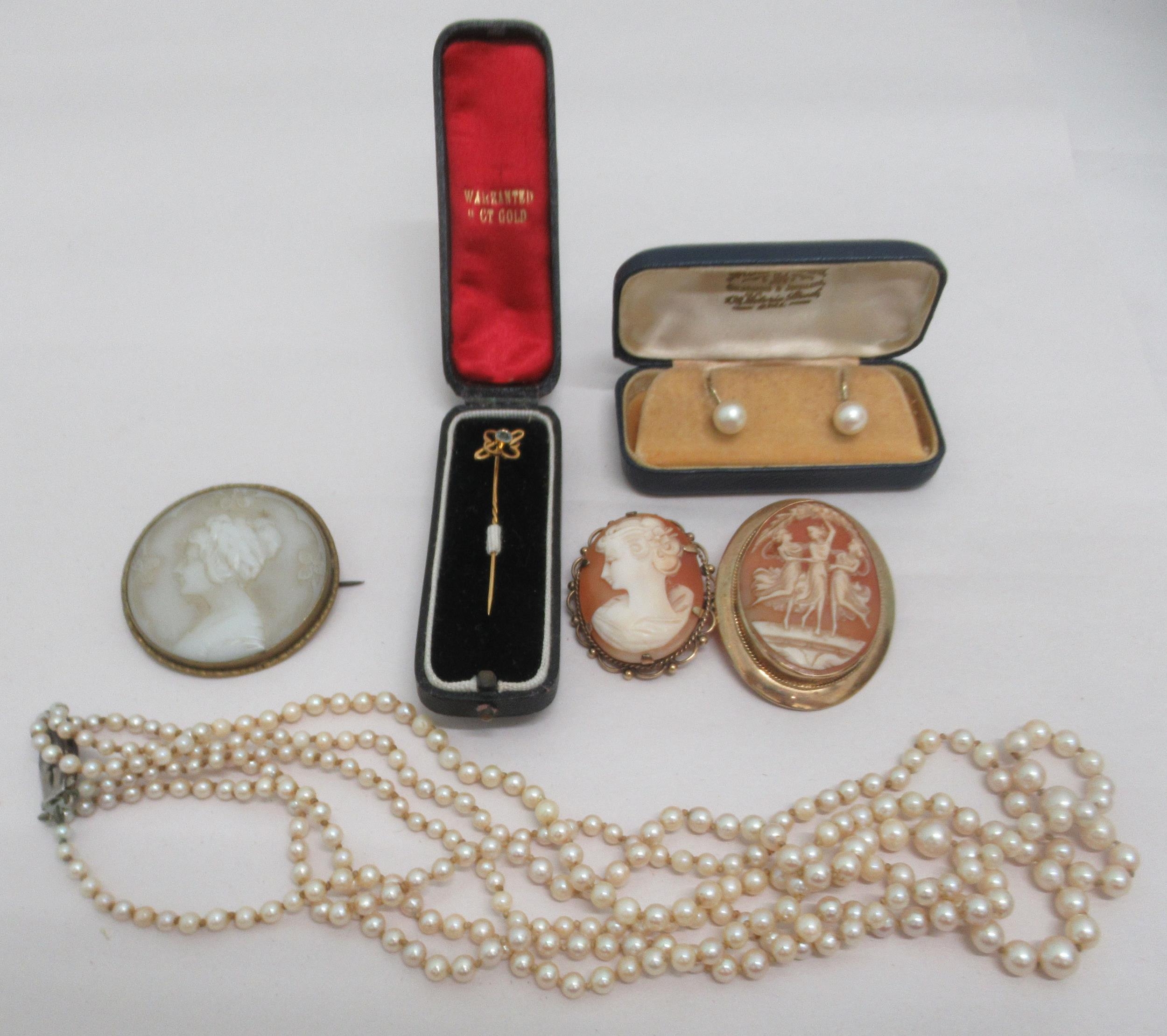 Items of personal ornament: to include a 9ct gold framed cameo brooch; and a triple strand pearl necklace