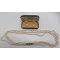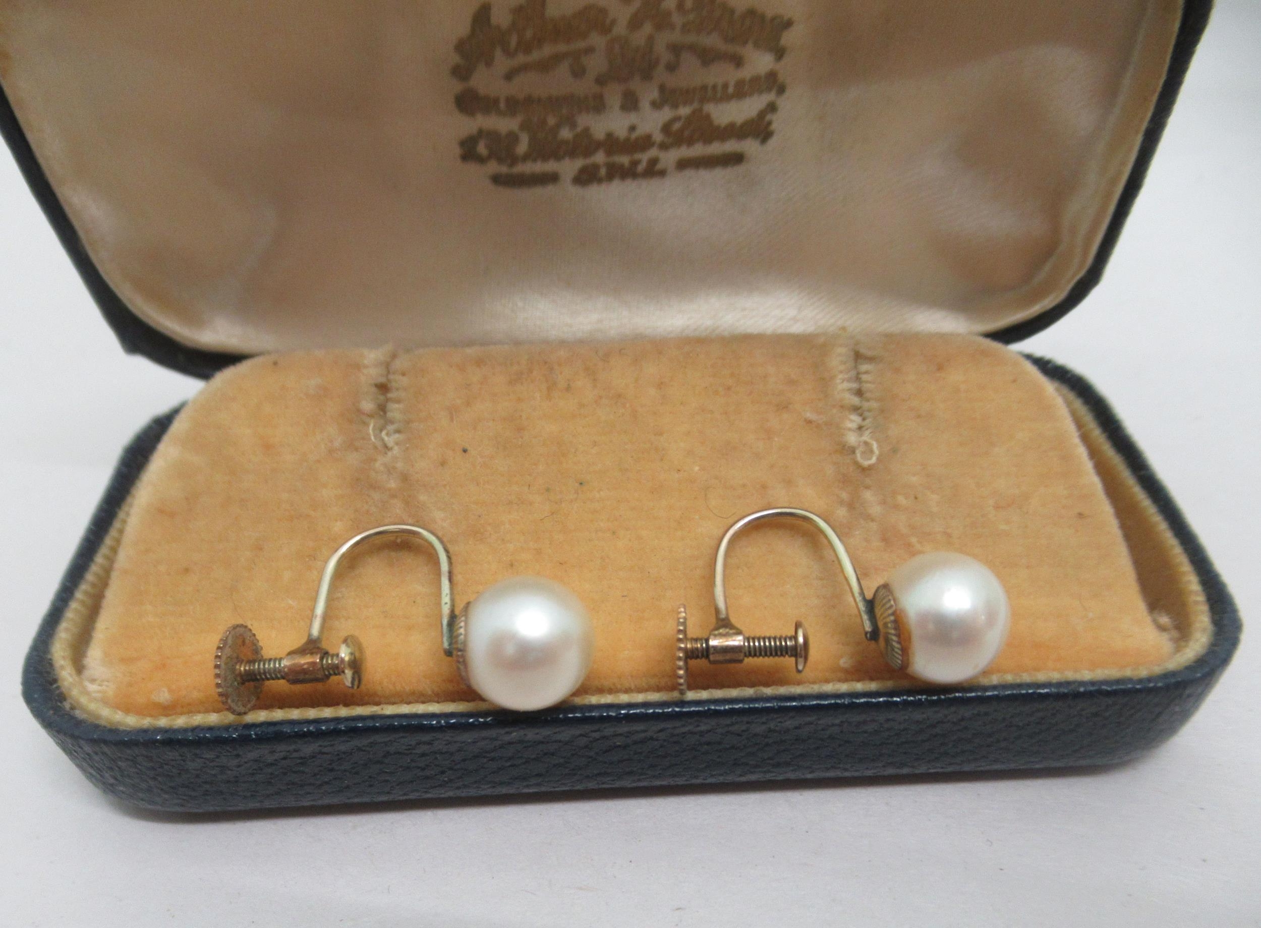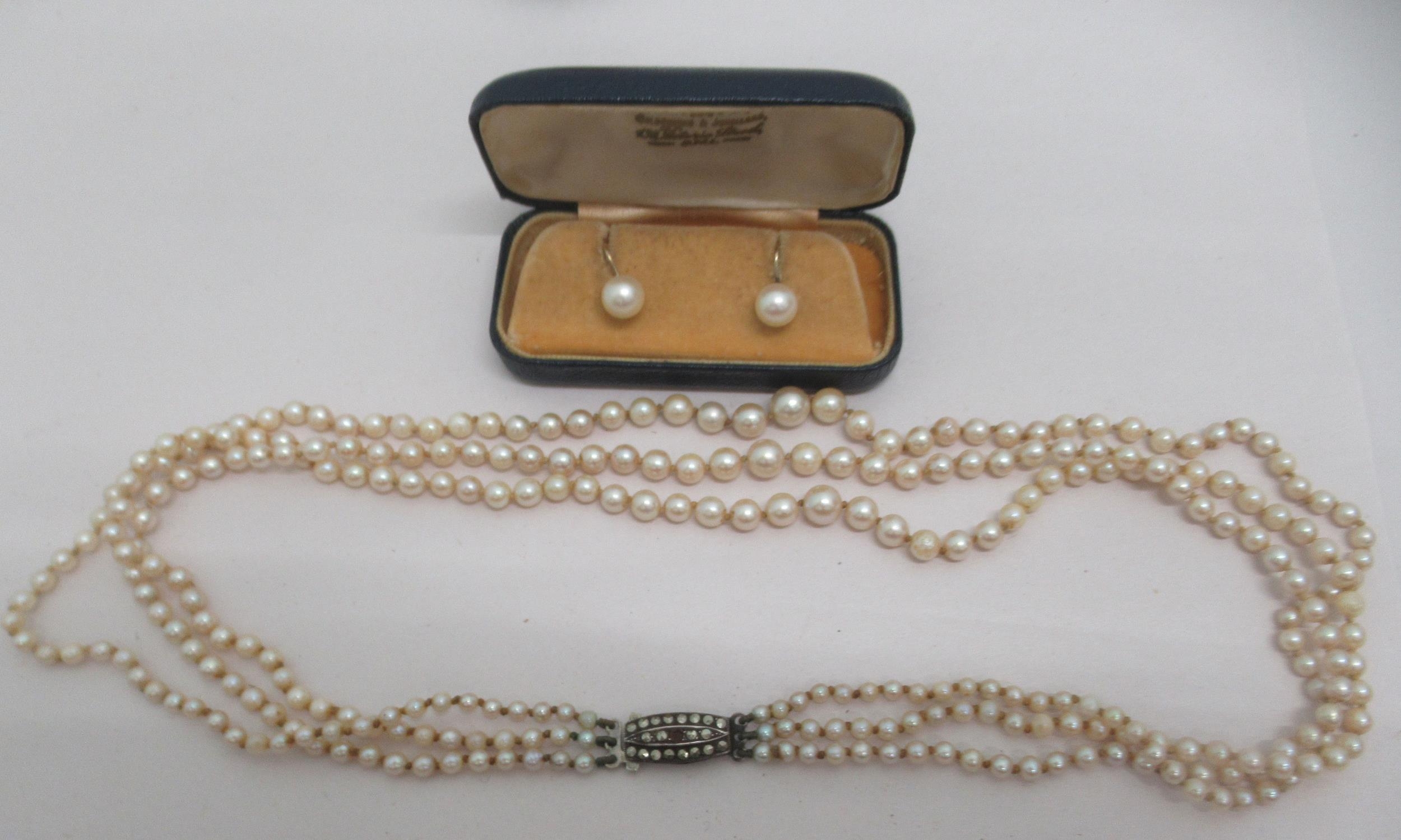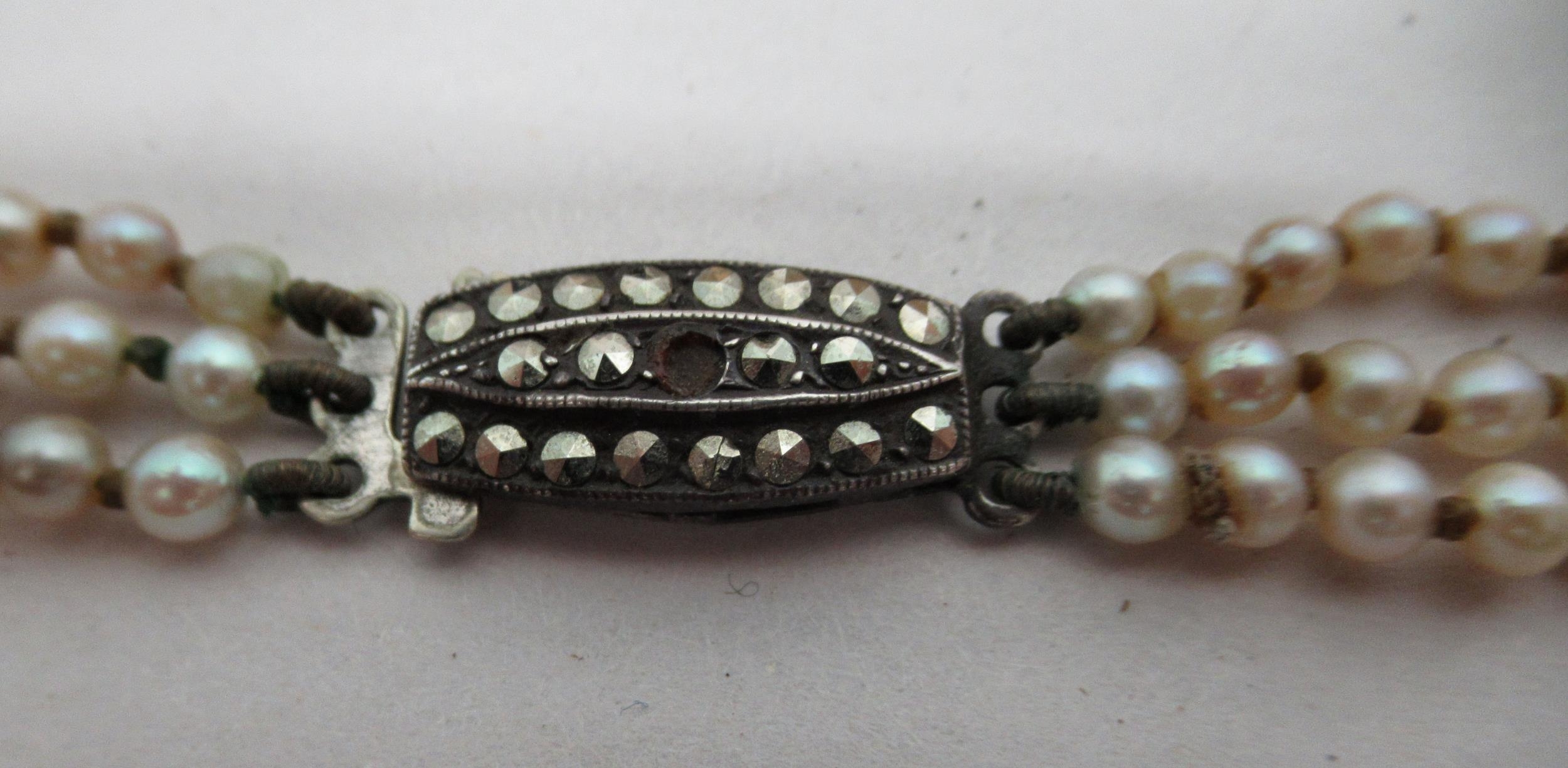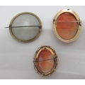 Items of personal ornament: to include a 9ct gold framed cameo brooch; and a triple strand pearl necklace