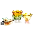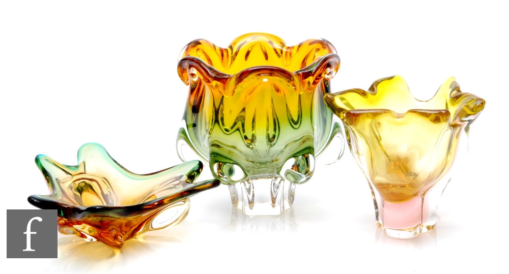 Josef Hospodka - Chribska - A 1960s glass vase of pulled form with scalloped rim, in graduated amber to green, height 18cm, together with a similar smaller vase and a dish. (3)