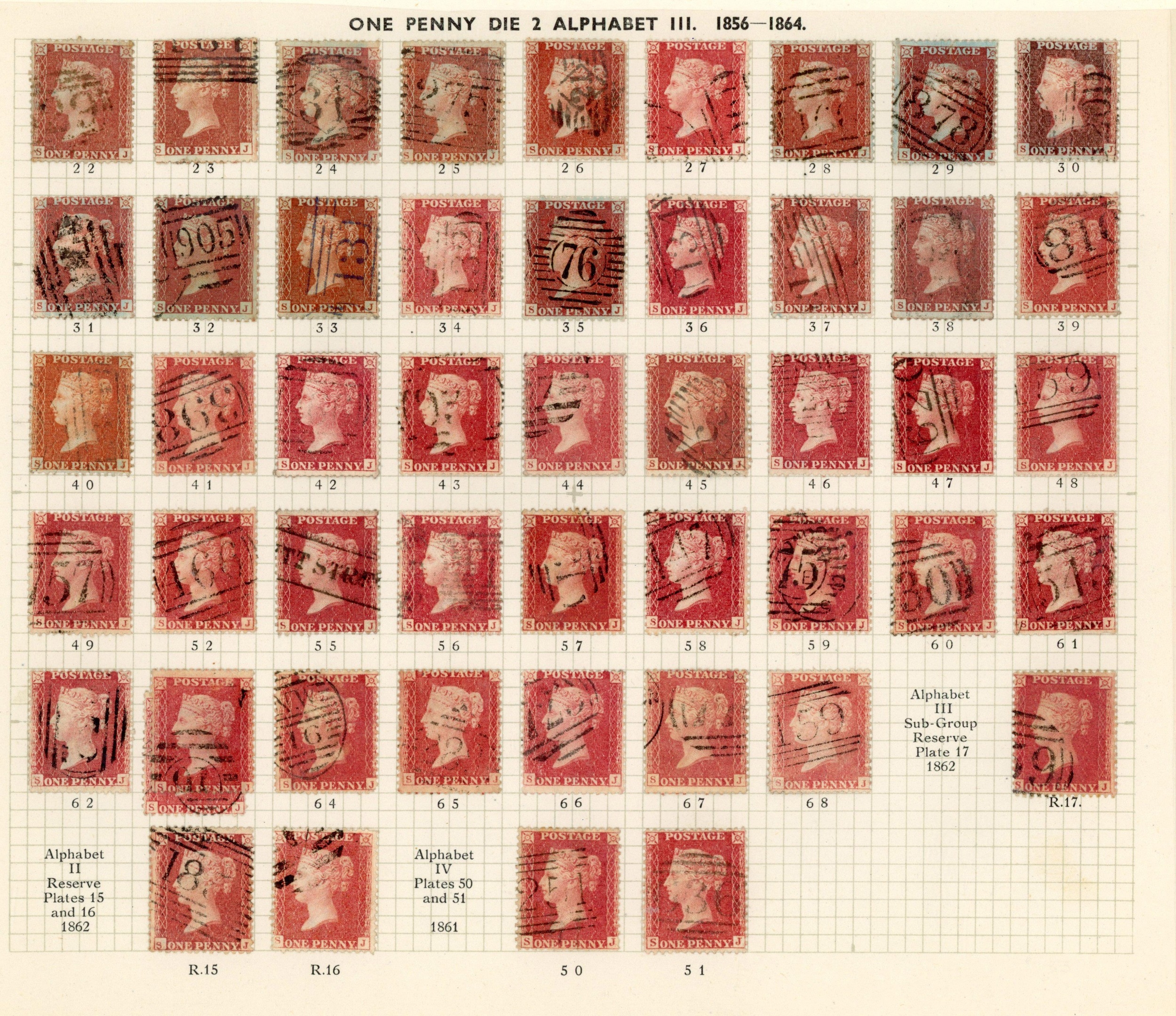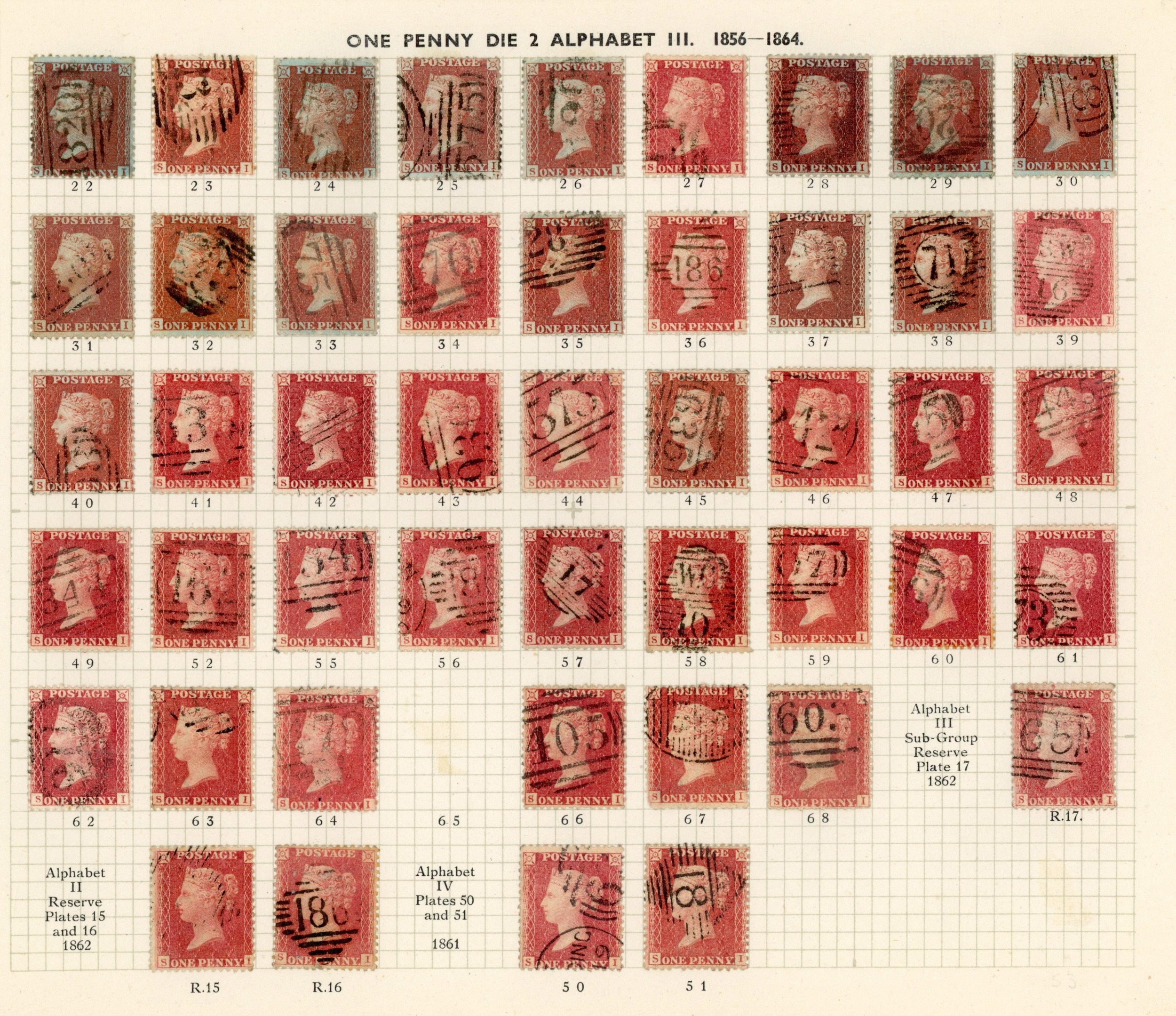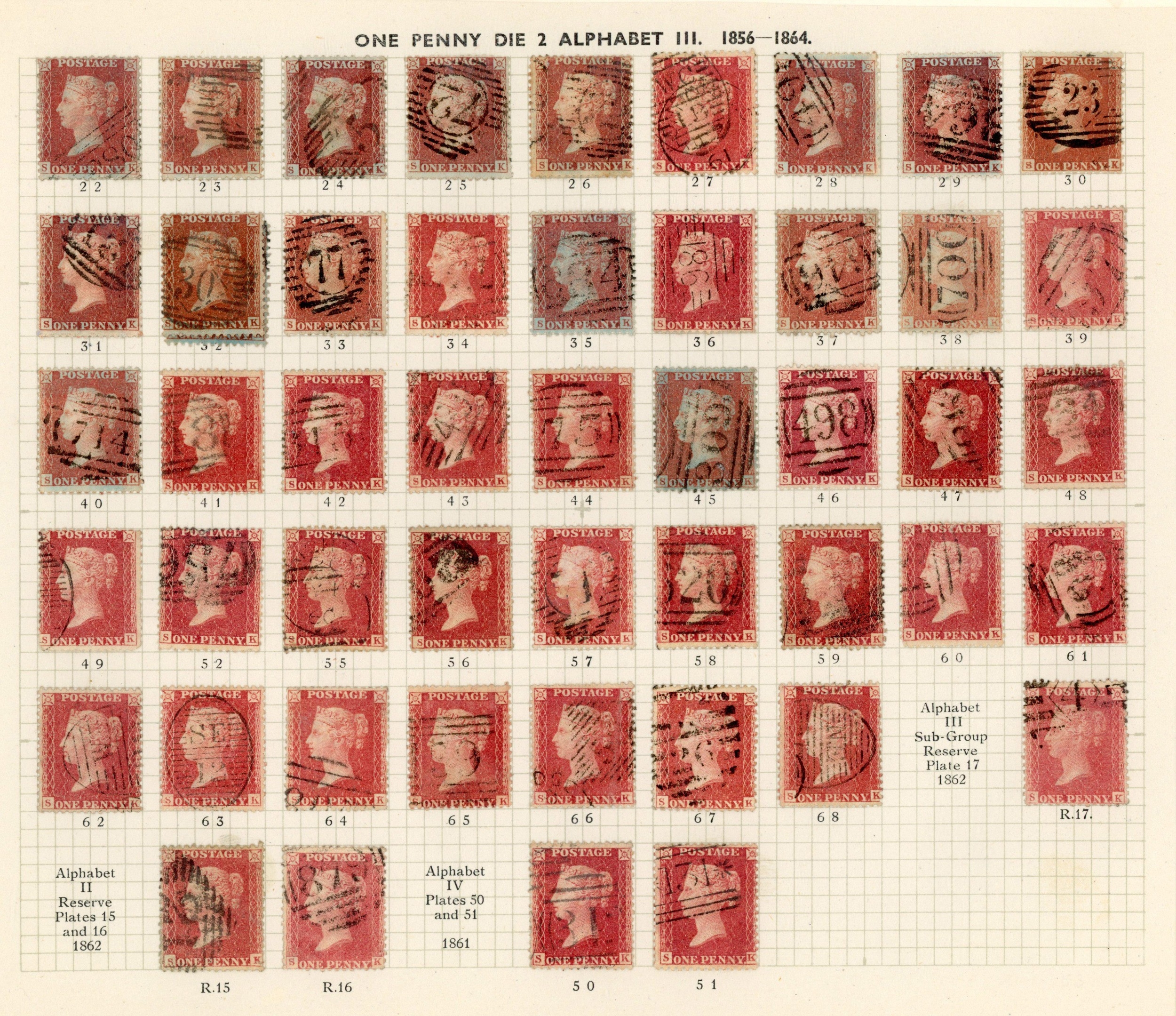 GB 1856-64 1d reds from Plates 22 - R17, the S Row