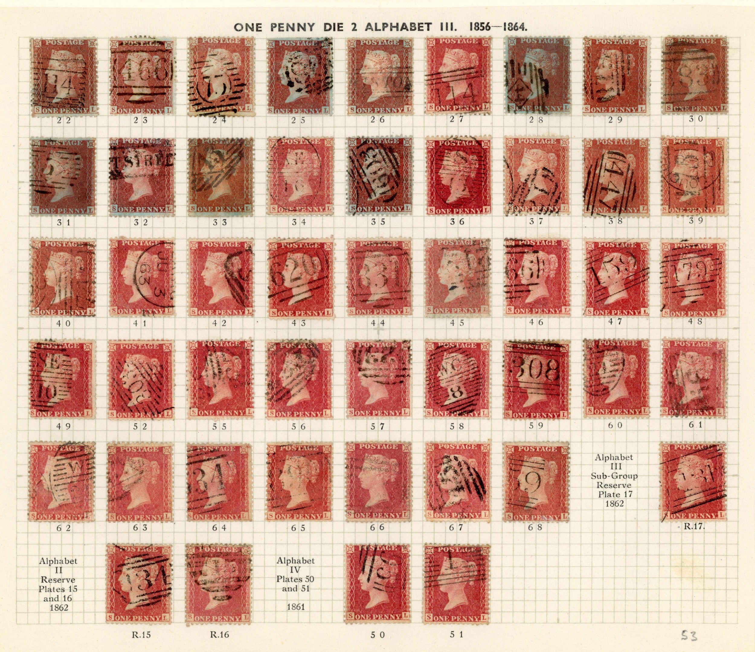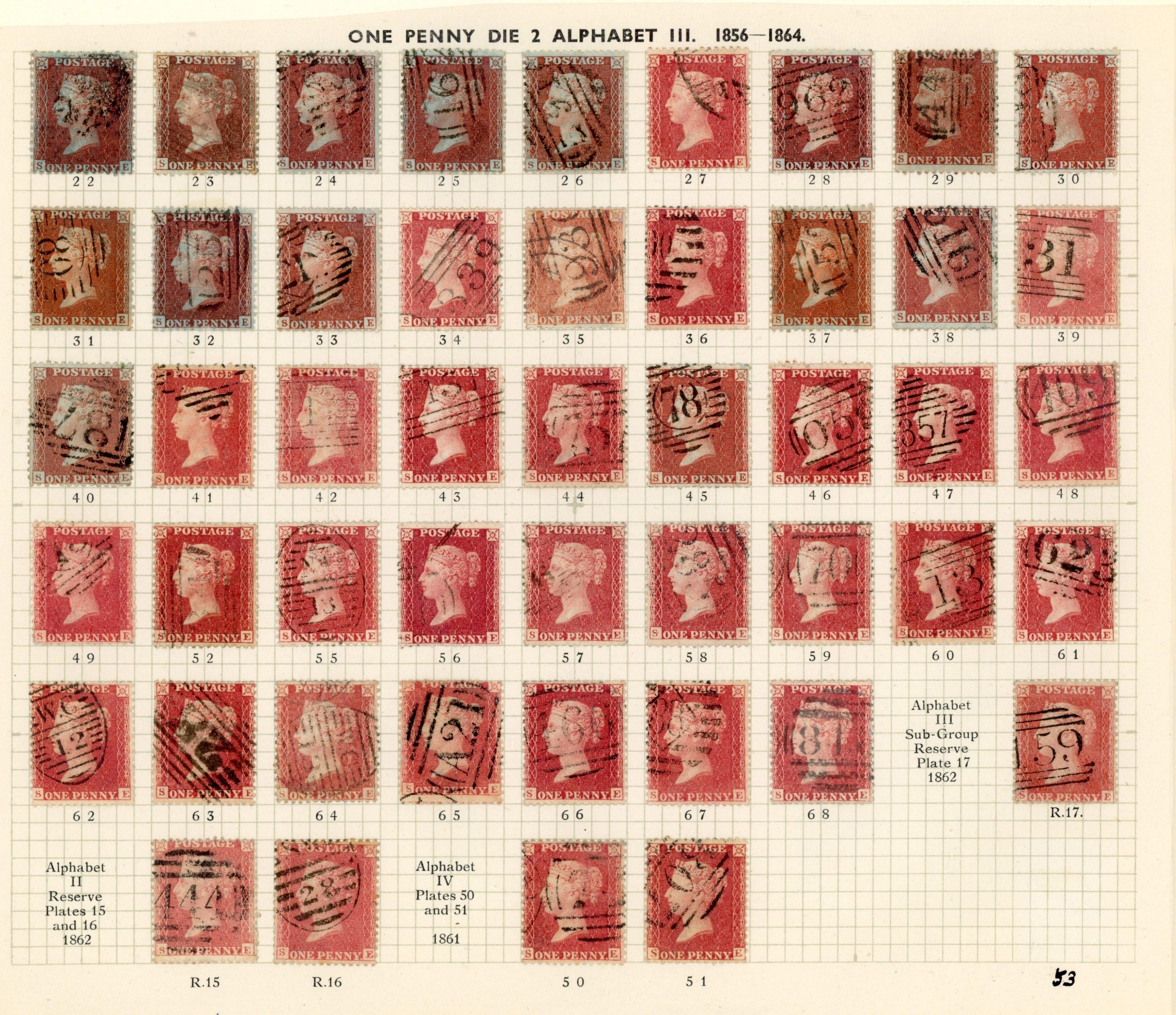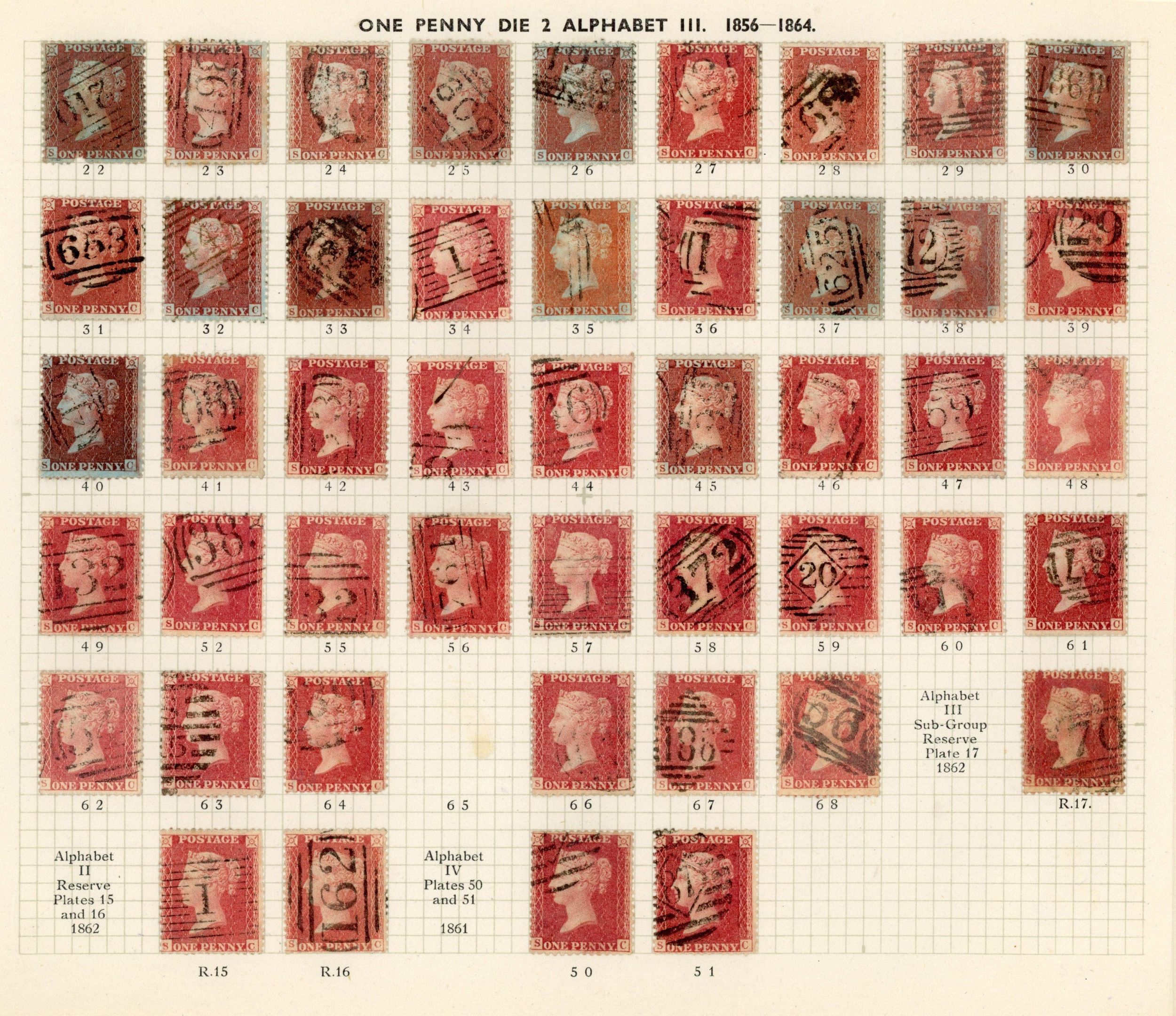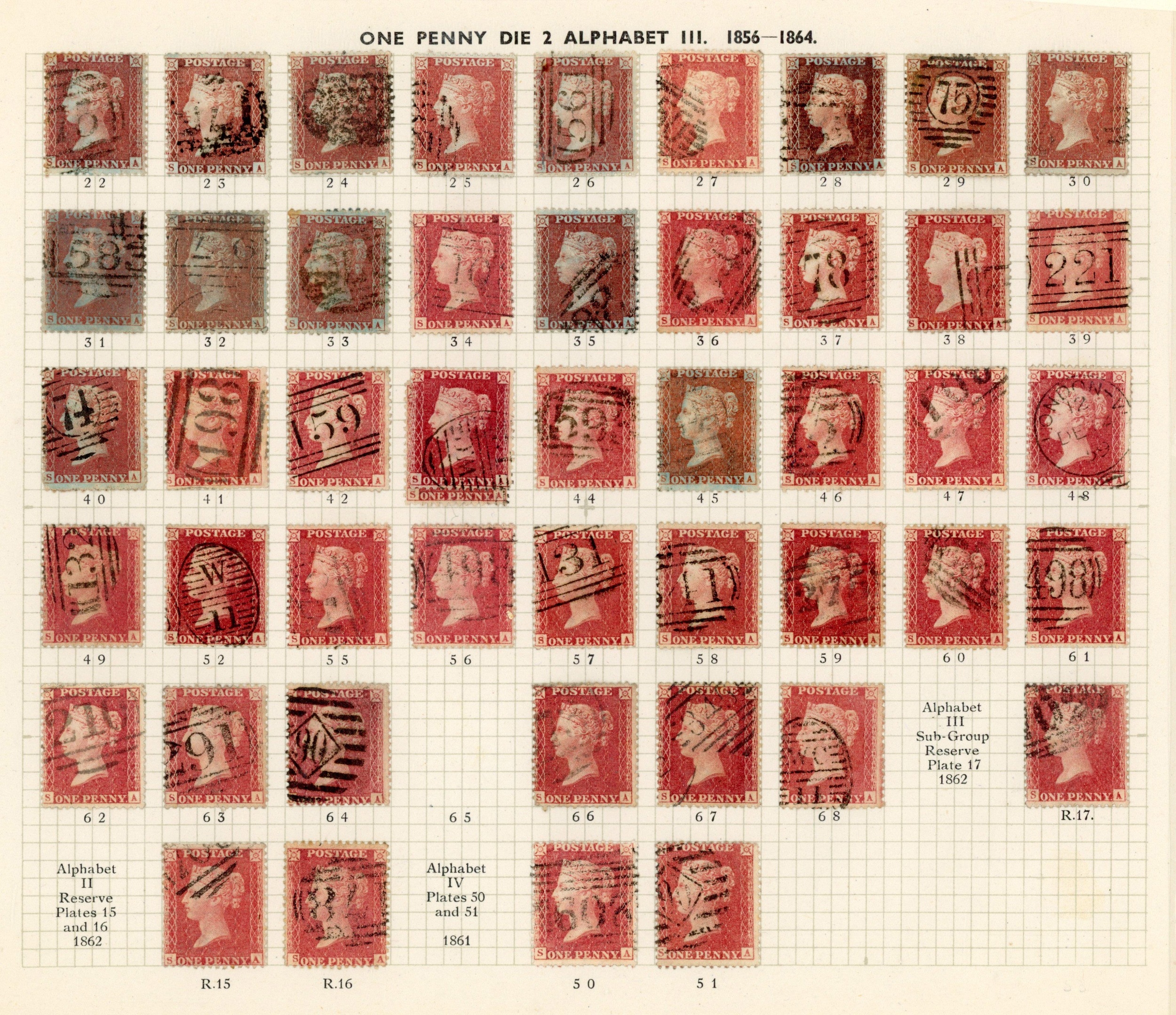GB 1856-64 1d reds from Plates 22 - R17, the S Row