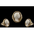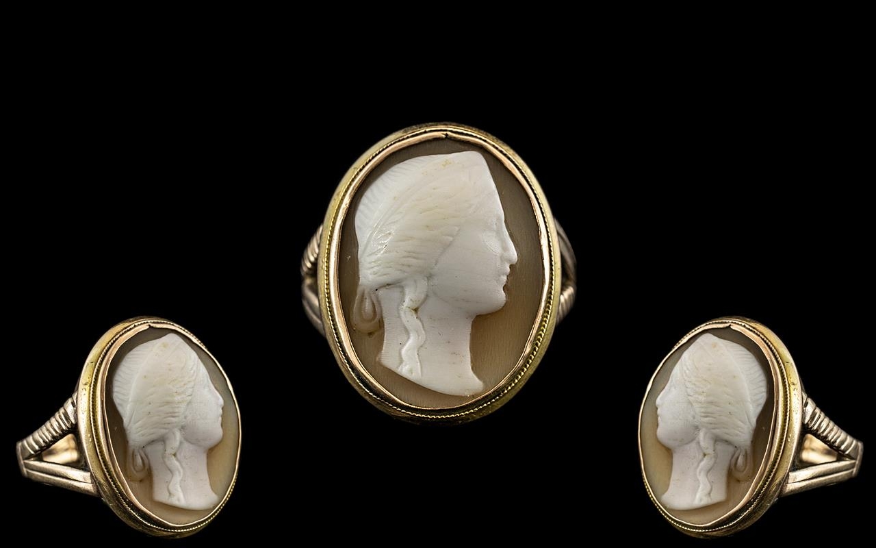 Antique Period - 9ct Gold Well Carved Cameo Ring, Depicting the Portrait of a Young Woman. Marked 9ct to Interior of Shank. Ring Size S. No Date Letter, Excellent Condition. 7.3 grams. Provenance - From a Ladies Private Collection.