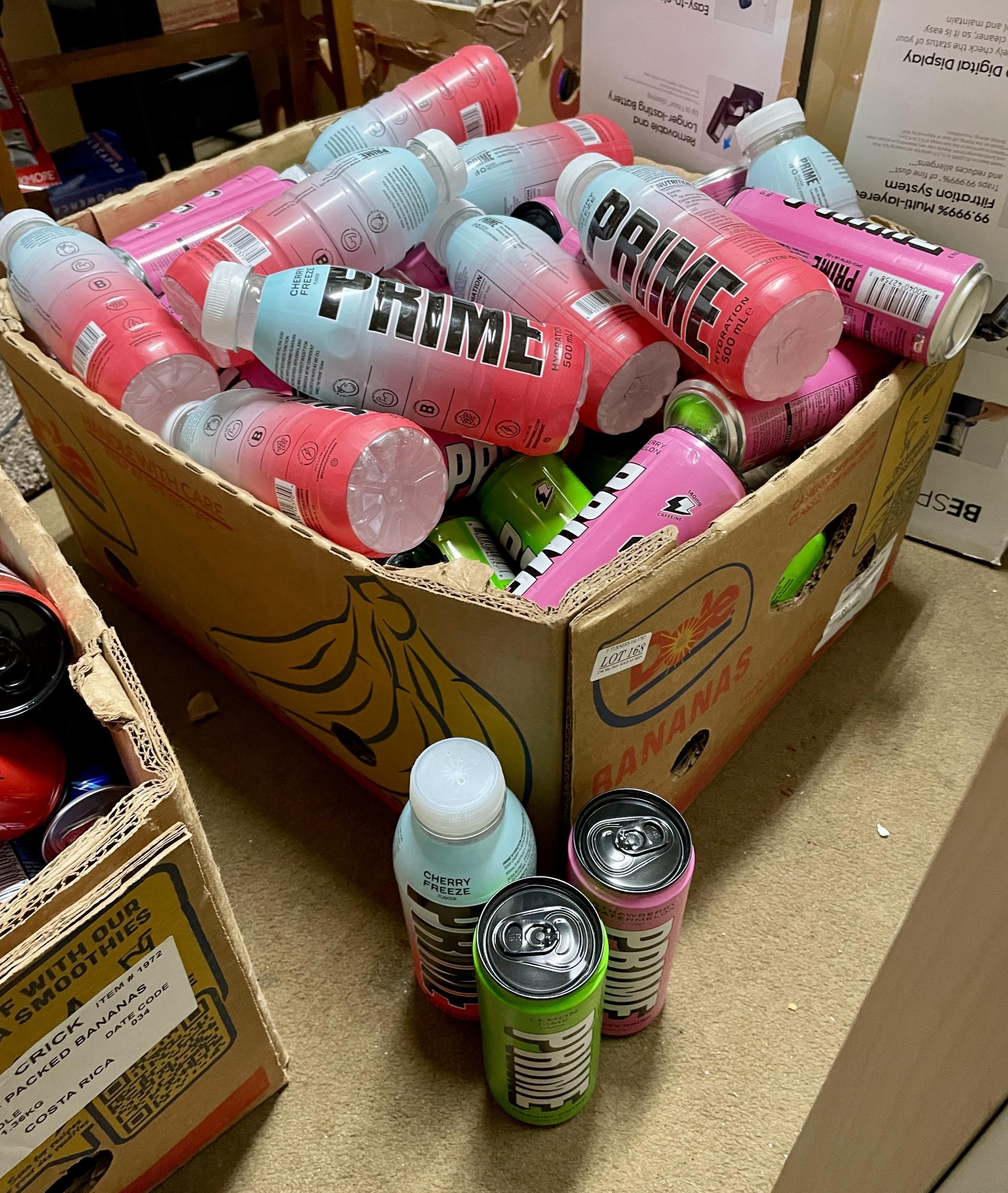LARGE BOX OF PRIME ENERGY AND HYDRATION DRINKS, INCL, CHERRY FREEZE, STRAWBERRY ETC....