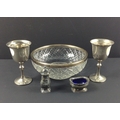 A small collection of EPNS to include 2 goblets inscribed "1977: The Queen's Silver Jubilee", a part cruet set of salt and a mustard dish with blue glass liner 6cm long, and a cut glass bowl 19cm diameter