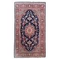 The deep indigo field of semi naturalistic vines. Centred by a flower head medallion. Framed by spandrels and terracotta borders. Flanked by carnation guard stripes.