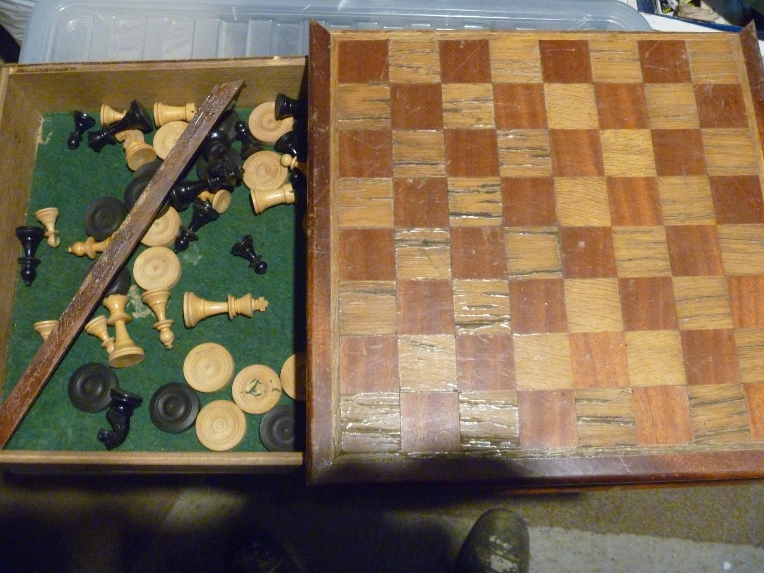 CHESS SET UNCHECKED WITH WOODEN BOX NEEDING SOME REPAIRS