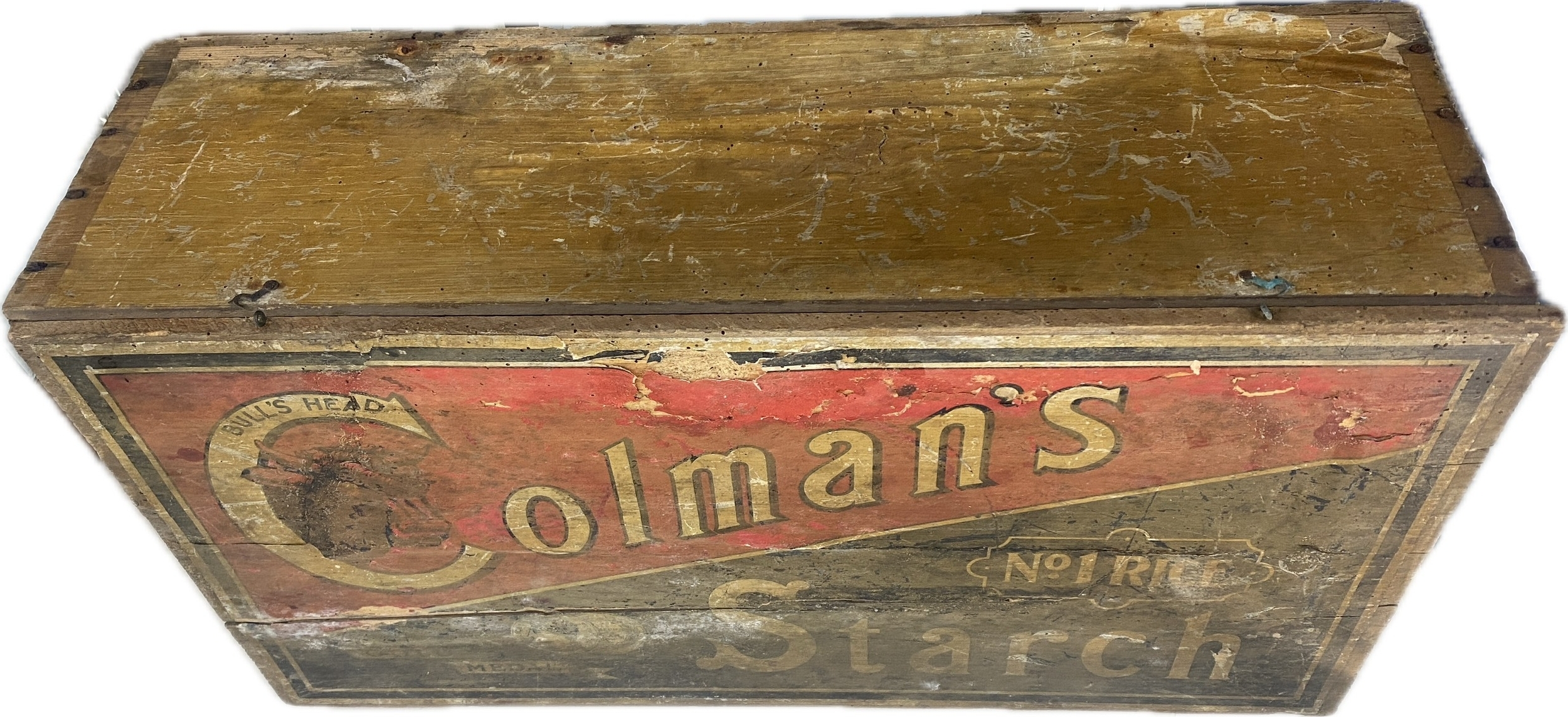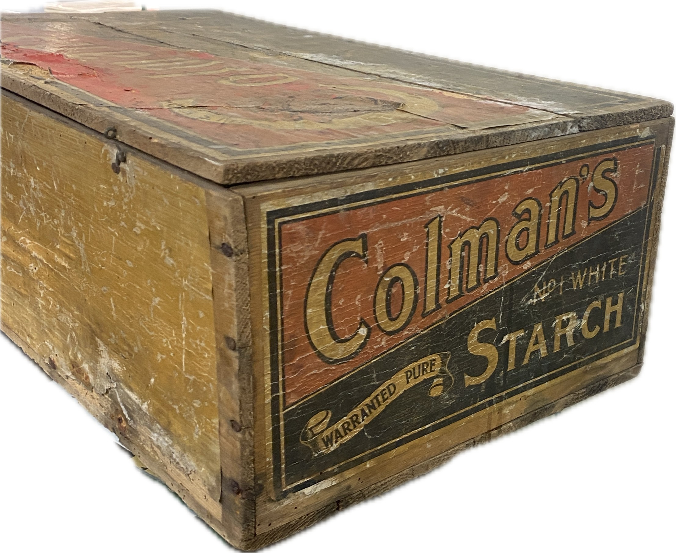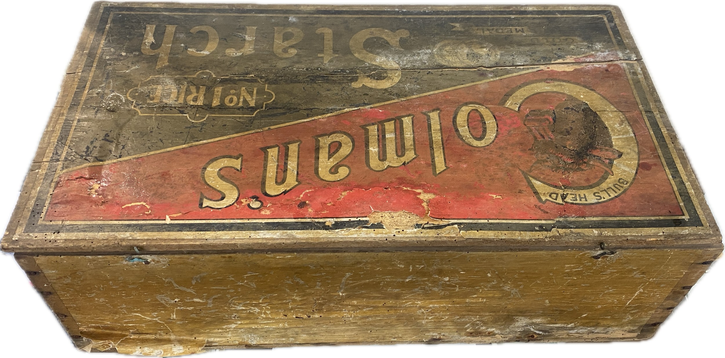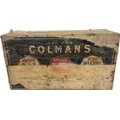 Vintage Colman's Starch wooden advertising display box with original paper labels measures approximately: 23 inches wide x 7 tall and 12 deep