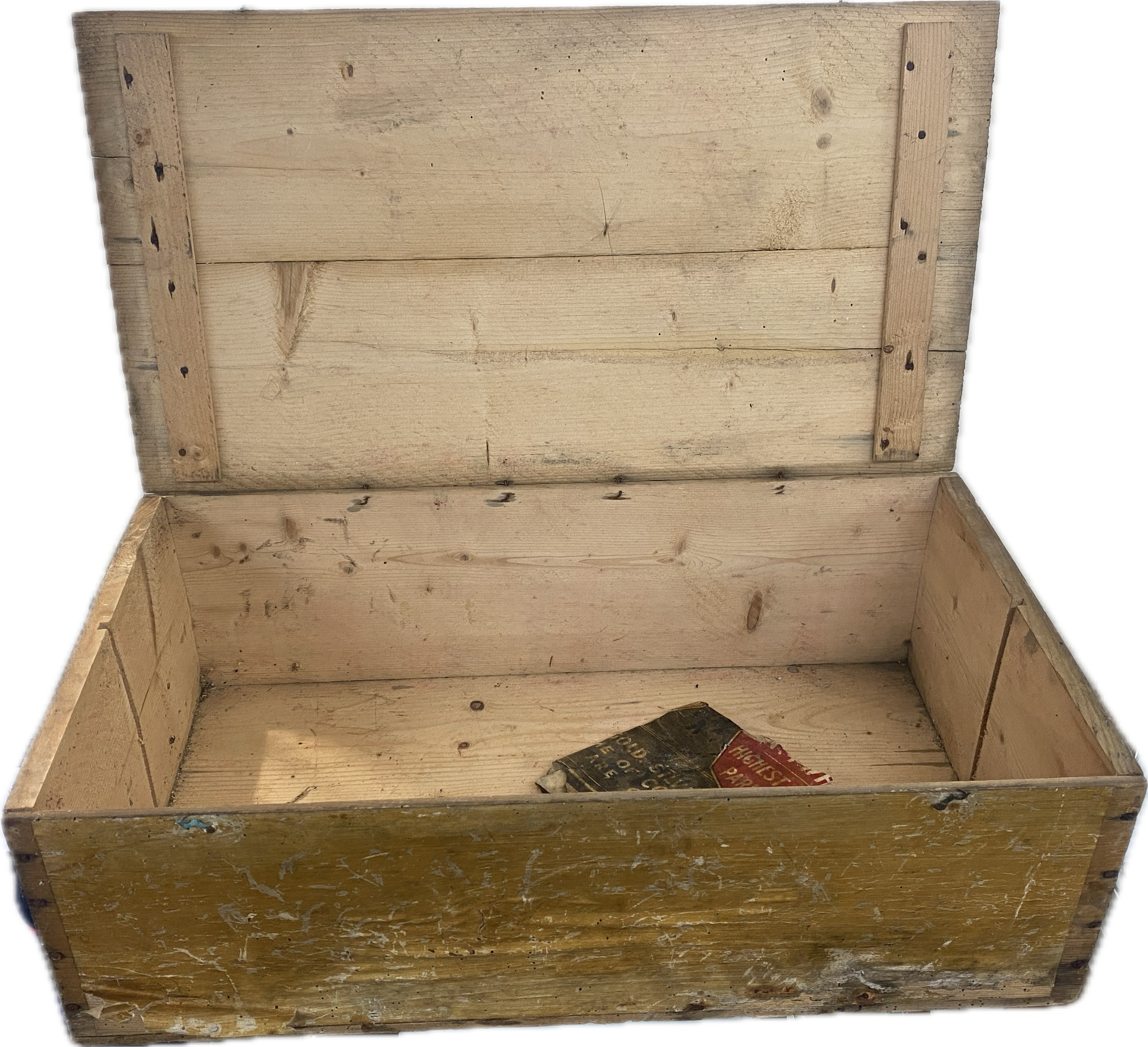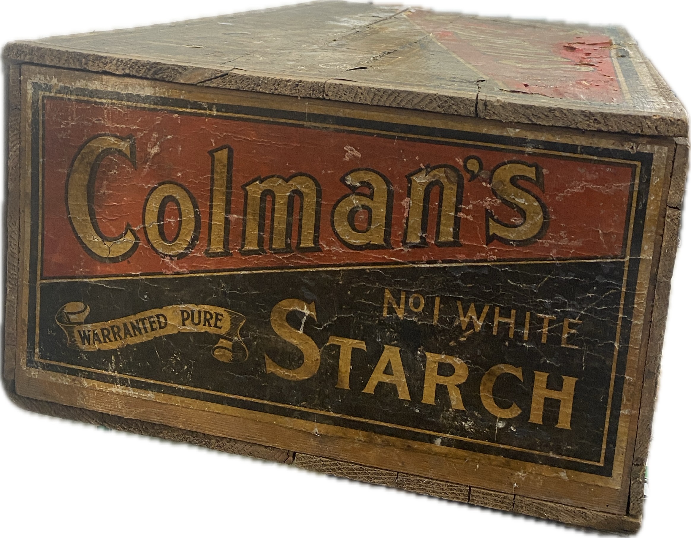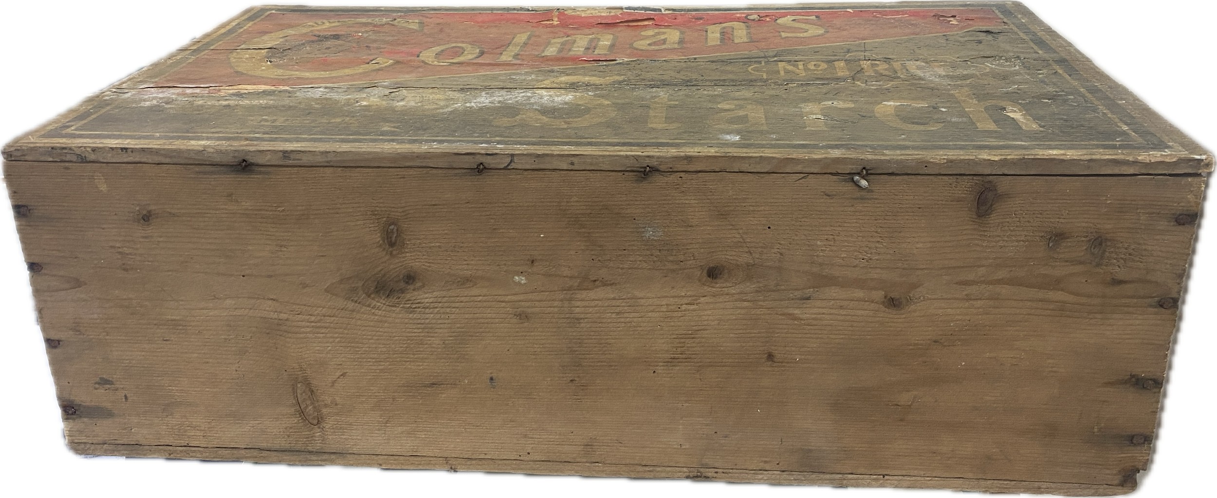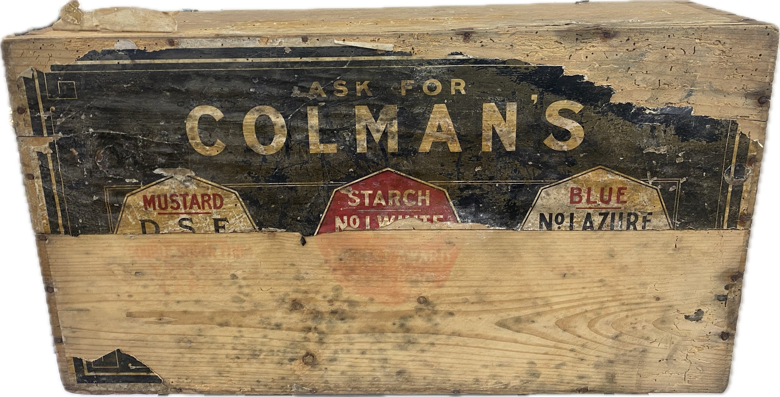 Vintage Colman's Starch wooden advertising display box with original paper labels measures approximately: 23 inches wide x 7 tall and 12 deep