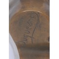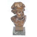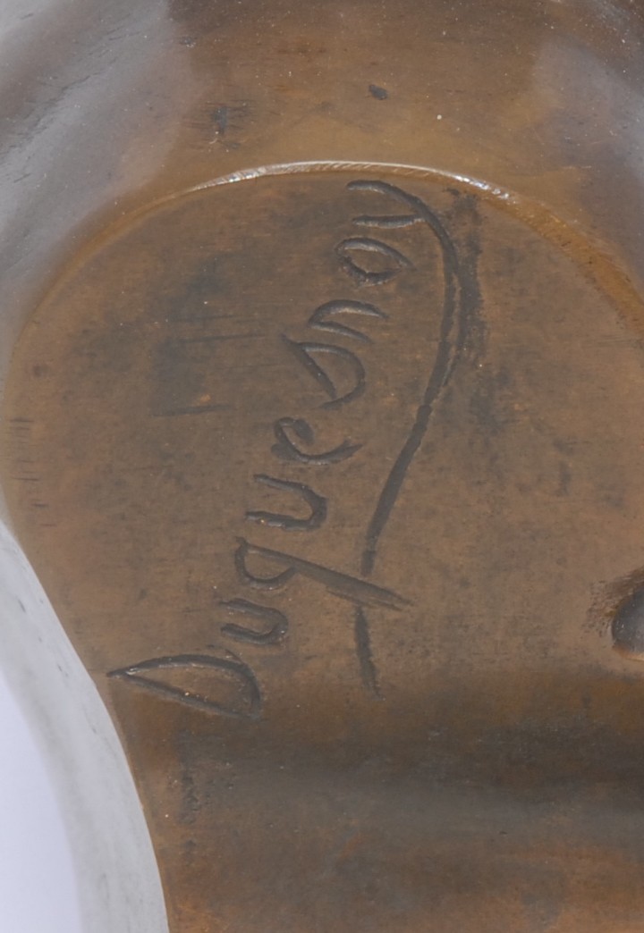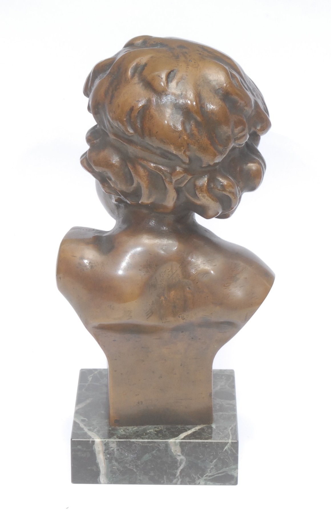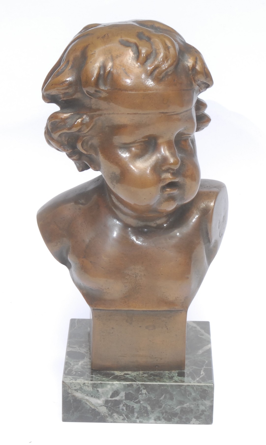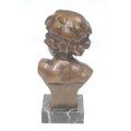 After François Duquesnoy (1597 – 1643), a dark patinated bronze bust of a full faced putto, square veined black marble base, 24cm, signed in the maquette, late 19th century