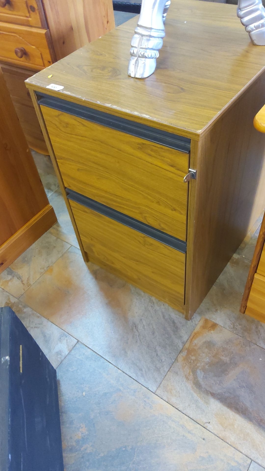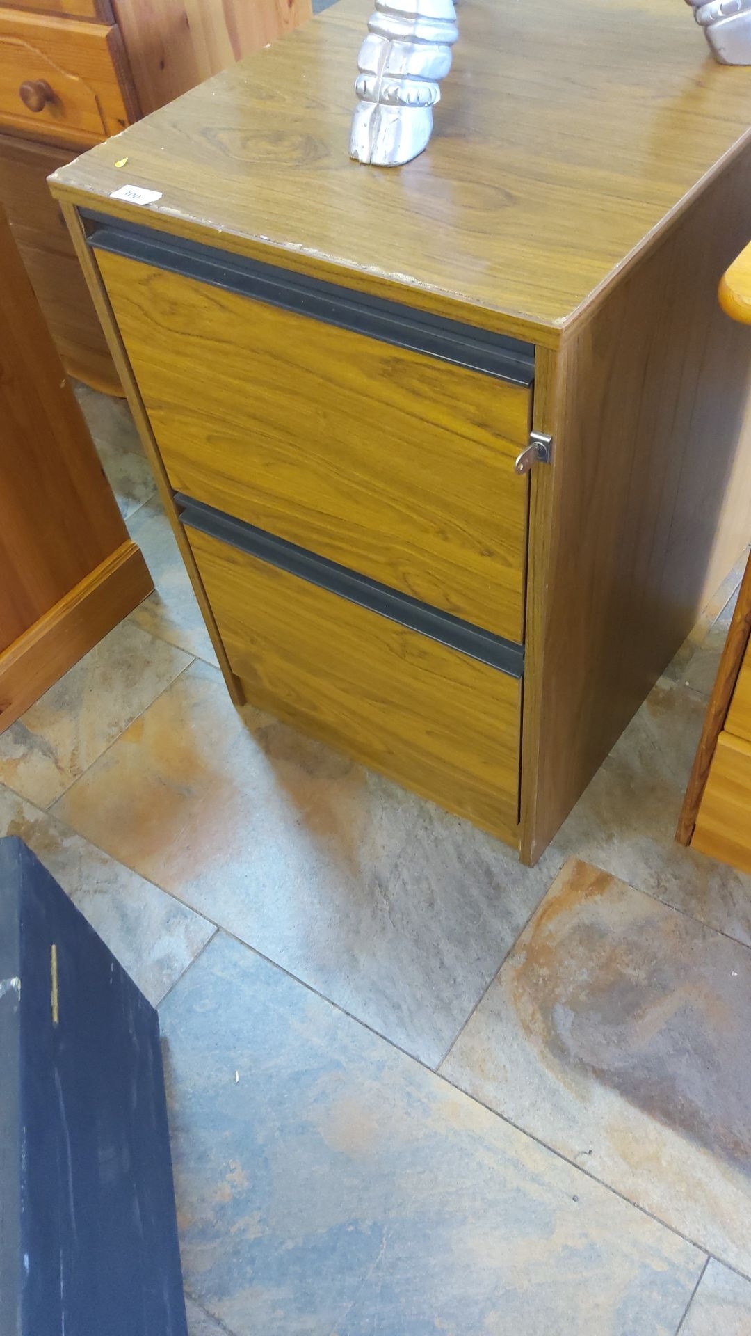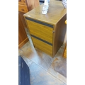Wooden filing cabinet with two drawers and metal handles, featuring a wood grain finish.
