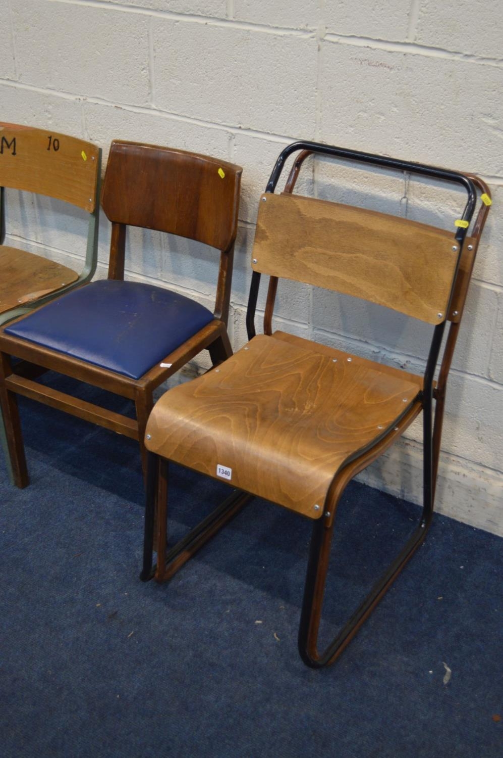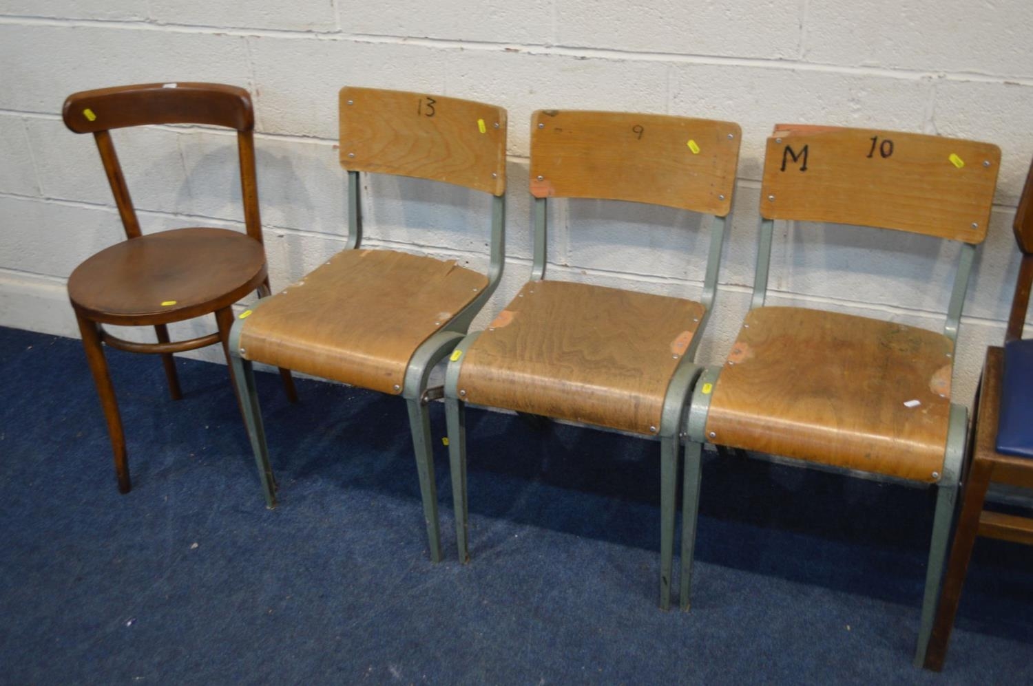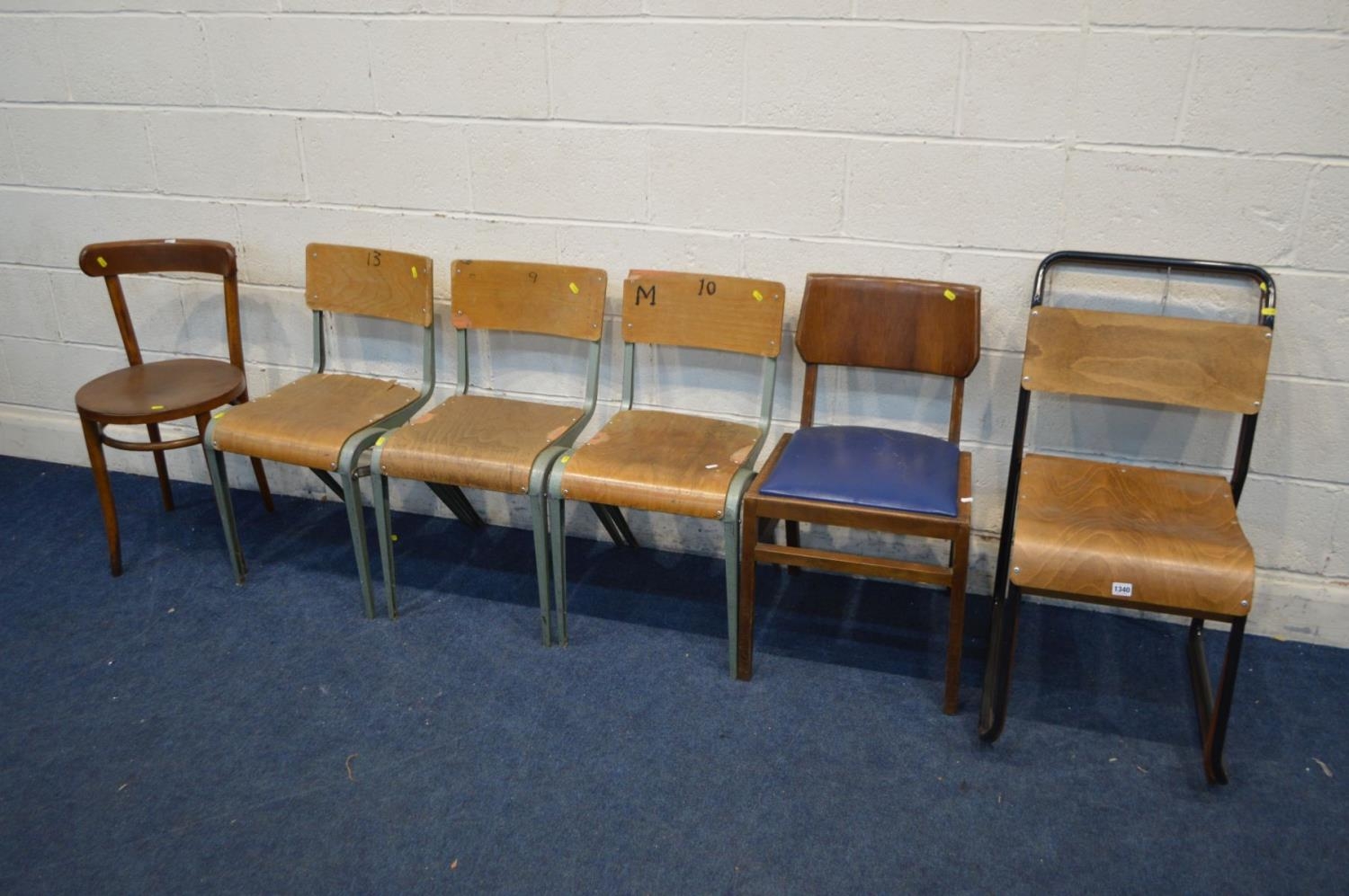 A SET OF THREE INDUSTRIAL CHAIRS, with plywood seat and back (s.d.), two metal framed chairs and two other chairs (7)