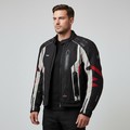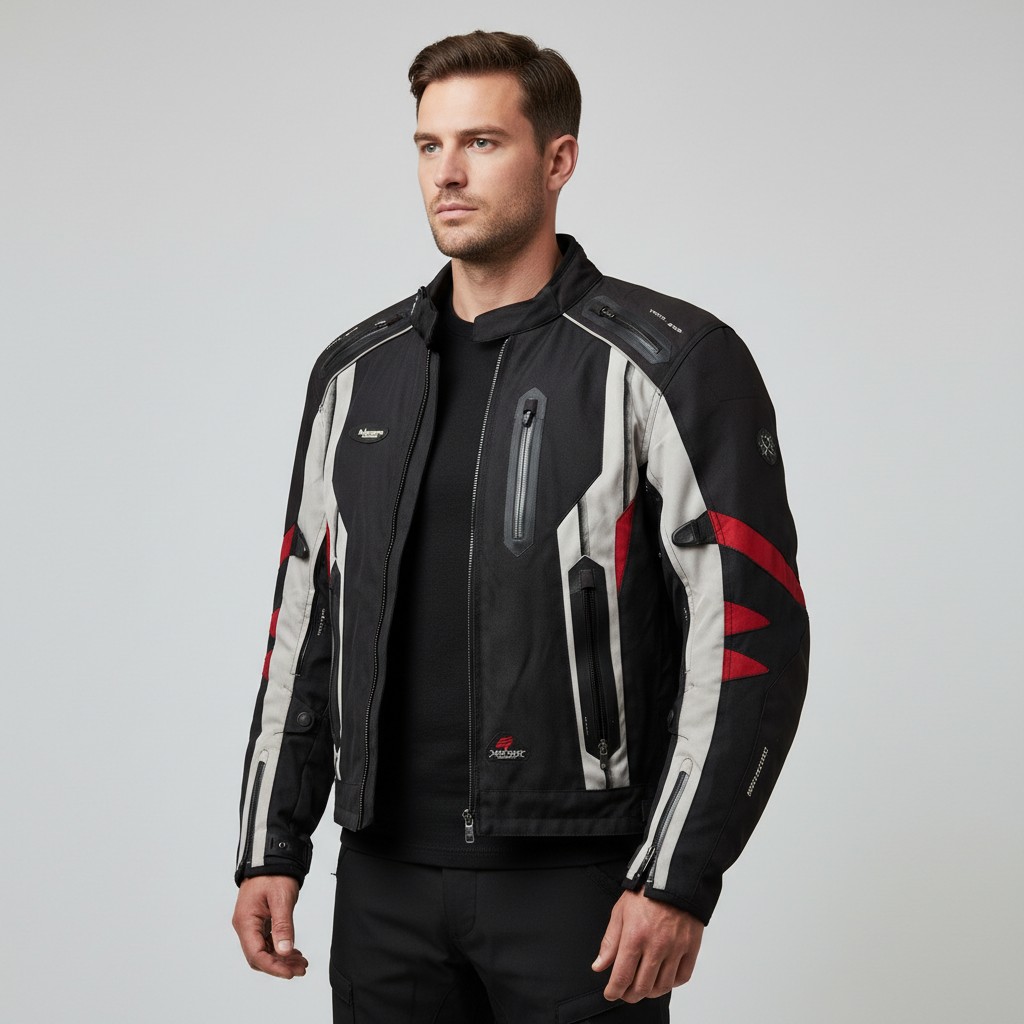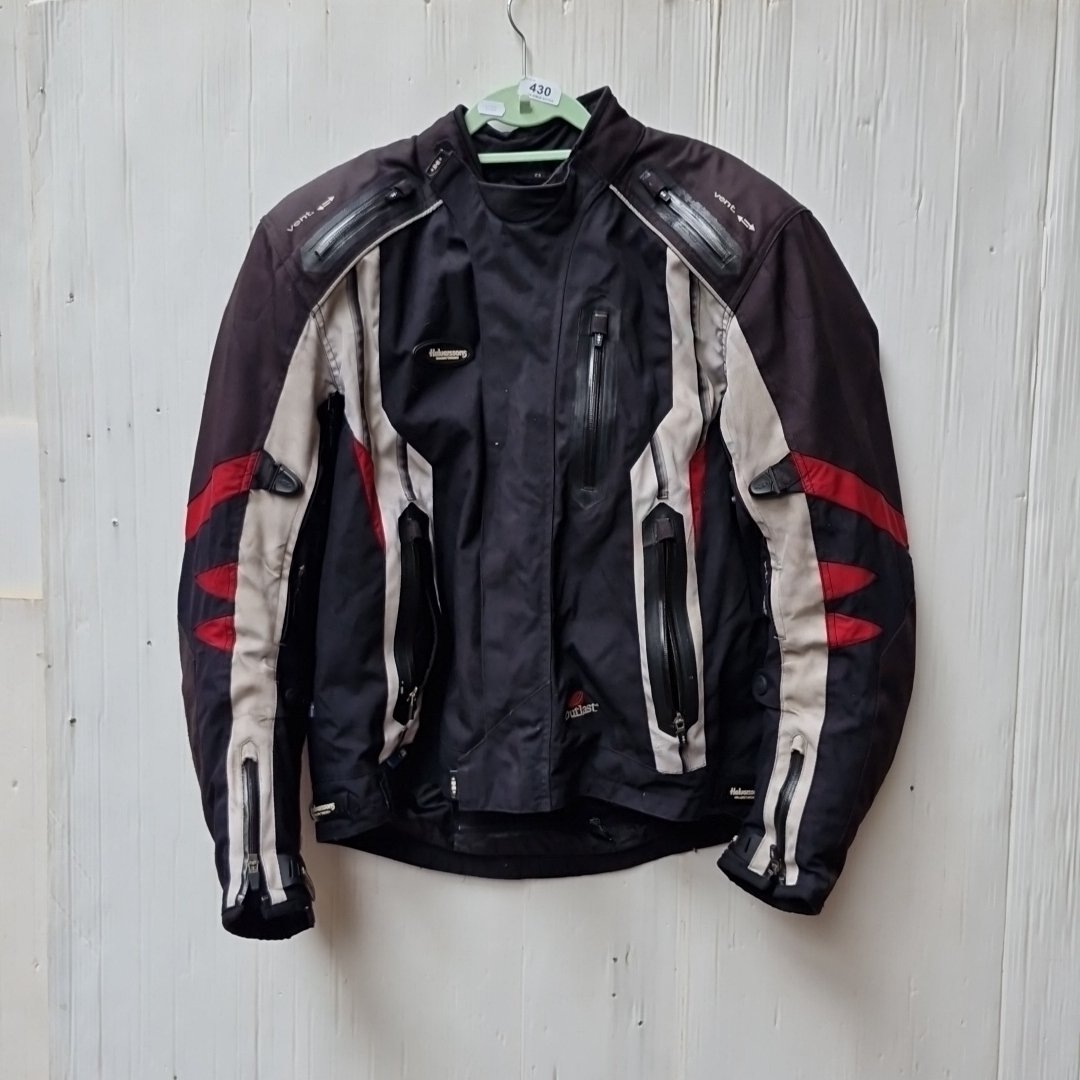 A Halvarssons Malung, Sweden motorcycle jacket in black textile with grey panels and red accents, featuring multiple zipped pockets, adjustable venting, and Outlast lining; labelled size 54. Please note, the image of the modelled item was created by a new imaging/ staging software called showiton.ai. Upload a simple image of a piece of jewellery and the software stages it on a model for you. Paste the URL (showiton.ai) into your browser and try it for free. It’s a very simple, user-friendly platform.