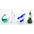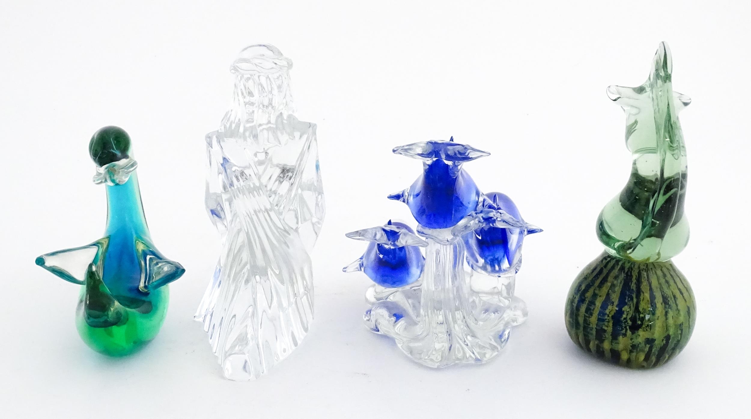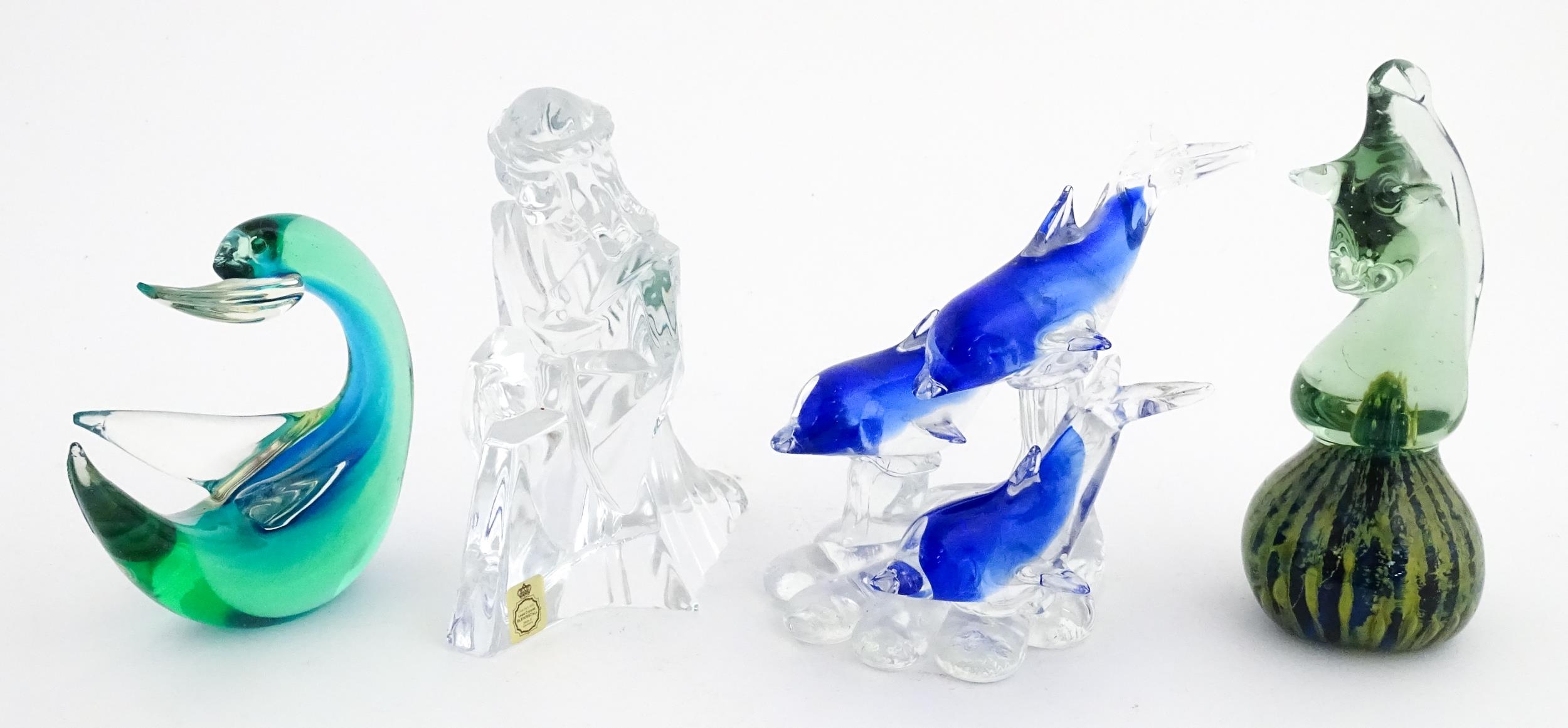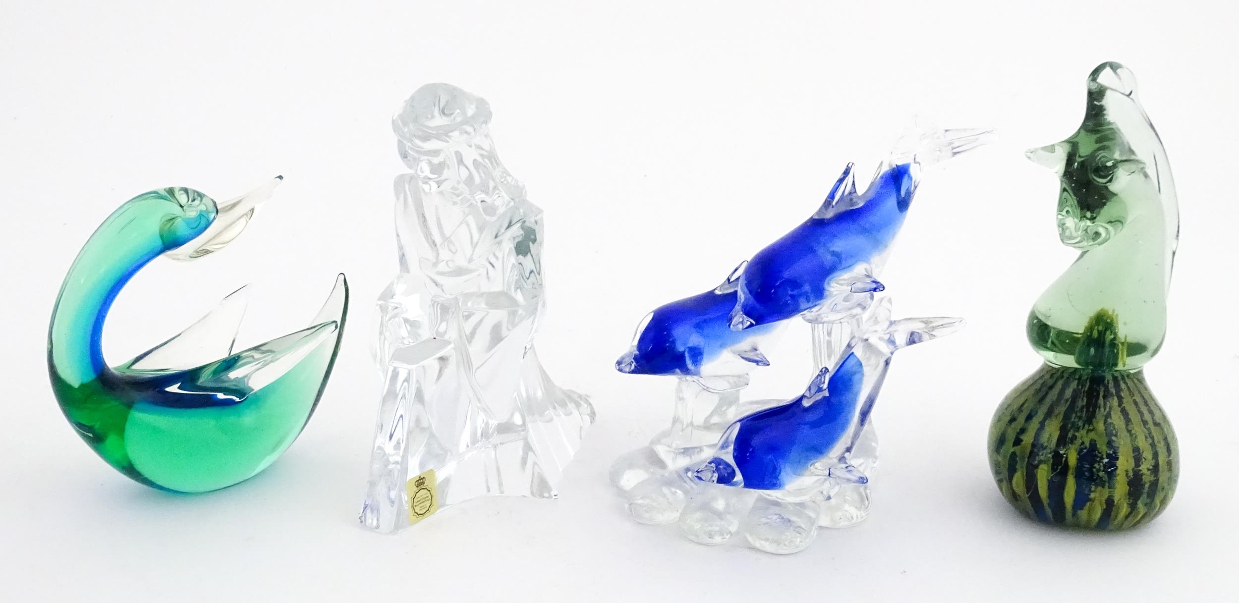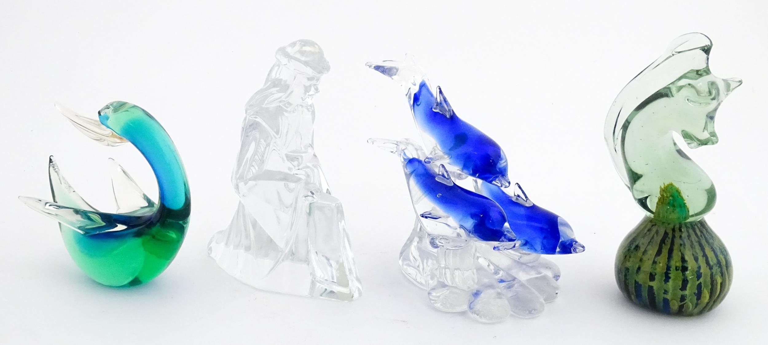 Four assorted glass paperweights / models to include a Mdina glass seahorse paperweight, unsigned, a German Bleikristall model of a figure, a dolphin figure group and a Murano glass model of a bird. Tallest approx 7" high (4)