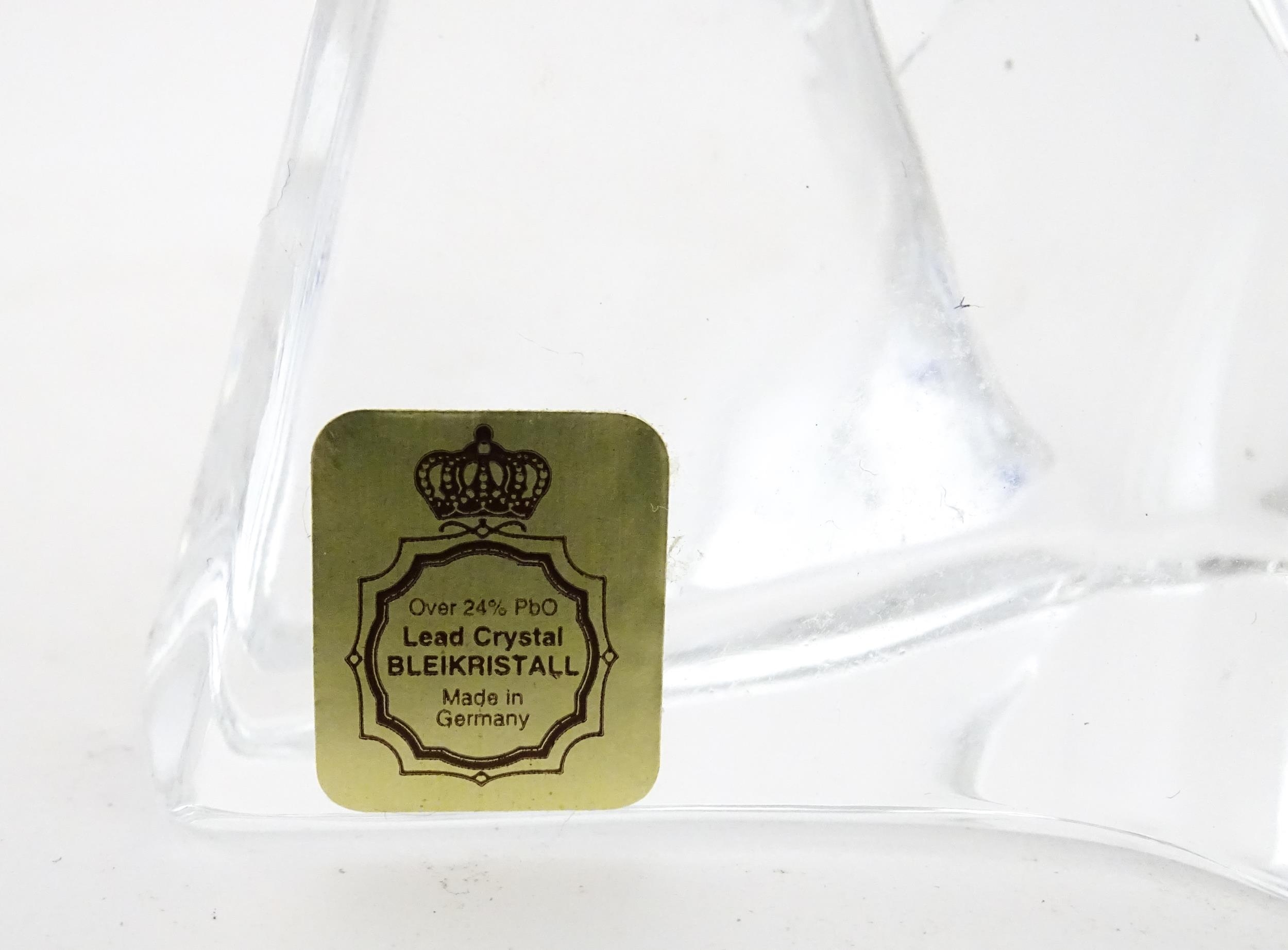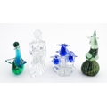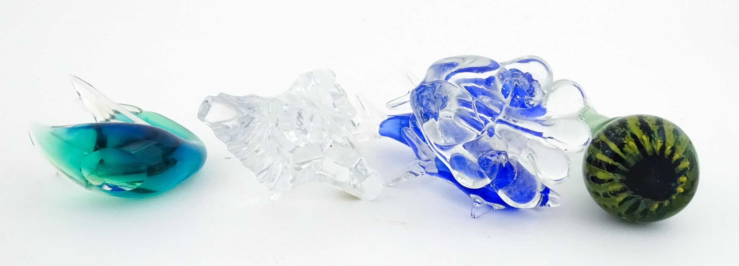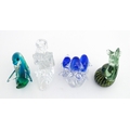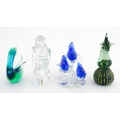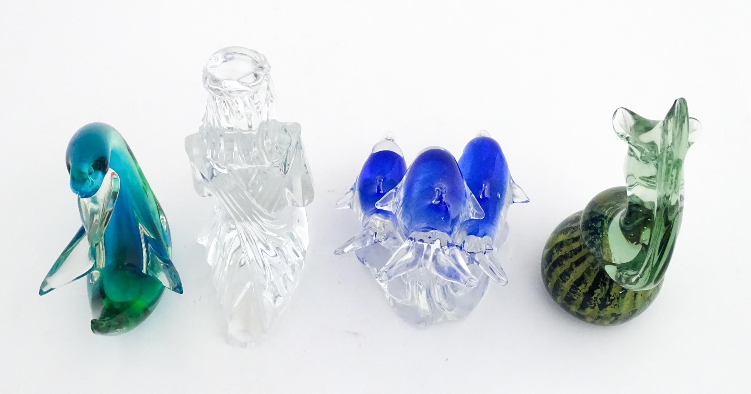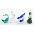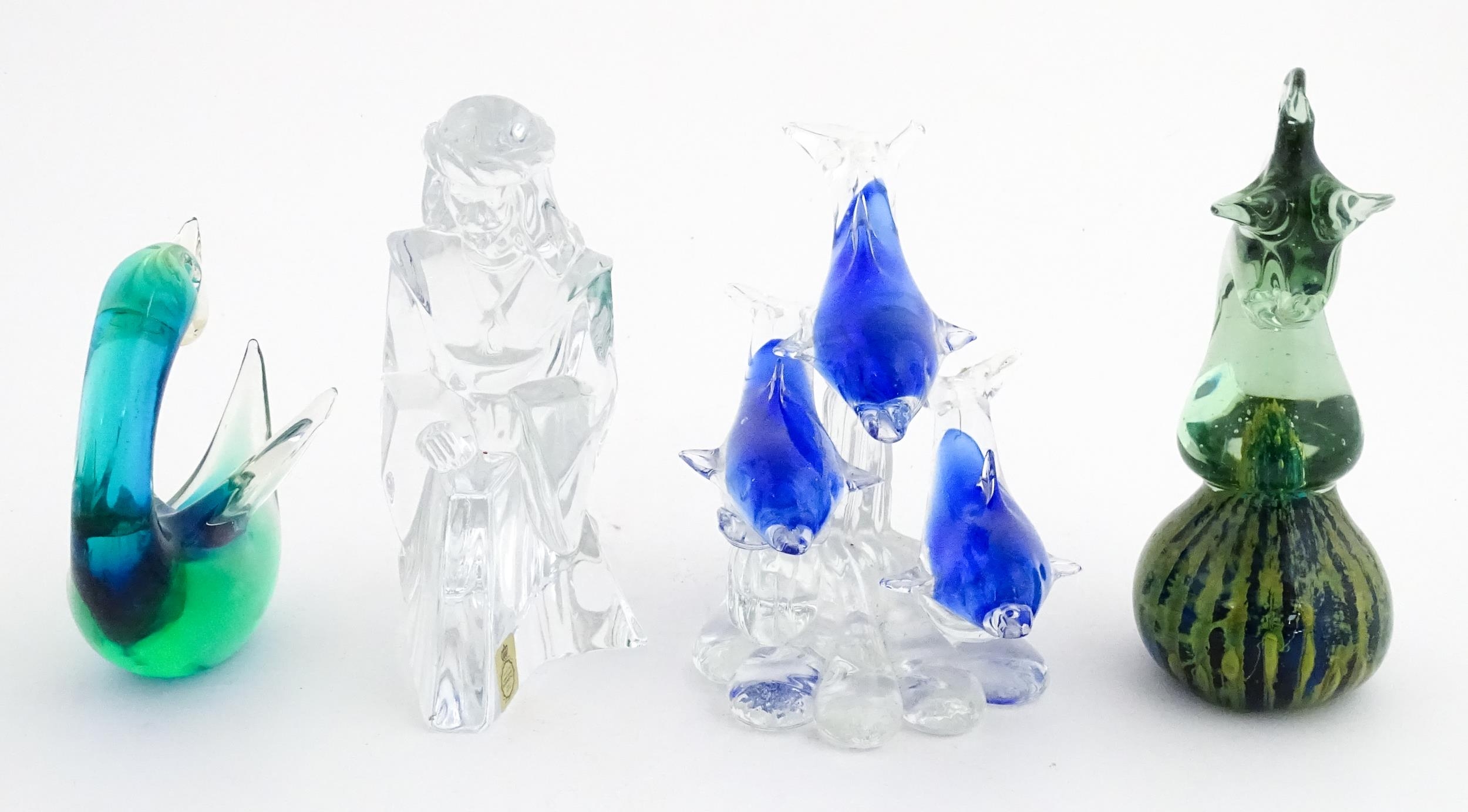 Four assorted glass paperweights / models to include a Mdina glass seahorse paperweight, unsigned, a German Bleikristall model of a figure, a dolphin figure group and a Murano glass model of a bird. Tallest approx 7" high (4)